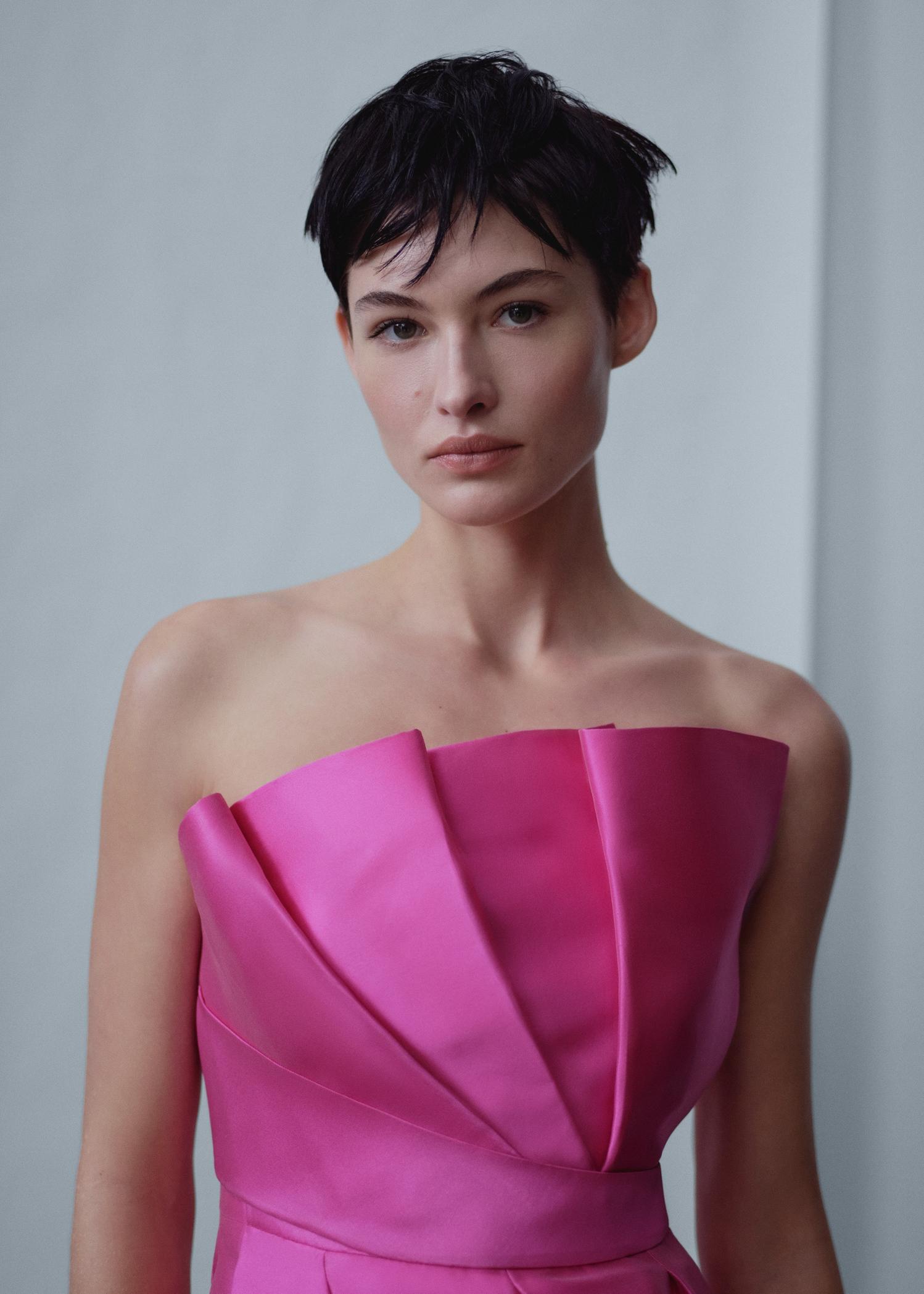 The elegant pink dress is reinvented in its most groundbreaking version. Its strapless design and volume tables make it the most original option for the most important events this season.. Silk mix. Satin. Patterned design. Fitted design. Short design. Strapless. Sleeveless. Zip fastening on the back section. Made in Morocco. We recommend steaming the garment as little as possible, since it is distributed ironed. Side length 25.98 in. Back length 24.69 in. Capsule: a collection of limited-edition garments, made with the best fabrics and the greatest care in patternmaking, to achieve the best finishes. This exclusive collection is designed for the most special events and occasions.