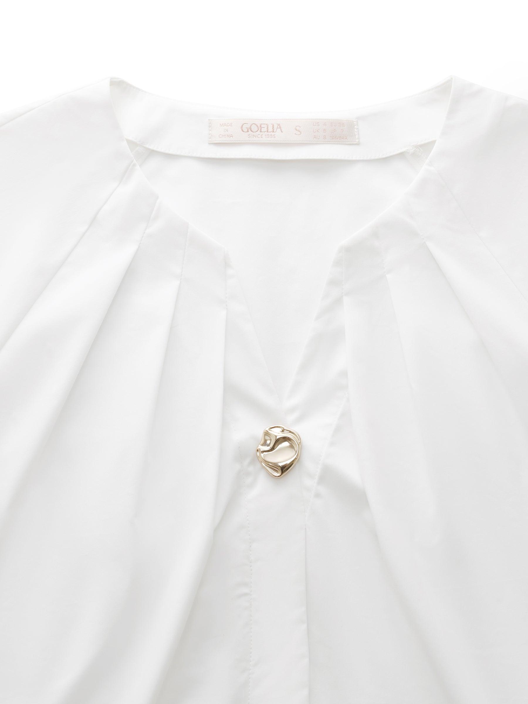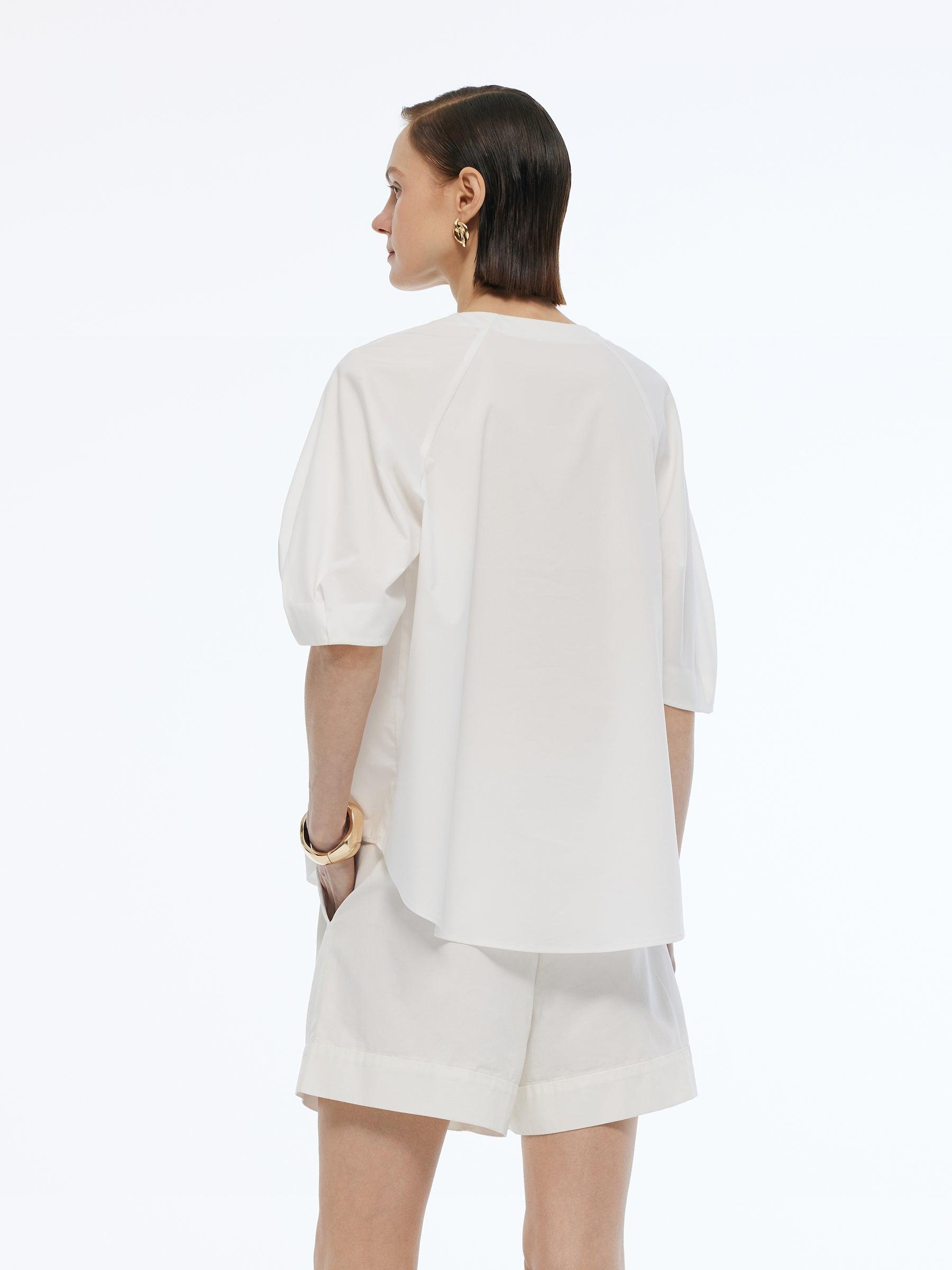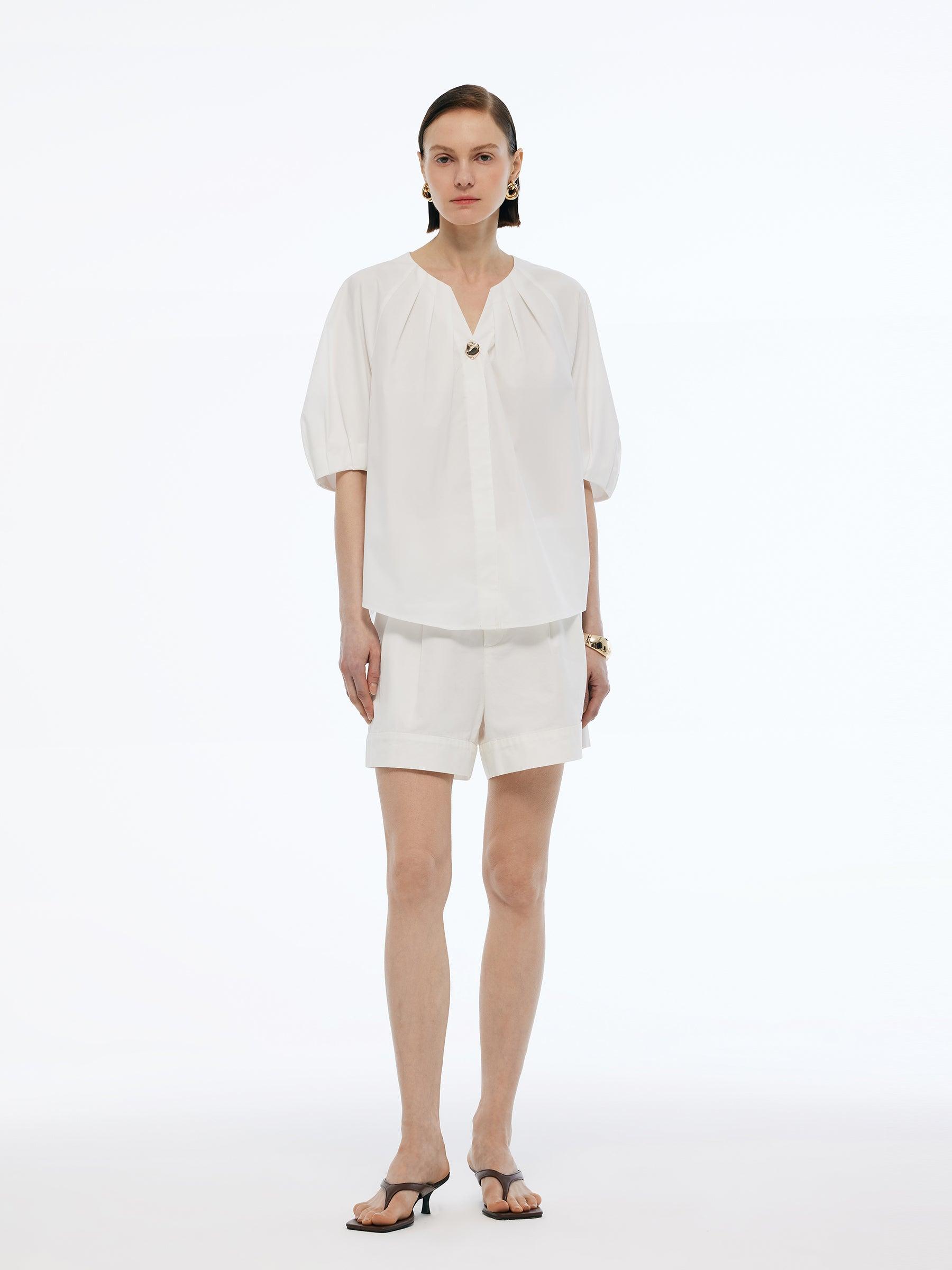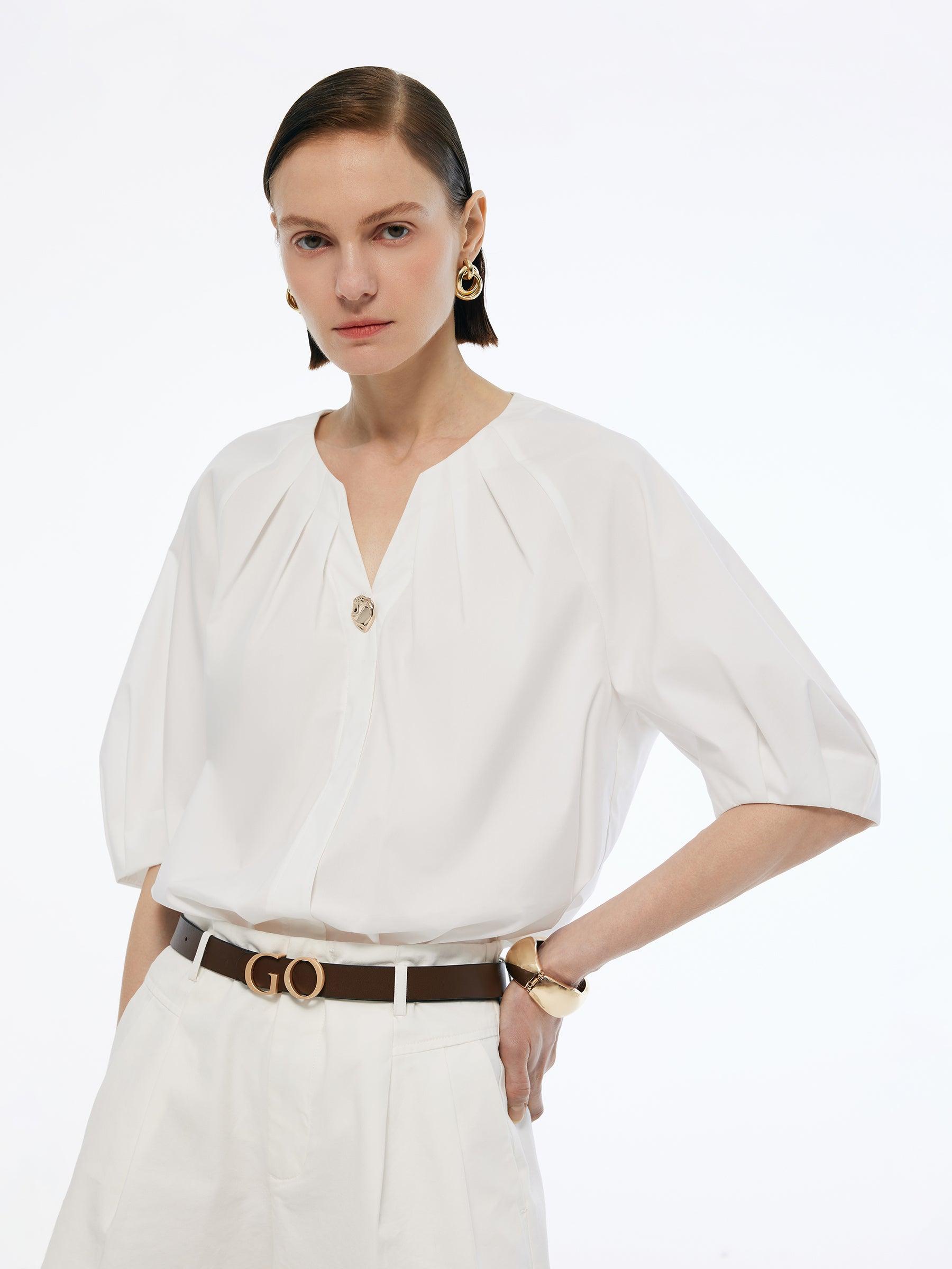 -Breathable and soft -With one decorative button -Inclusive Offered in versatile white tone and designed for durability and wrinkle resistance, this breathable and moisture-wicking blouse is perfect for warm seasons. Its H-line silhouette, with vertical lines and a relaxed fit, creates a slimming effect suitable for al