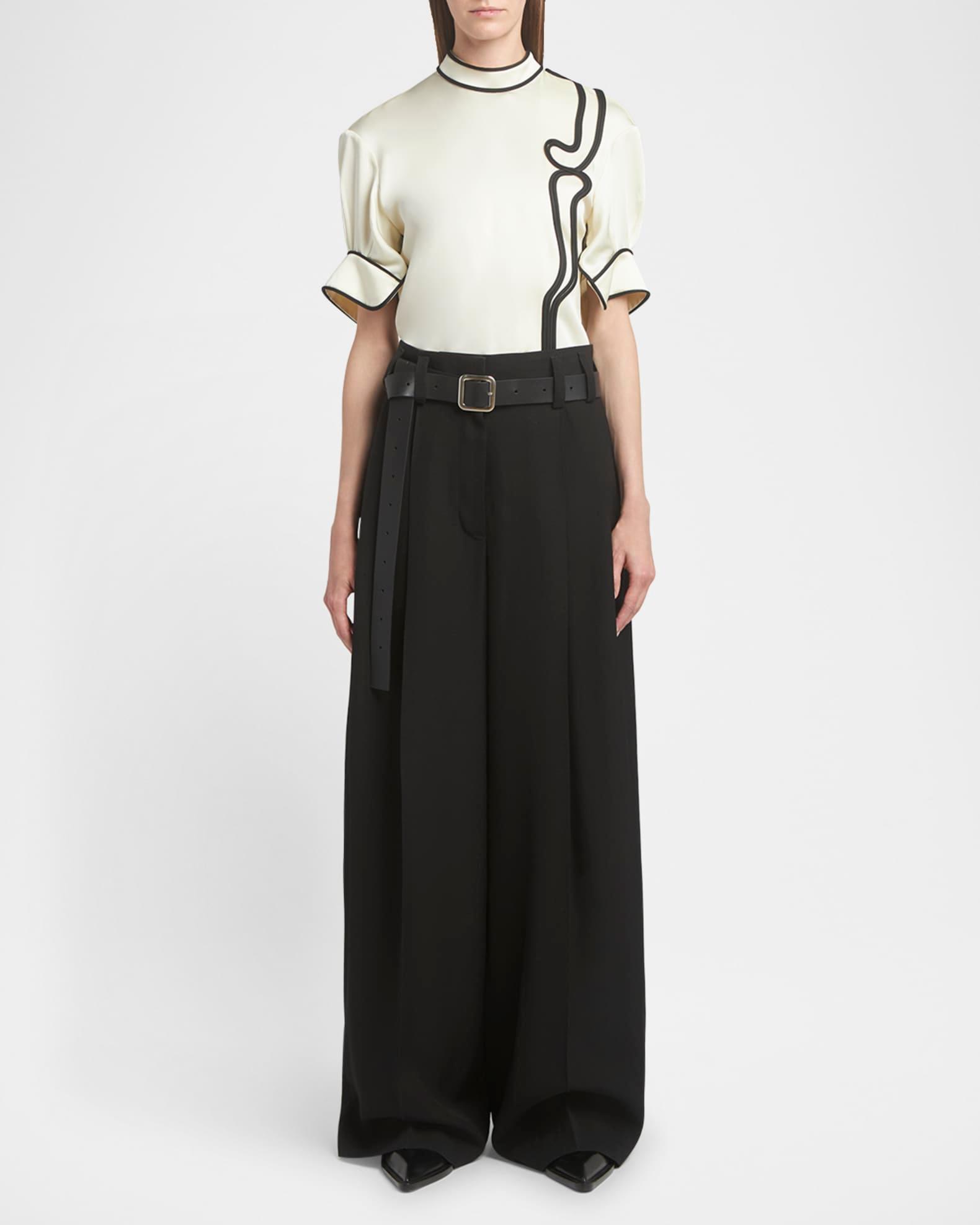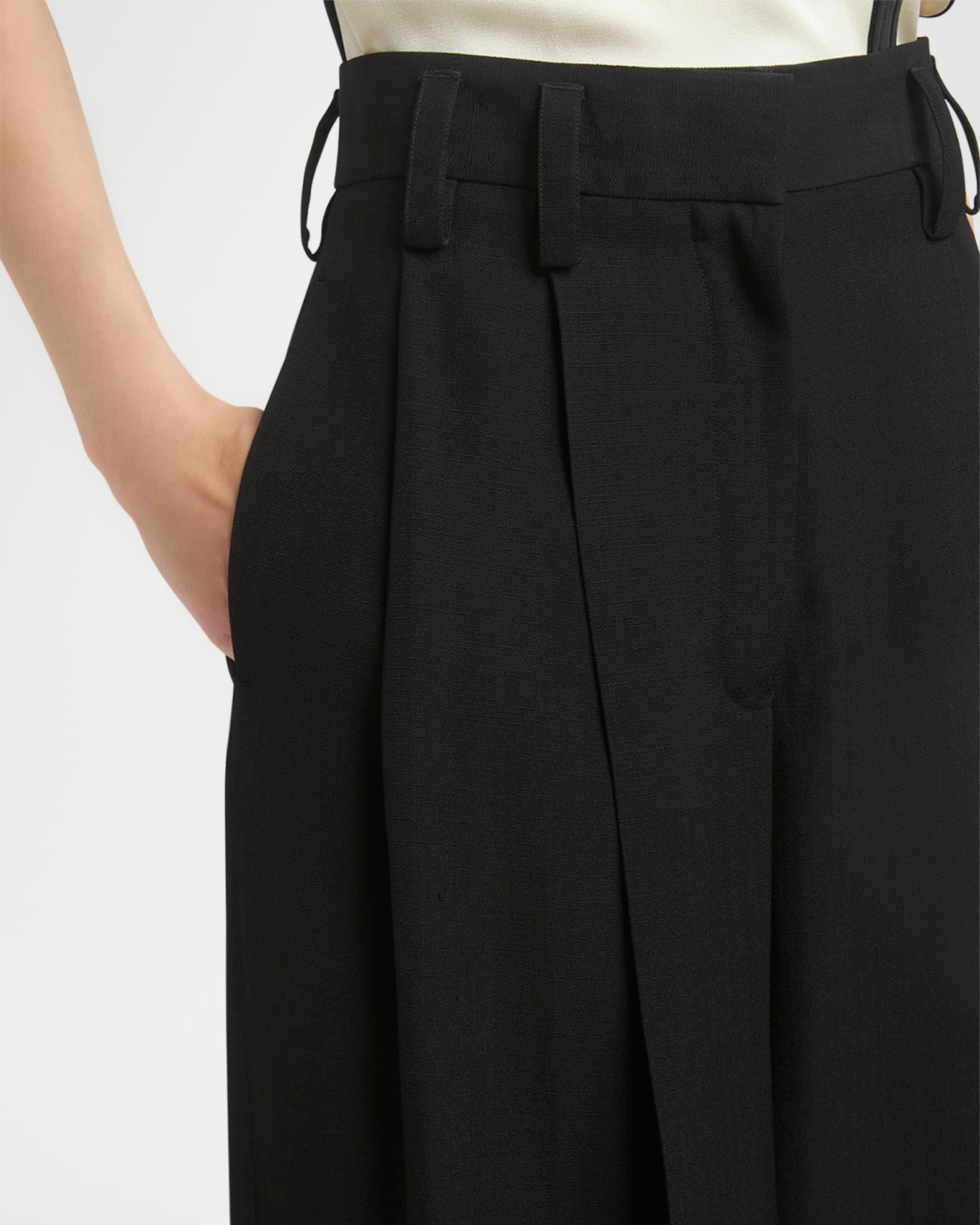 Jil Sander pants featuring a voluminous double pleated front and a drop crotch Approx. measurements: 18.0" rise; 34" inseam; 46" outseam High rise Side slip pockets; back welt pocket Wide legs Full length Hook/zip fly; belt loops Viscose/silk Lining: Viscose Dry clean Made in Italy