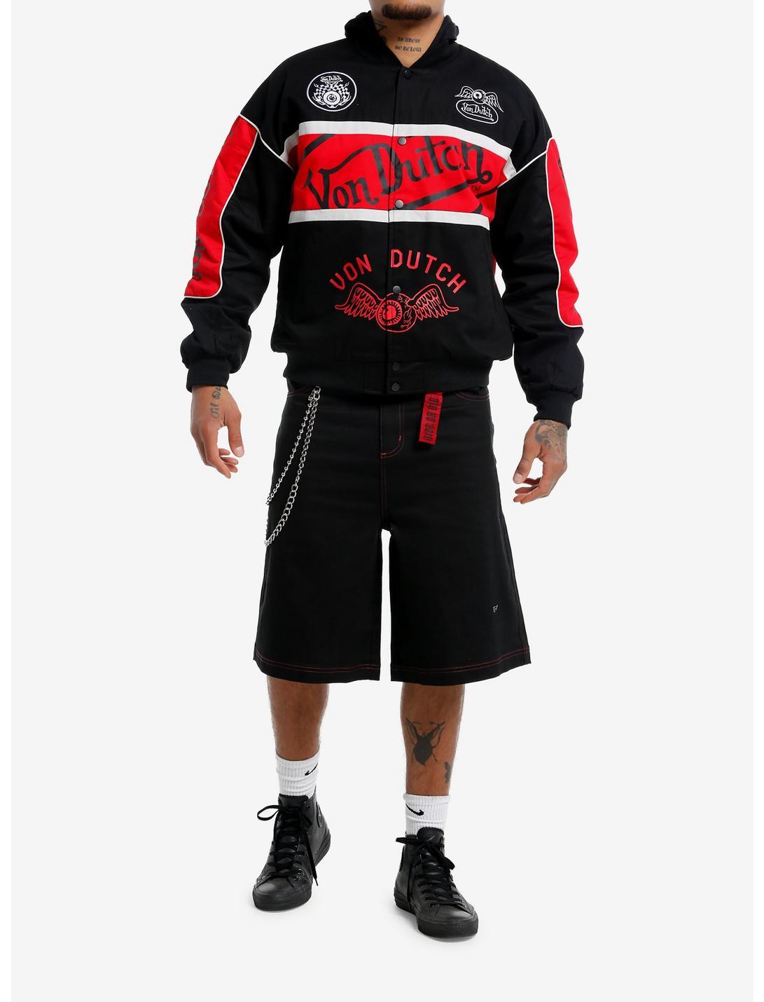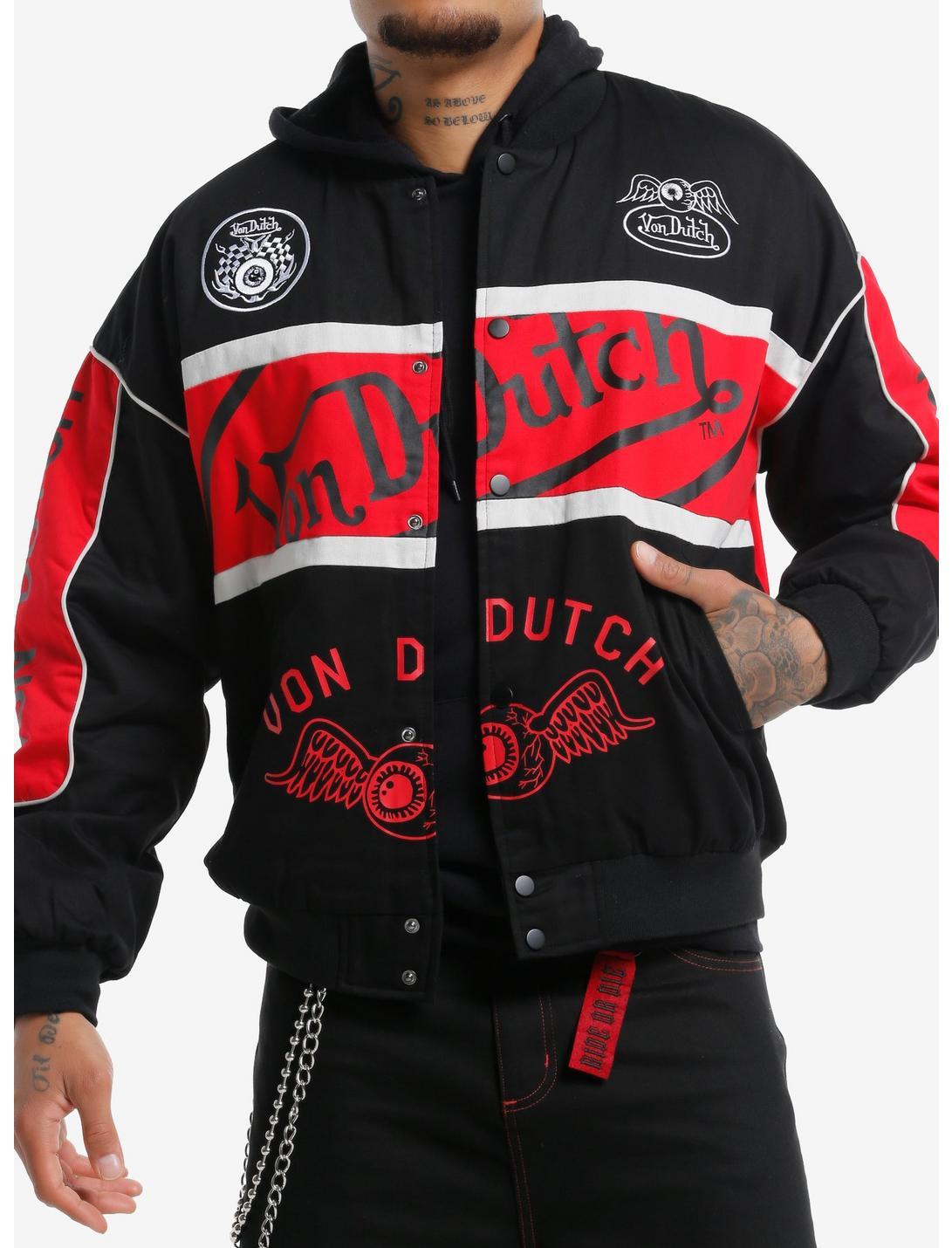Rep the legendary Von Dutch in this racing jacket! It has a red and black colorway, with various printed and embroidered racing symbols and Von Dutch logos on the front. The back is printed with the large winged eyeball and text reading, "The Legend." Side pockets and snap button closures.100% cottonWash cold; dry lowImportedListed in men's/unisex sizesModel is 6'1"Model wears size Medium