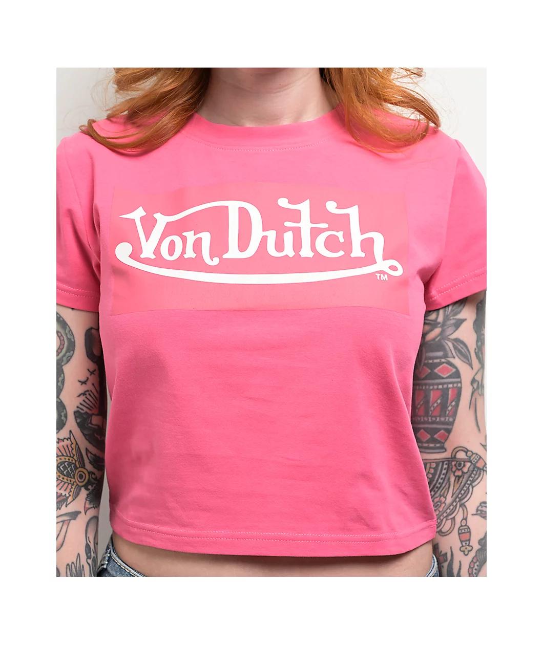 Designed in a slim, cropped fit with a hot pink cotton blend, Von Dutch welcomes the Logo t-shirt with bold screen-printed branding across the chest. The cute short sleeve embodies Y2K style with capped sleeves, a ribbed crewneck collar, and a flatte