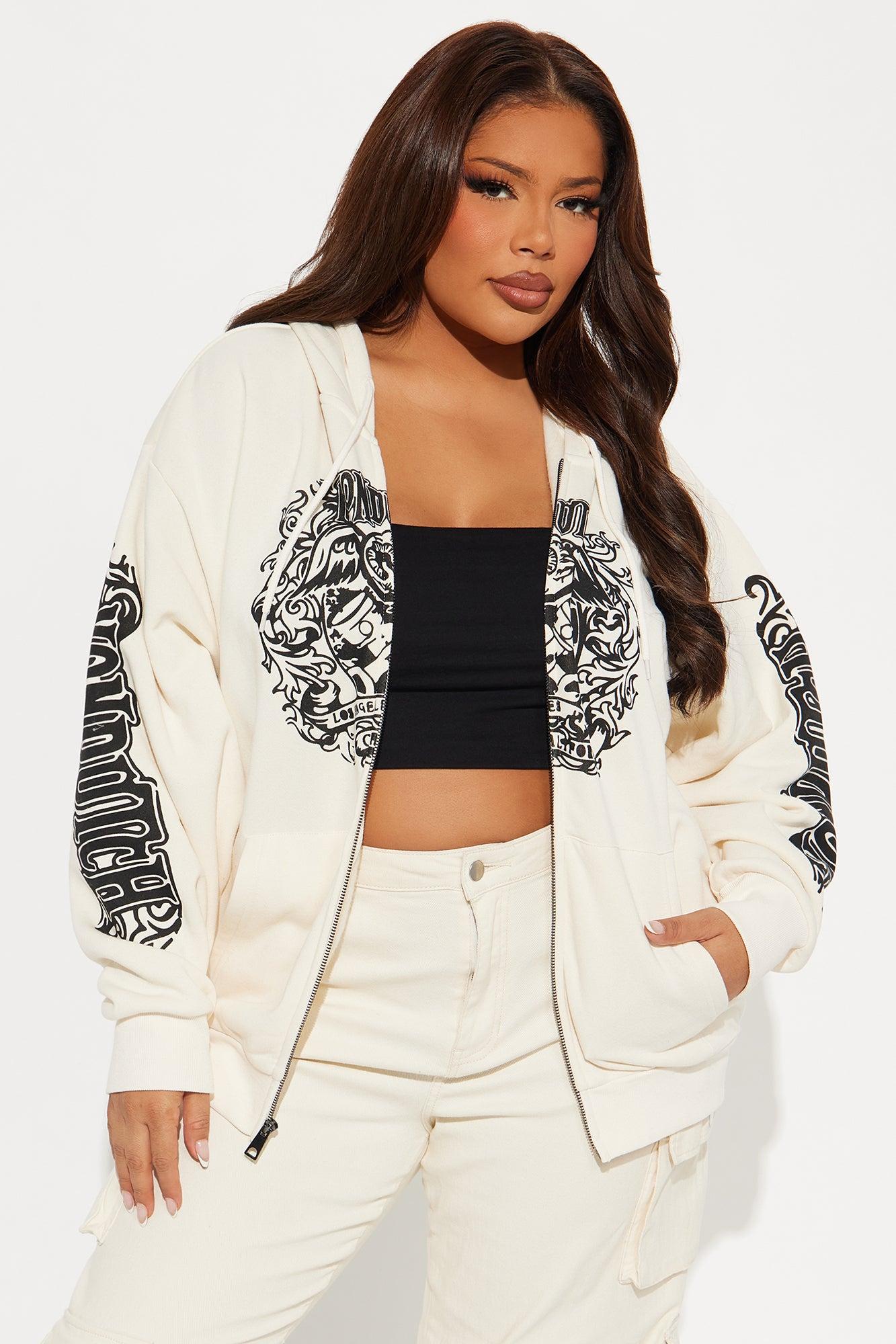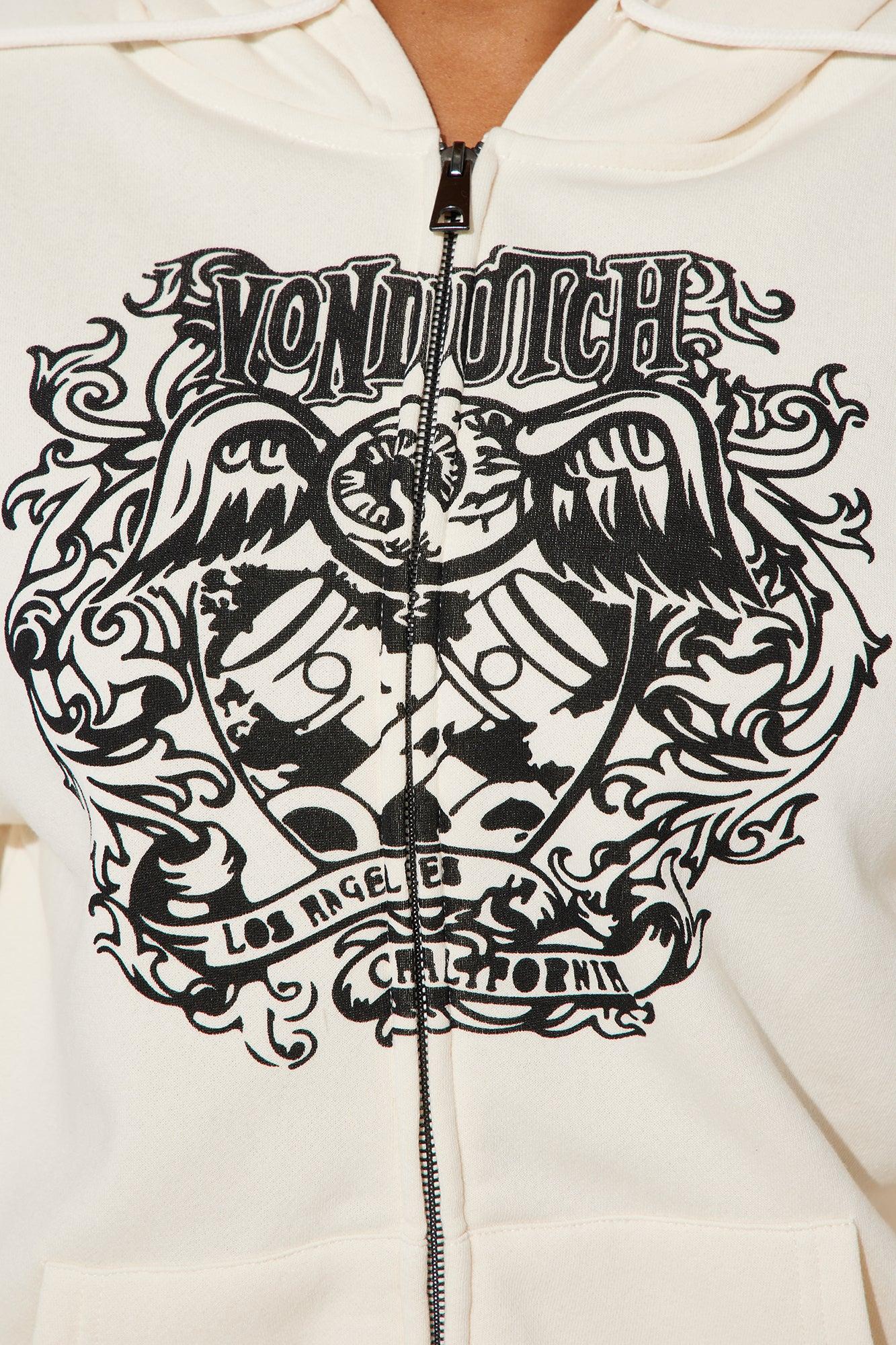 Available In Cream/combo. Sweatshirt Dress Zip Front Drawstrings Von Dutch Novelty Print Disclaimer: Due To The Printing Process A Difference In Saturation May Occur. Each Garment Is Unique. 60% Cotton 40% Polyester Imported
