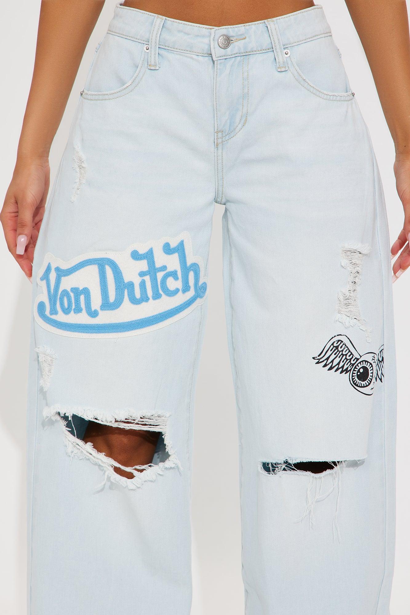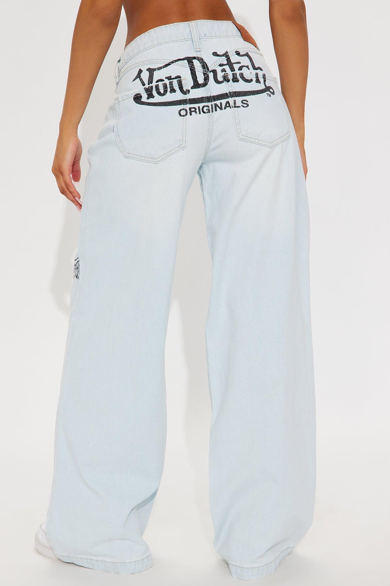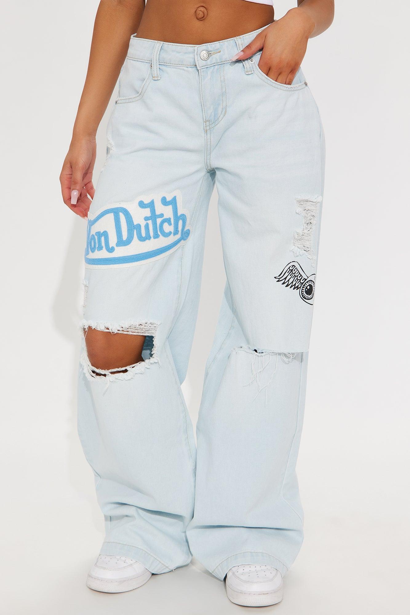 Available In Light Wash. Wide Leg Jean 4 Pocket Patchwork Detail Screen Print Ripped 9.5" Low Rise 34" Inseam Non Stretch Denim Disclaimer: Due To The Printing Process A Difference In Saturation May Occur. Each Garment Is Unique. 100% Cotton Imported California Proposition 65WARNING: Cancer and Reproductive Harm - www.P65Warnings.ca.gov.