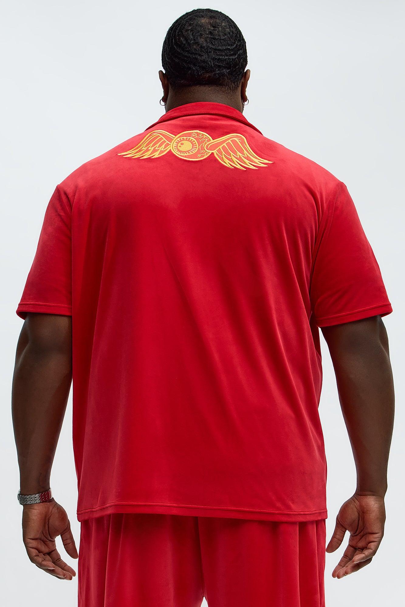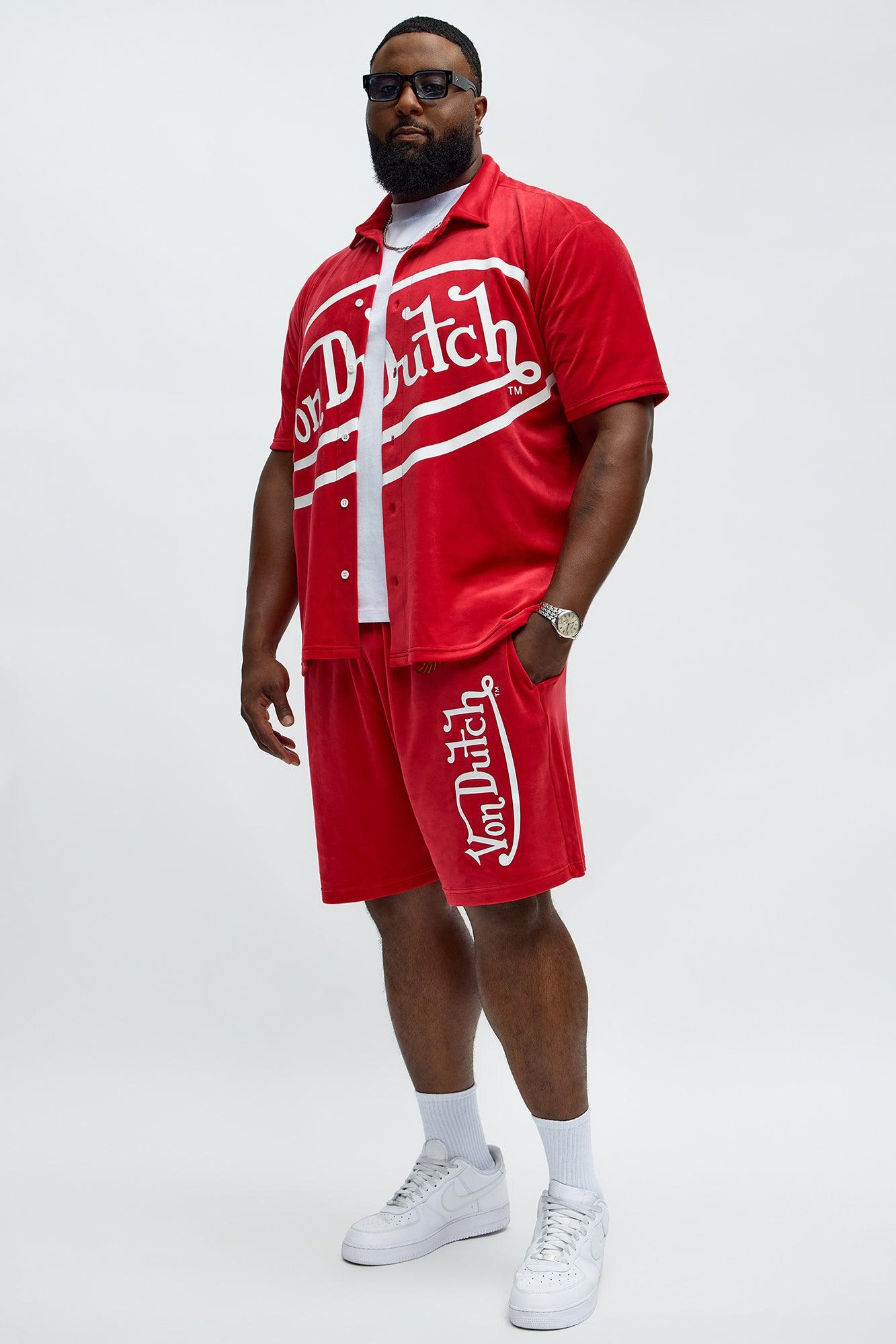 Available In Red. Closed Collar Regular Fit Front And Back Graphic Hit Short Sleeves Pair With "Von Dutch Relaxed Velour Shorts" Disclaimer: Due To The Printing Process A Difference In Saturation May Occur. Each Garment Is Unique. 95% Polyester 5% Spandex Imported