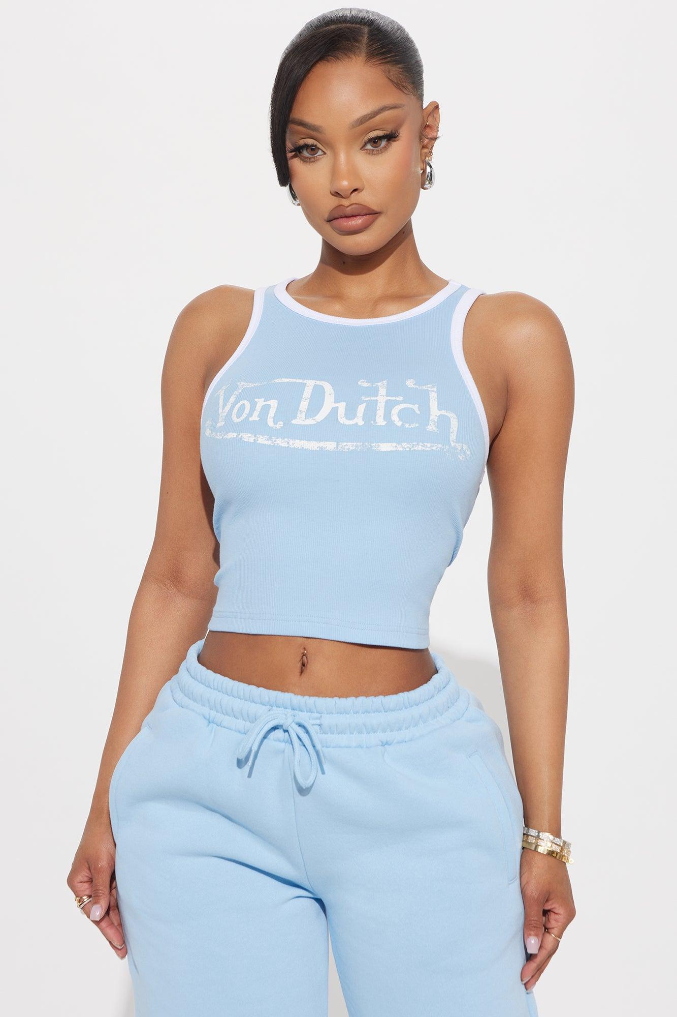 Available In Blue. Ringer Tank Top High Neck Von Dutch Logo Graphic Distressed Cropped Ribbed 95% Cotton 5% Spandex Pair To "Von Dutch OG Baby Tee" Pair To "Von Dutch Washed Wide Leg Pant" Imported
