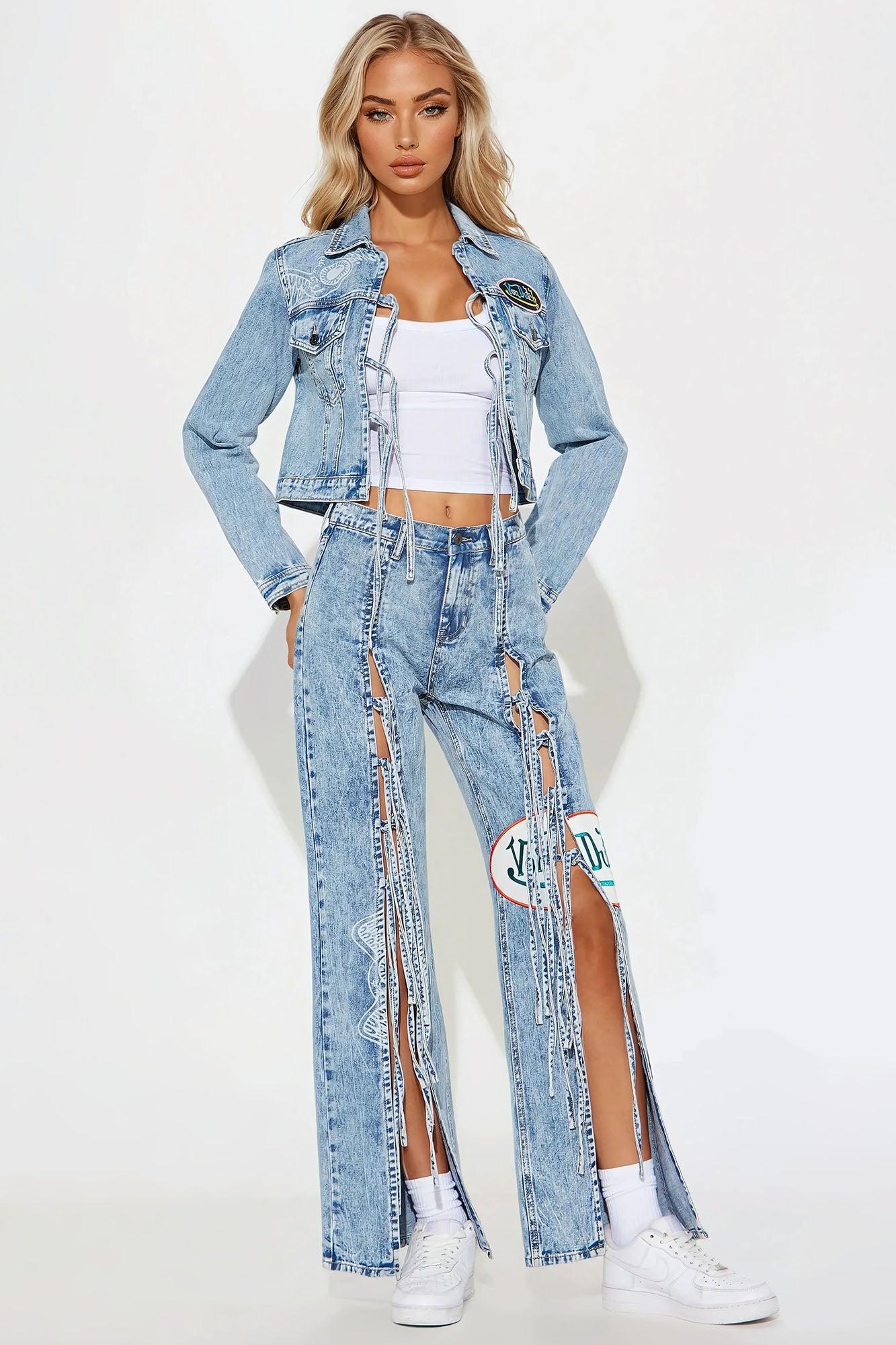Available In Light Wash. Denim Trucker Jacket Tie Front Chest Pockets Patchwork Non Stretch Disclaimer: Due To The Specialized Wash And Printing Process, Each Garment Is Unique.Disclaimer: To Keep The Aesthetic Of This Garment, Please Follow The Care Instructions Carefully. Disclaimer: Patch Placement Will Vary 100% Cotton Imported California Proposition 65 WARNING: Cancer and Reproductive Harm - www.P65Warnings.ca.gov.