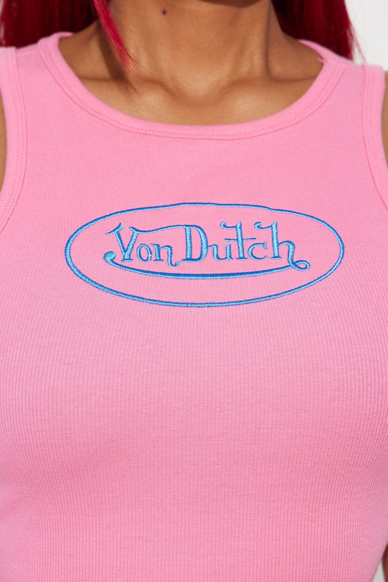 Available In Pink. Tank Top High Neck Embroidered Von Dutch Logo Ribbed Pair To "Von Dutch Timeless Wide Leg Pant" 95% Cotton 5% Spandex Imported