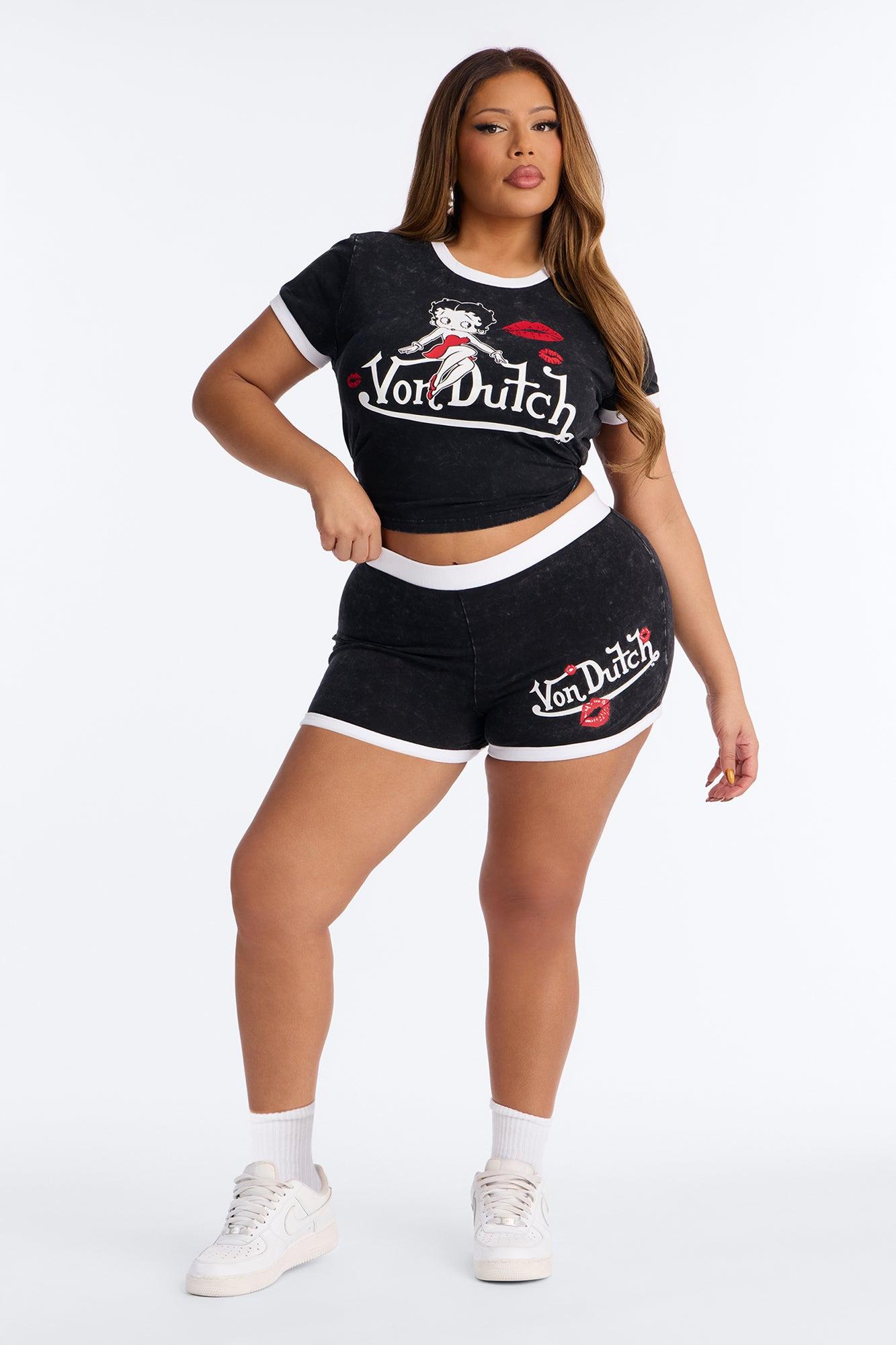 Available In Black Wash. Micro Shorts Stretch Washed Von Dutch Graphic Pair With "Von Dutch x Betty Boop Lucious Lips Washed Baby Tee" Disclaimer: Due To The Printing Process A Difference In Saturation May Occur. Each Garment Is Unique. Self: 95% Cotton 5% Spandex Imported Available In Plus Sizes