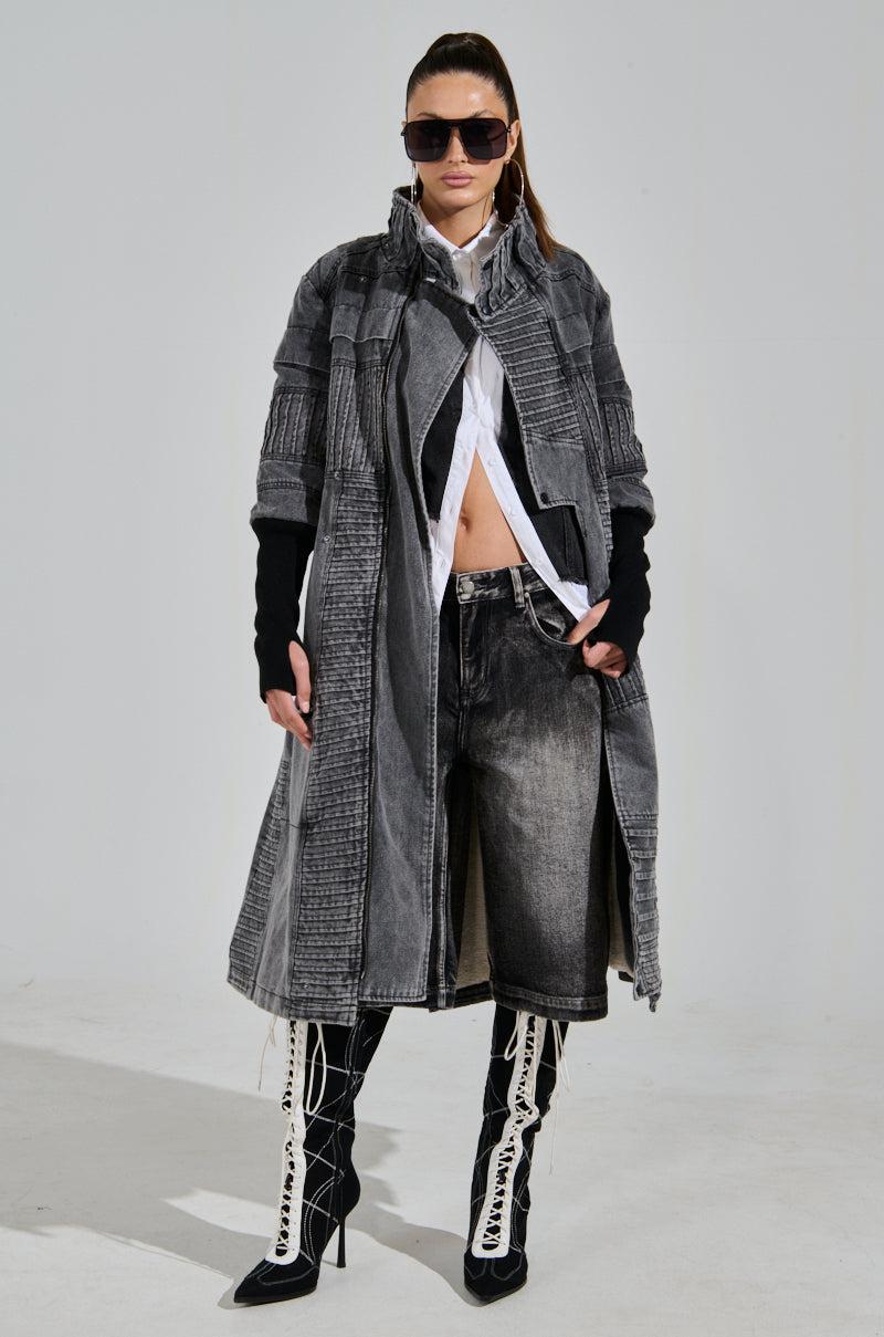 Switch up your winter fashion with The AKIRA Label Vortex Denim Trench Coat. This unique outerwear piece is crafted from a structured, heavy-duty cotton denim base and features a slightly worn, dark wash colorway, a panel construction with textured, ribbed patchwork detailing throughout, a wide mock neck collar with matte snap button hardware, long leg of mutton-inspired sleeves with extended ribbed knit cuffs with built in thumb holes, side slant waist pockets with additional zippered pouch pocks on the front, and a cozy sherpa inner lining to keep you ultra warm. It’s complete with snap button front closures, and a longline silhouette. Pair with flared denim and stiletto boots for a finished look. - Shell: 100% Cotton, Lining: 100% Polyester- Dry Clean Only- No Stretch- Imported (all measurements approximate from size small)- 45” Shoulder to Hem- 18” Shoulder to Shoulder- 25” Sleeves- Model is 5’9” and is wearing size small Product ID: 439147