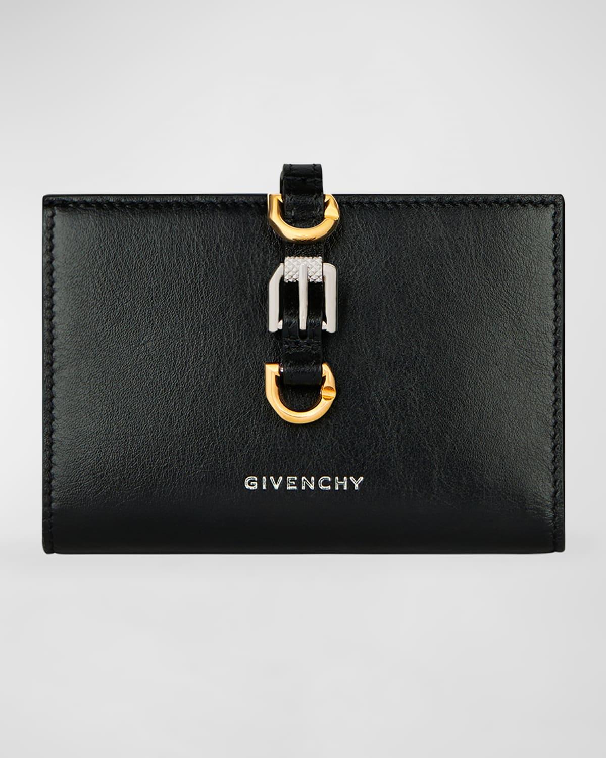 Voyou wallet in leather. Bifold wallet in tumbled calfskin leather Voyou line Fastened with leather strap with golden and silvery-finish Givenchy engraved metal buckles Givenchy signature debossed on the front Four flat pockets, one bill pocket, one coin pocket with press stud and five card slots Dimensions: 5.3 in x 3.5 in x 0.8 in Made in Italy. Lsd Handbags - Givenchy > Givenchy > Saks Fifth Avenue > Barneys. Givenchy. Color: Black.