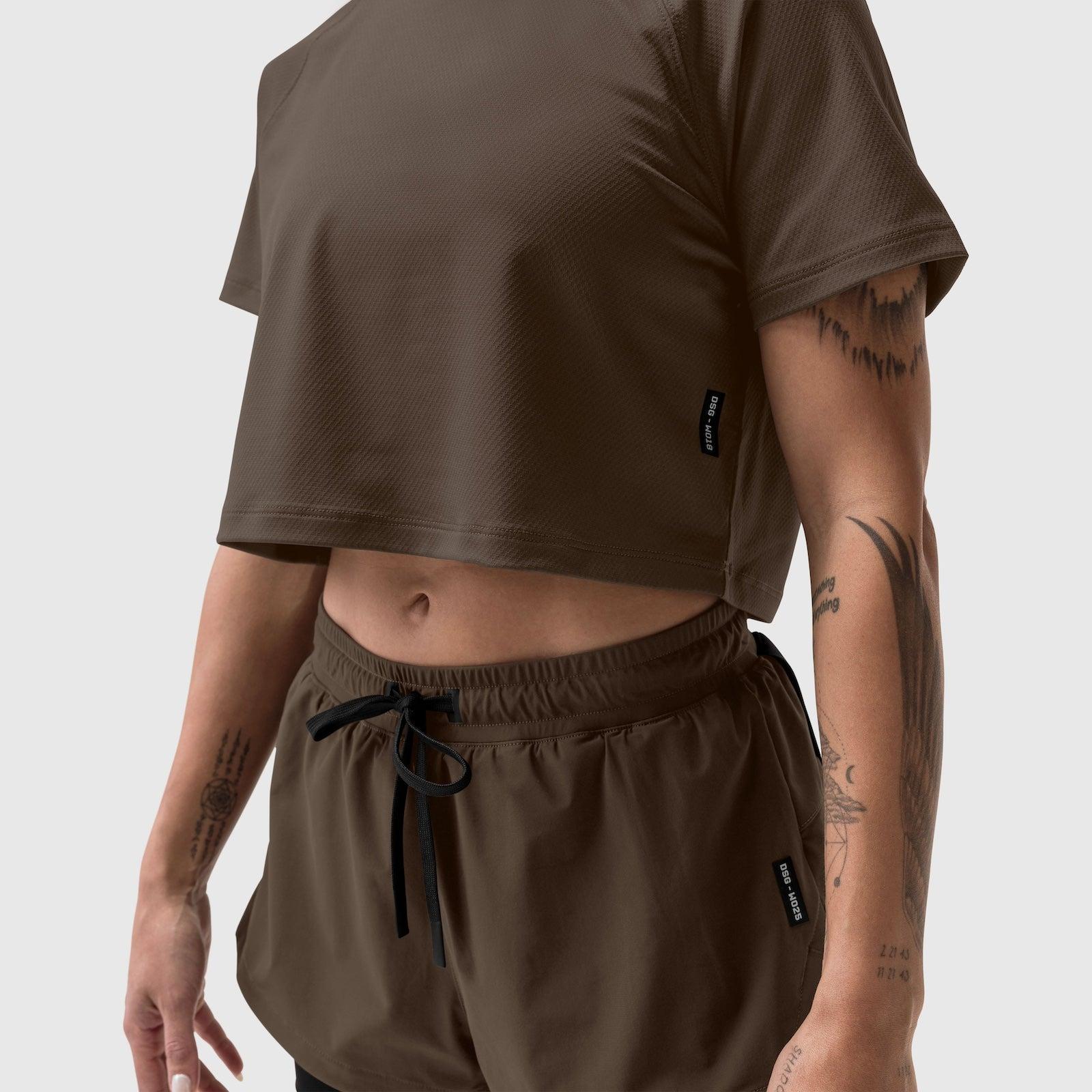 Lightweight mid-crop training tee made from AeroSilver®, our next-generation silver-infused performance fabric built for durability, breathability, and odor resistance. Designed with a curved hem and side splits reinforced with tack seams for added flexibility. Reflective logo details provide visibility during low-light workouts. Model is 5'5" and 127lbs wearing size S.