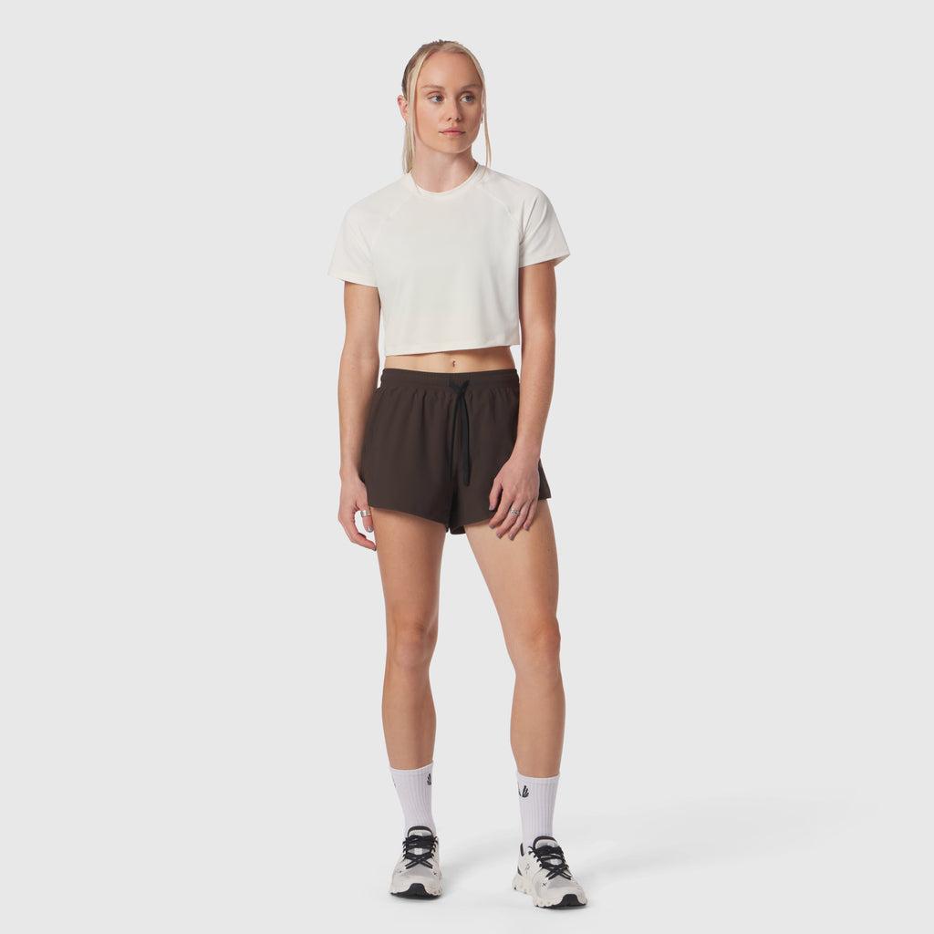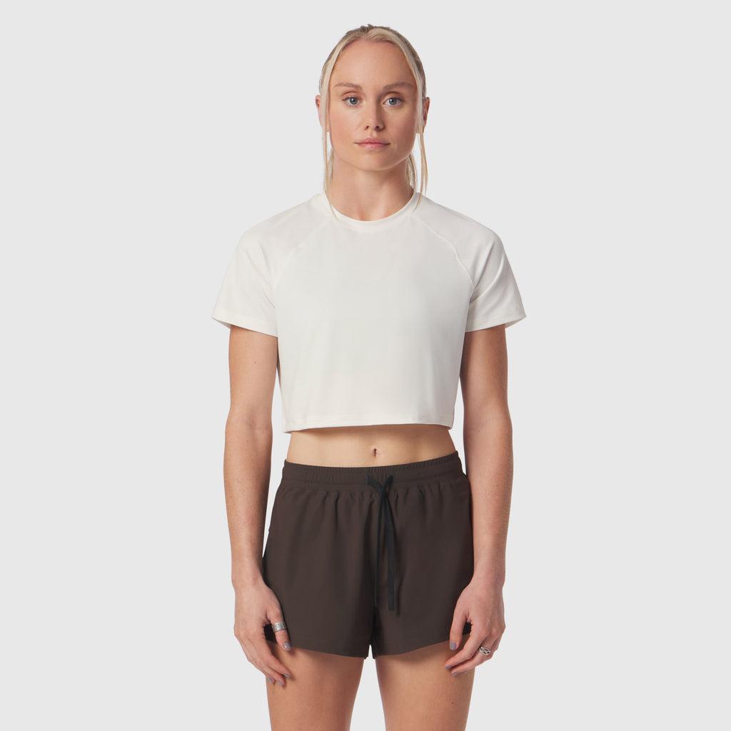 Lightweight mid-crop training tee made from AeroSilver®, our next-generation silver-infused performance fabric built for durability, breathability, and odor resistance. Designed with a curved hem and side splits reinforced with tack seams for added flexibility. Reflective logo details provide visibility during low-light workouts. Model is 5'5" and 127lbs wearing size S.
