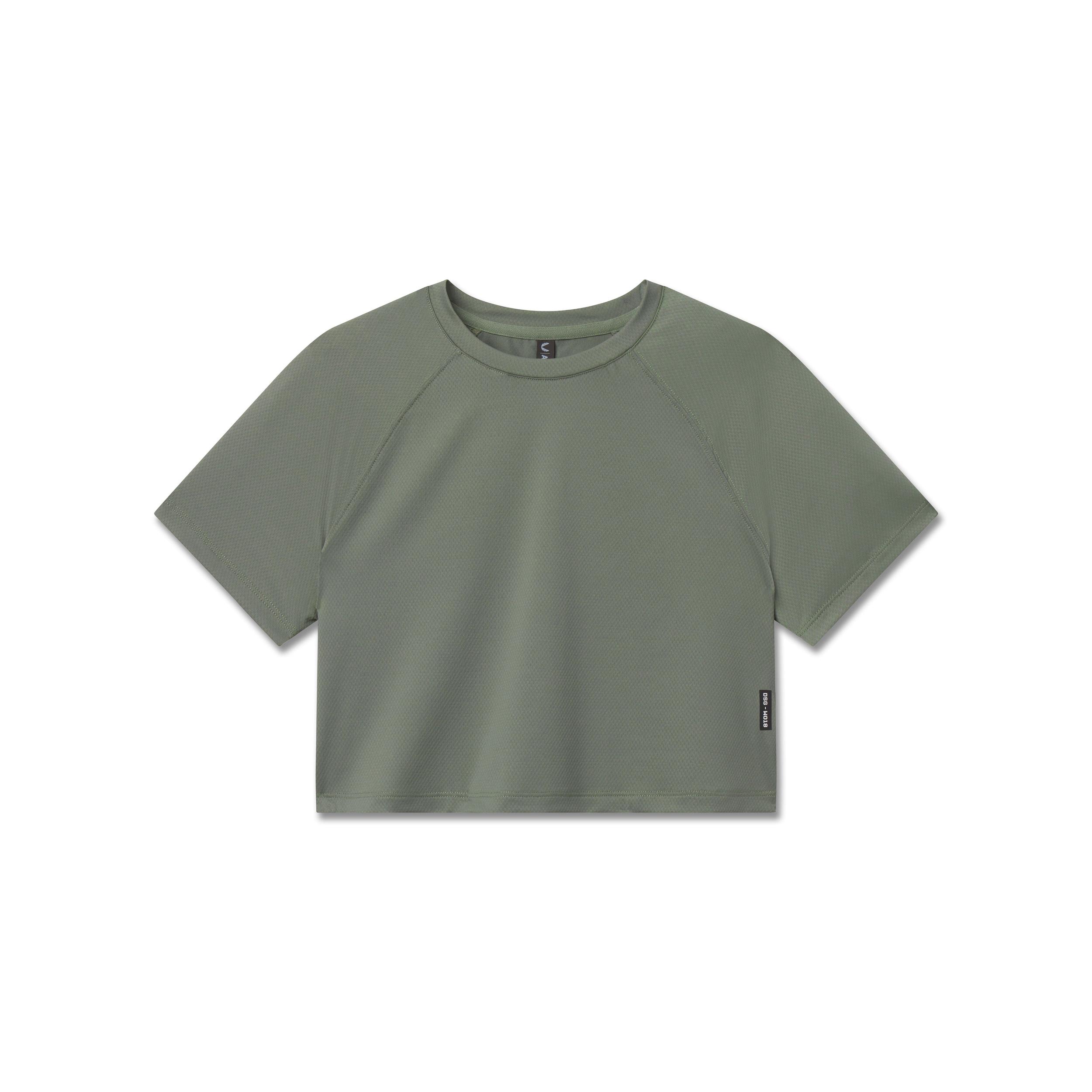 Lightweight mid-crop training tee made from AeroSilver®, our next-generation silver-infused performance fabric built for durability, breathability, and odor resistance. Designed with a curved hem and side splits reinforced with tack seams for added flexibility. Reflective logo details provide visibility during low-light workouts. Model is 5'5" and 127lbs wearing size S.