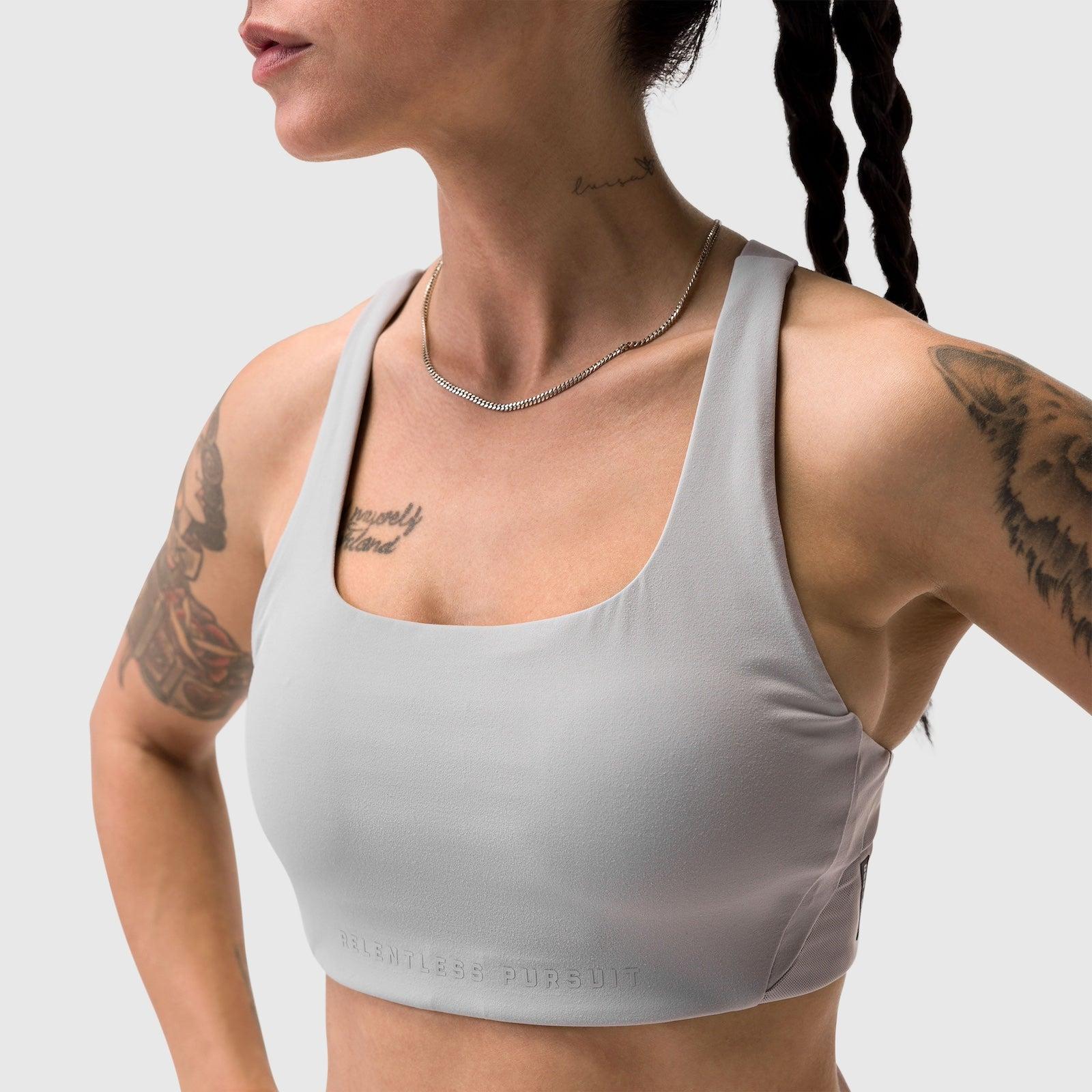 A streamlined sports bra designed for high-performance support and all-day comfort. Constructed from patented Lycra® for superior stretch, durability, and shape retention. Features an integrated sweatband in the underband for moisture-wicking, removable pads for customizable support, and power mesh zones for targeted ventilation. Ergonomic, reinforced straps ensure a secure fit. Finished with reflective logo details for visibility in low-light conditions. Model is 5'2" and 108lbs wearing size XS.