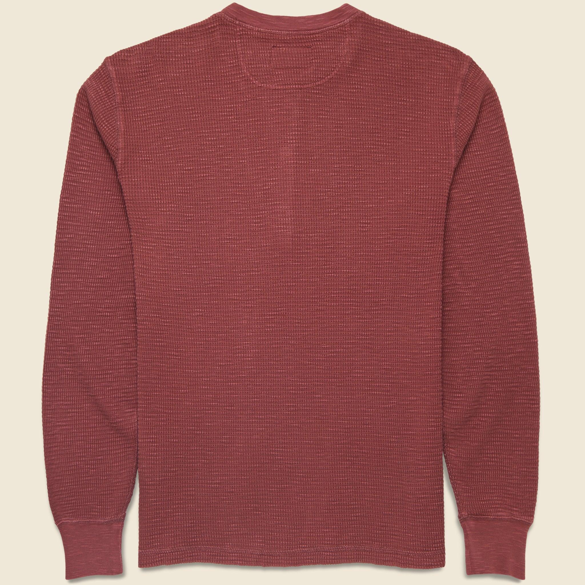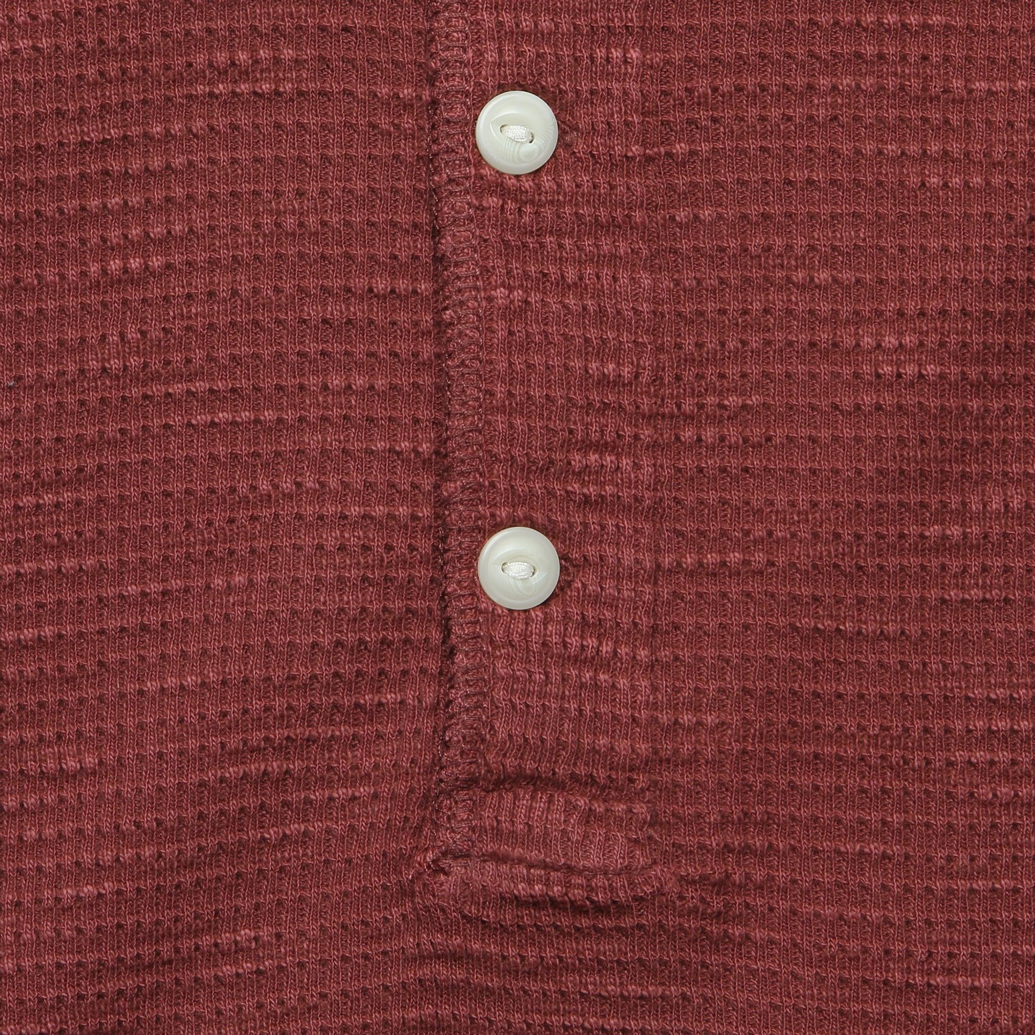 This Henley from Double RL is crafted from soft waffle-knit cotton that’s been garment-dyed and washed to give it a time-worn look and lived-in comfort from day one. Featuring a three-button henley placket faced with sateen, it looks great on its own or layered under your favorite flannel. Waffle-knit cotton Three-button henley placket Garment-dyed and washed Rib-knit cuffs Slim fit that runs true to size We recommend taking your normal size or taking one size up for a more relaxed fit Materials: 100% cotton The following measurements are for size Medium: Chest: 38” | Shoulder: 17” | Sleeve: 33 ½” | Length: 26”