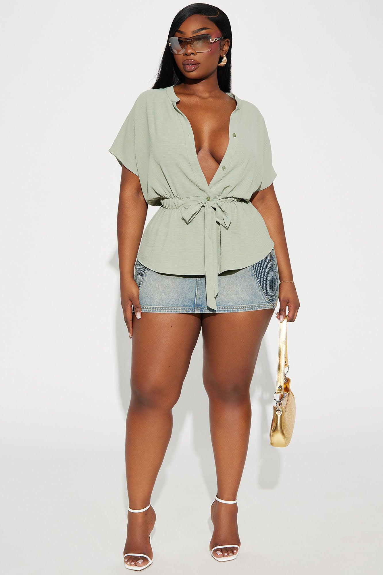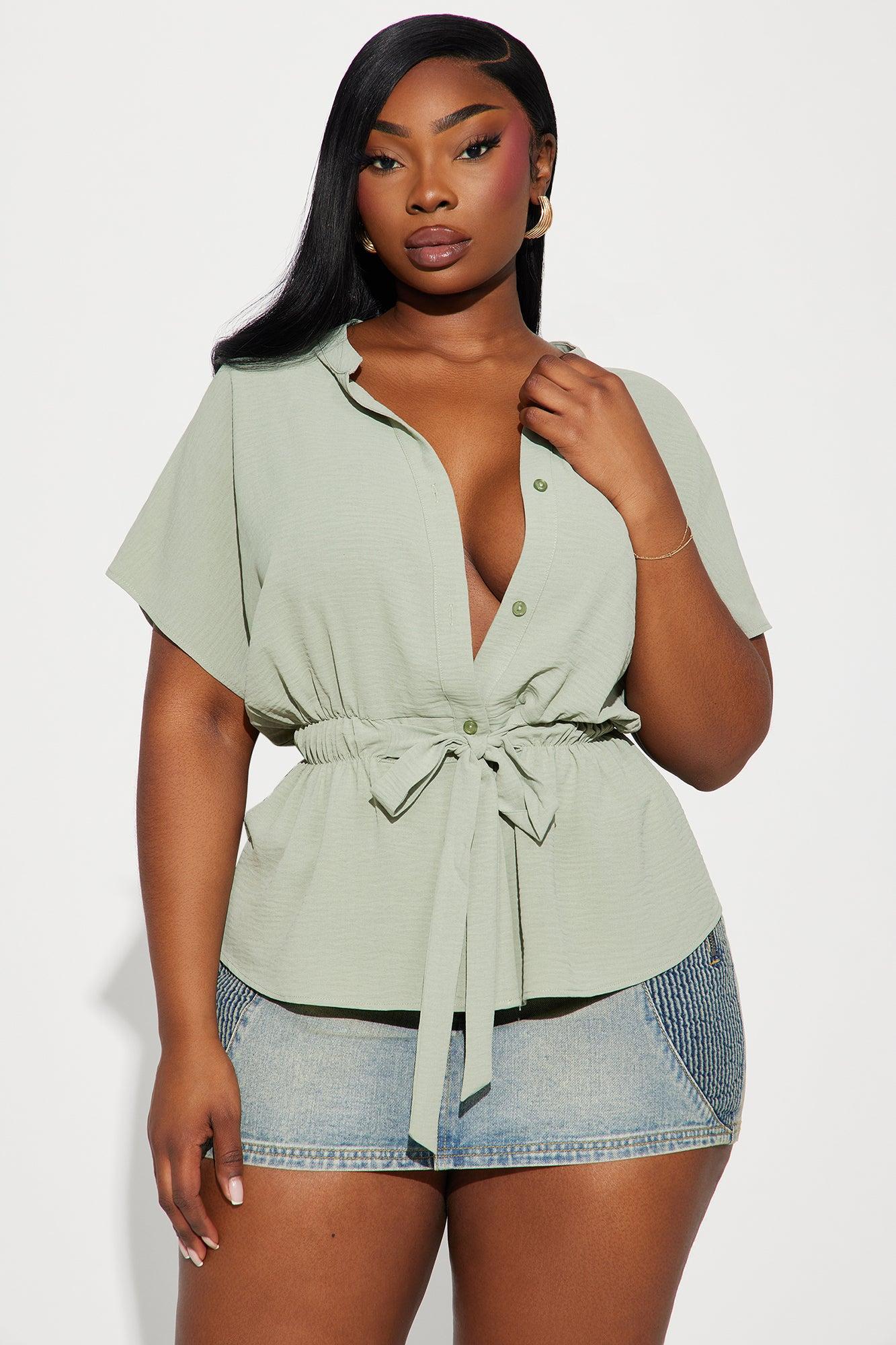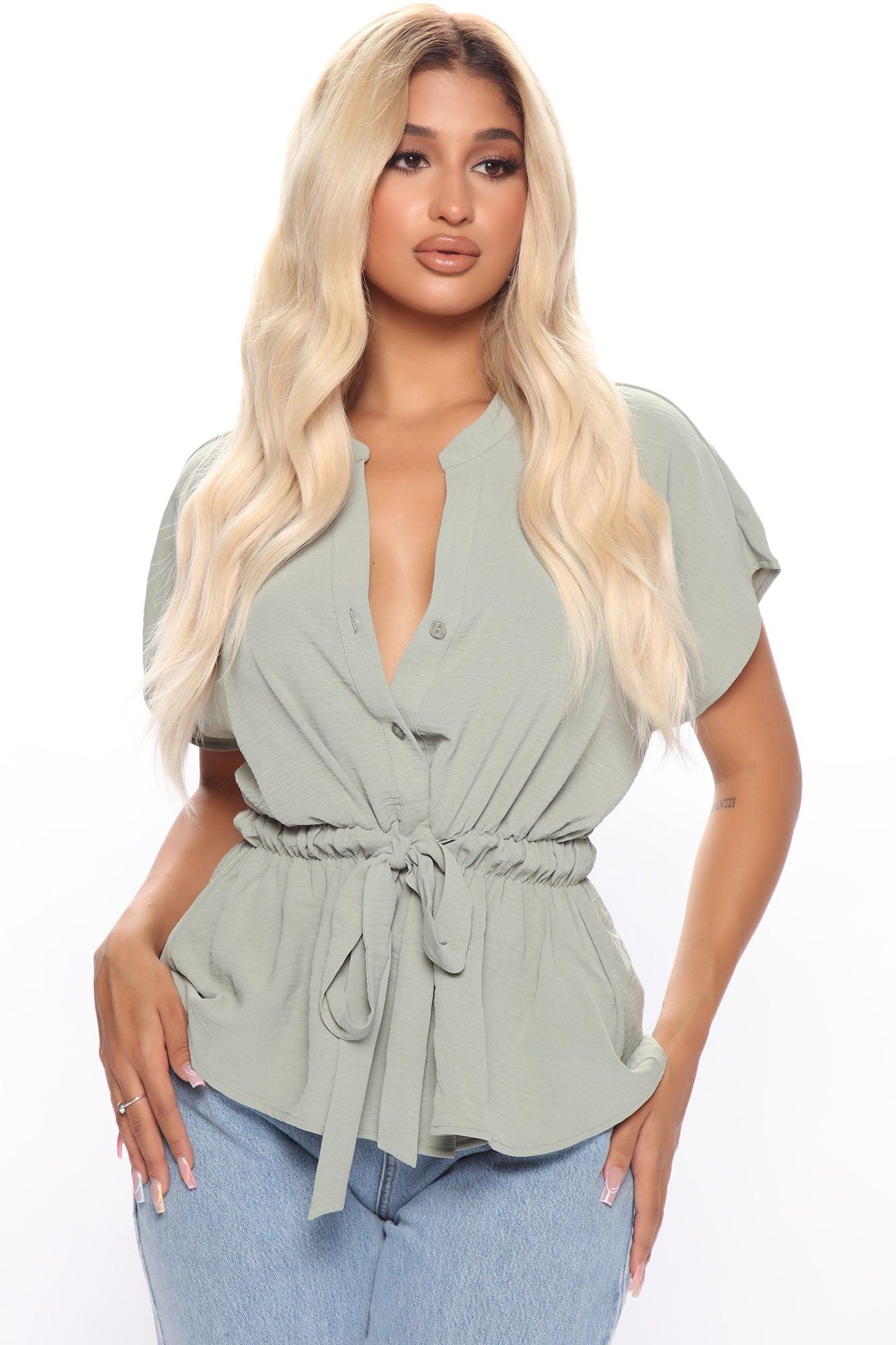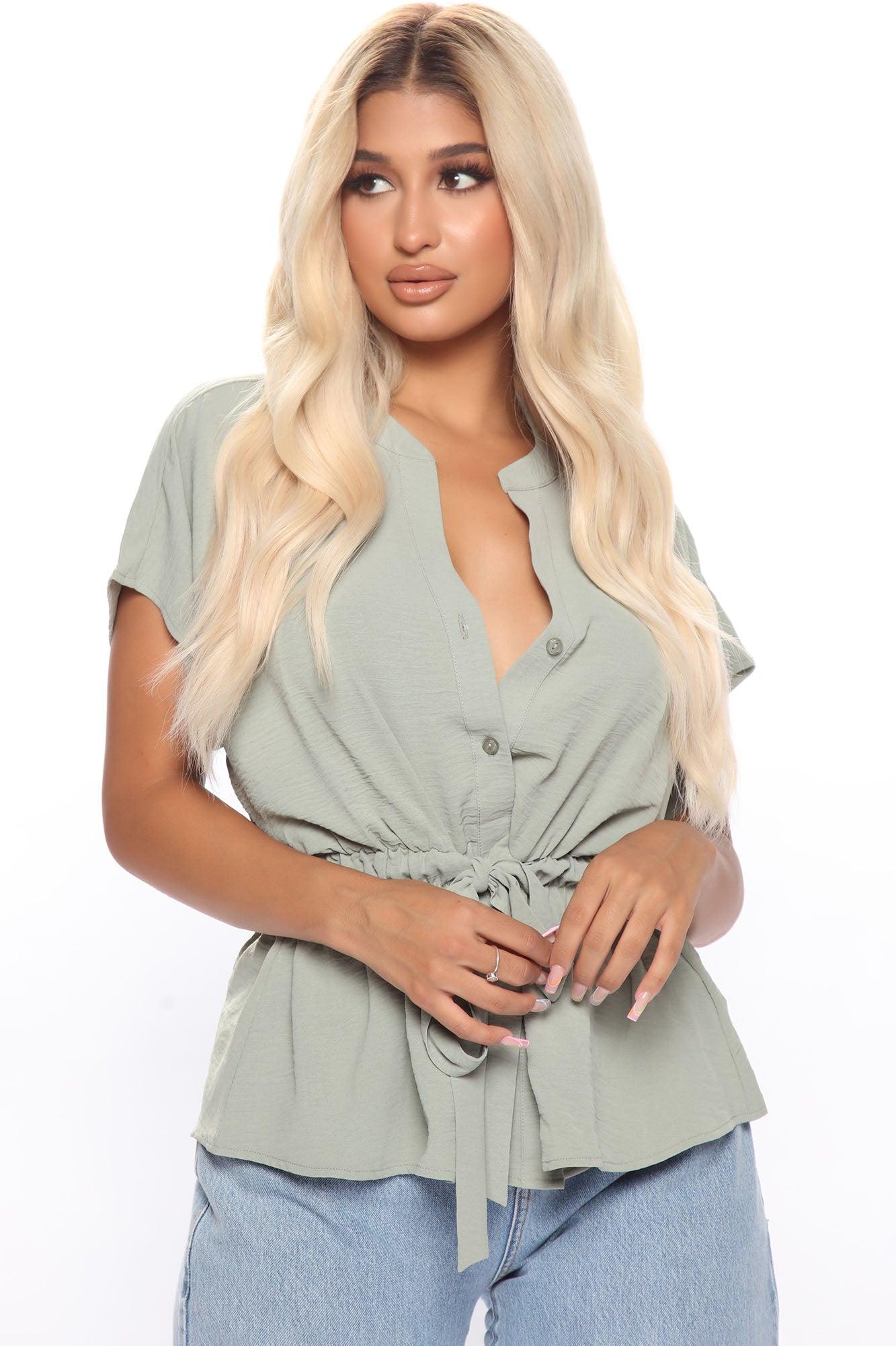 Available In Rose And Sage. Tie Waist Blouse Notch Front Button Front Self: 100% Polyester Imported Available In Plus Sizes