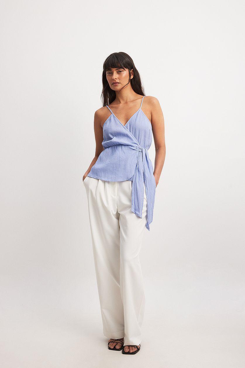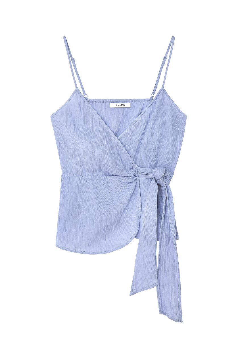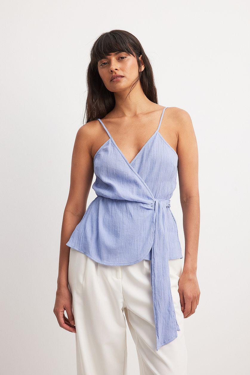 This singlet features a relaxed fit. It has a non-stretchy material and thin, adjustable shoulder straps. The singlet has a v neckline and a wrap design with a self tie closure.