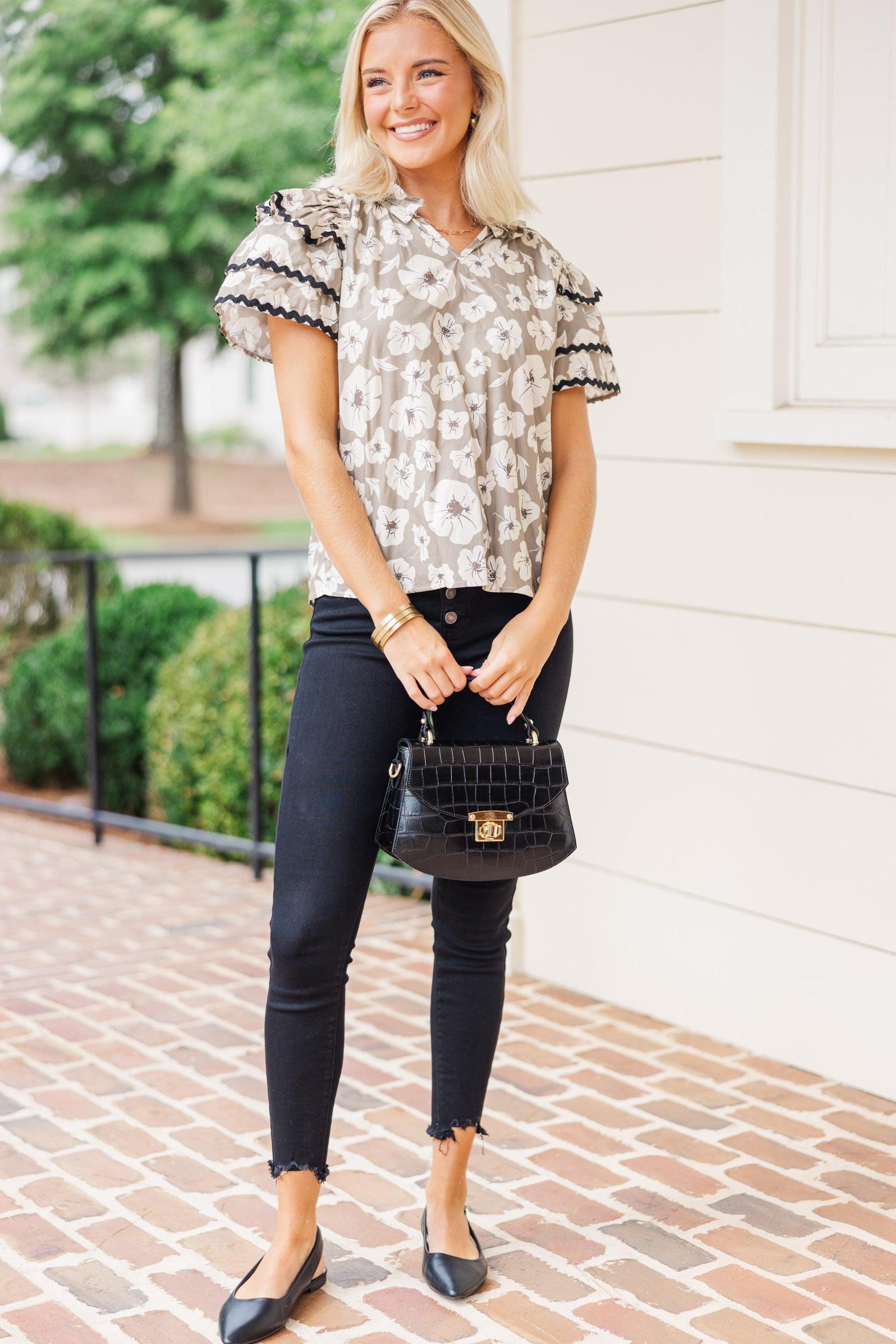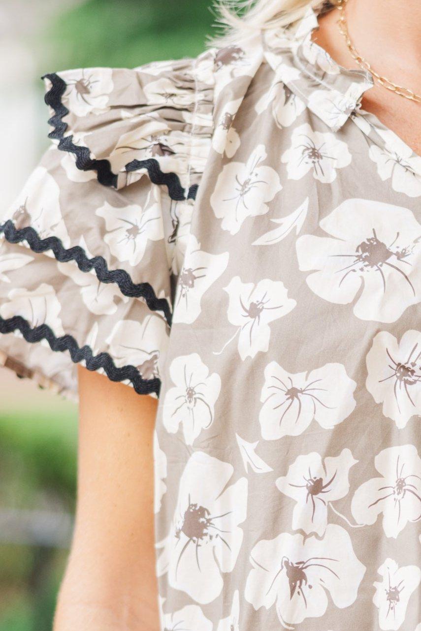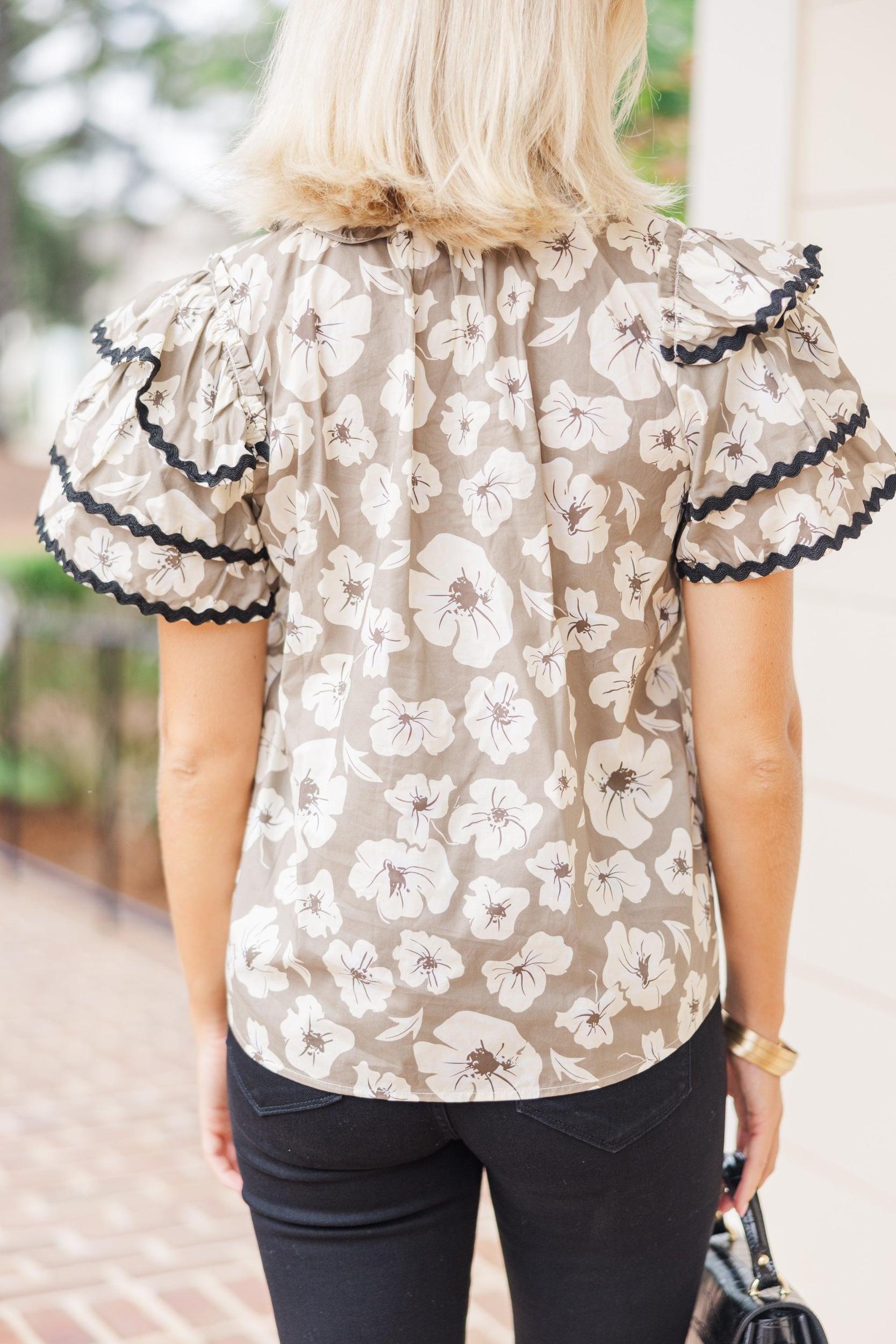 Your wait for this blouse is over! That floral print paired with that ruffled detailing is perfection! We also really love that trendy rickrack trim! This blouse is perfect for work or play! V-neckline Short sleeves Ruffled detailing Rickrack trim Floral print No stretch Payton is wearing the small.
