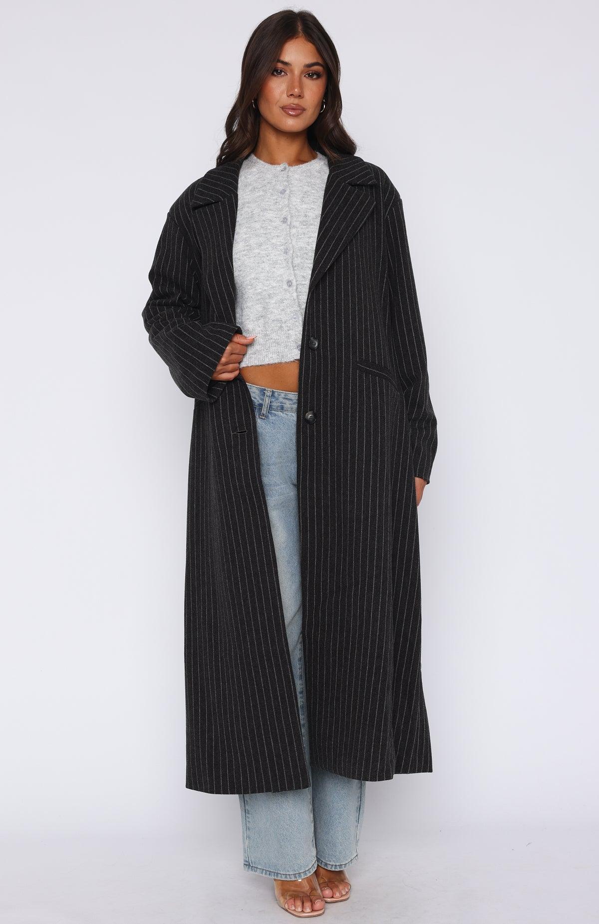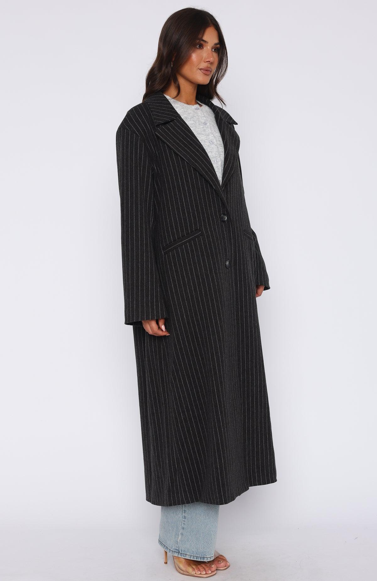 Wrap yourself in playful sophistication with the Walk By Me Oversized Coat in Charcoal Pinstripe. Features a collar neckline, slouched shoulders, long sleeve, two button closure centre front, side pockets and hemline split on centre back for ease of walkability. Layer this stunning coat with a white tee, jeans and your go-to everyday shoe! 100% Polyester Ash us 166cm & wears a S/M Dekota is 167cm & wears a S/M