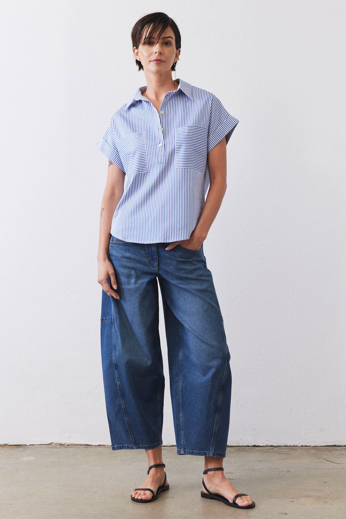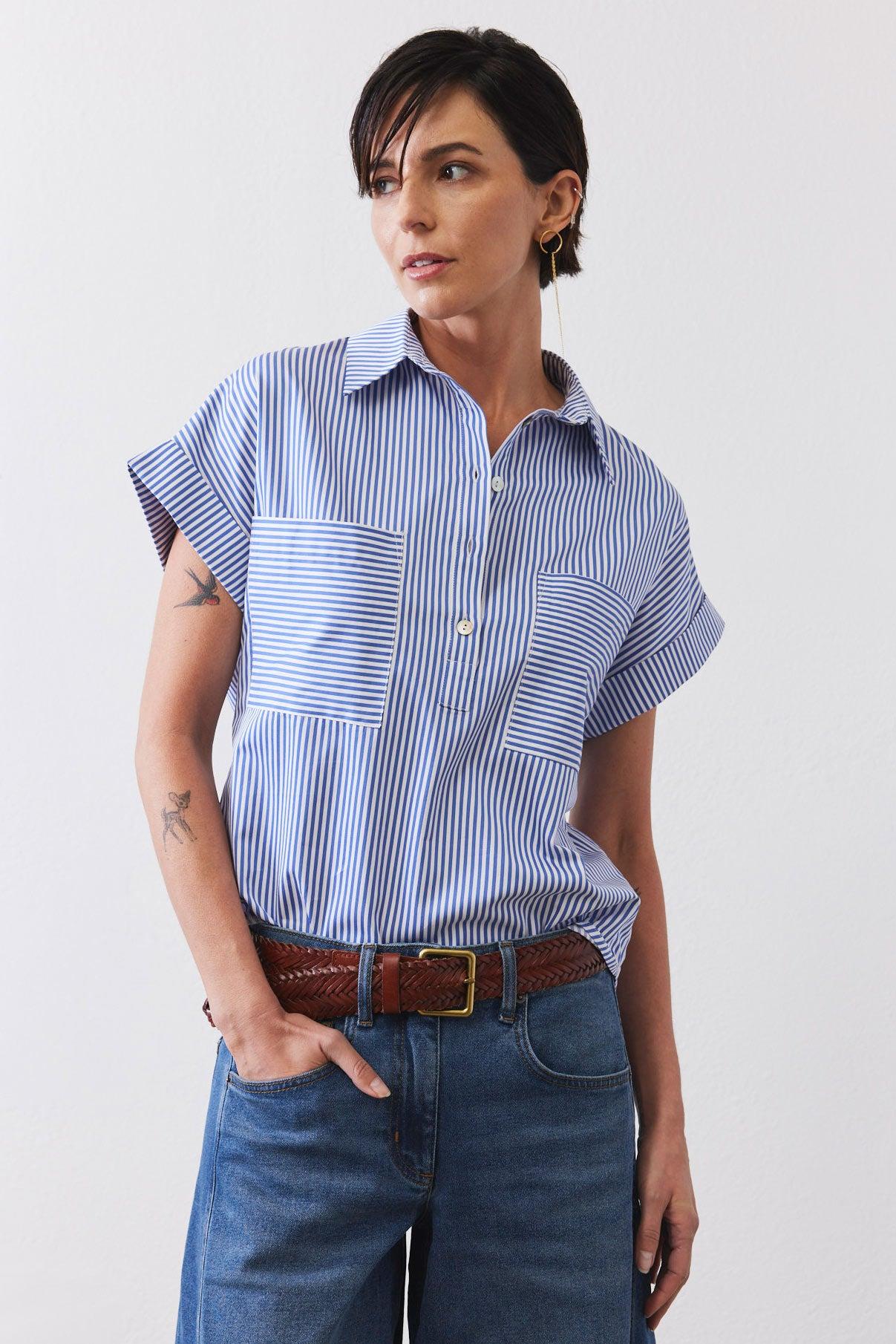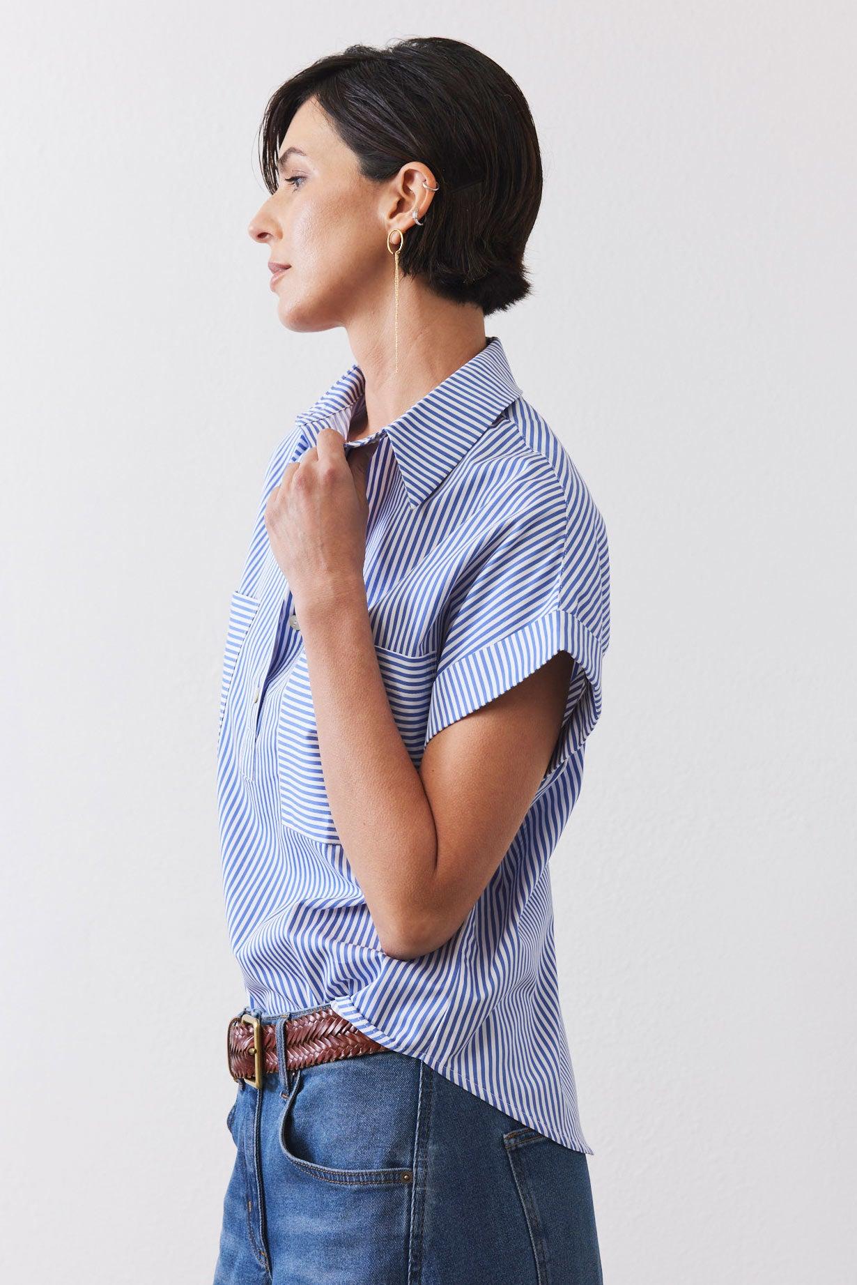 Our Walk the Line Top is crafted from premium poplin fabric, this striped shirt offers a lightweight and breathable feel that keeps you comfortable all day long. The fabric's natural breathability ensures you stay cool even during warmer weather, making it an essential addition to your year-round wardrobe.