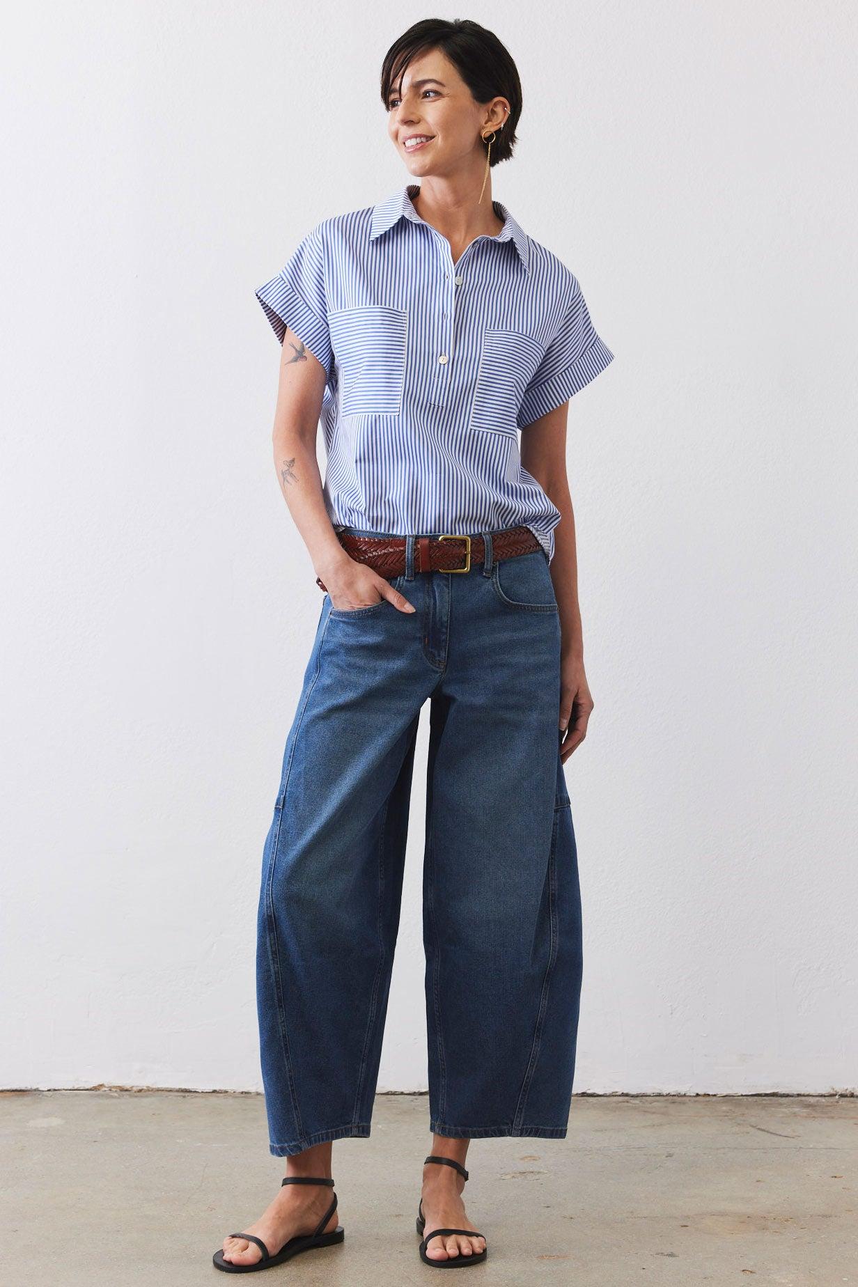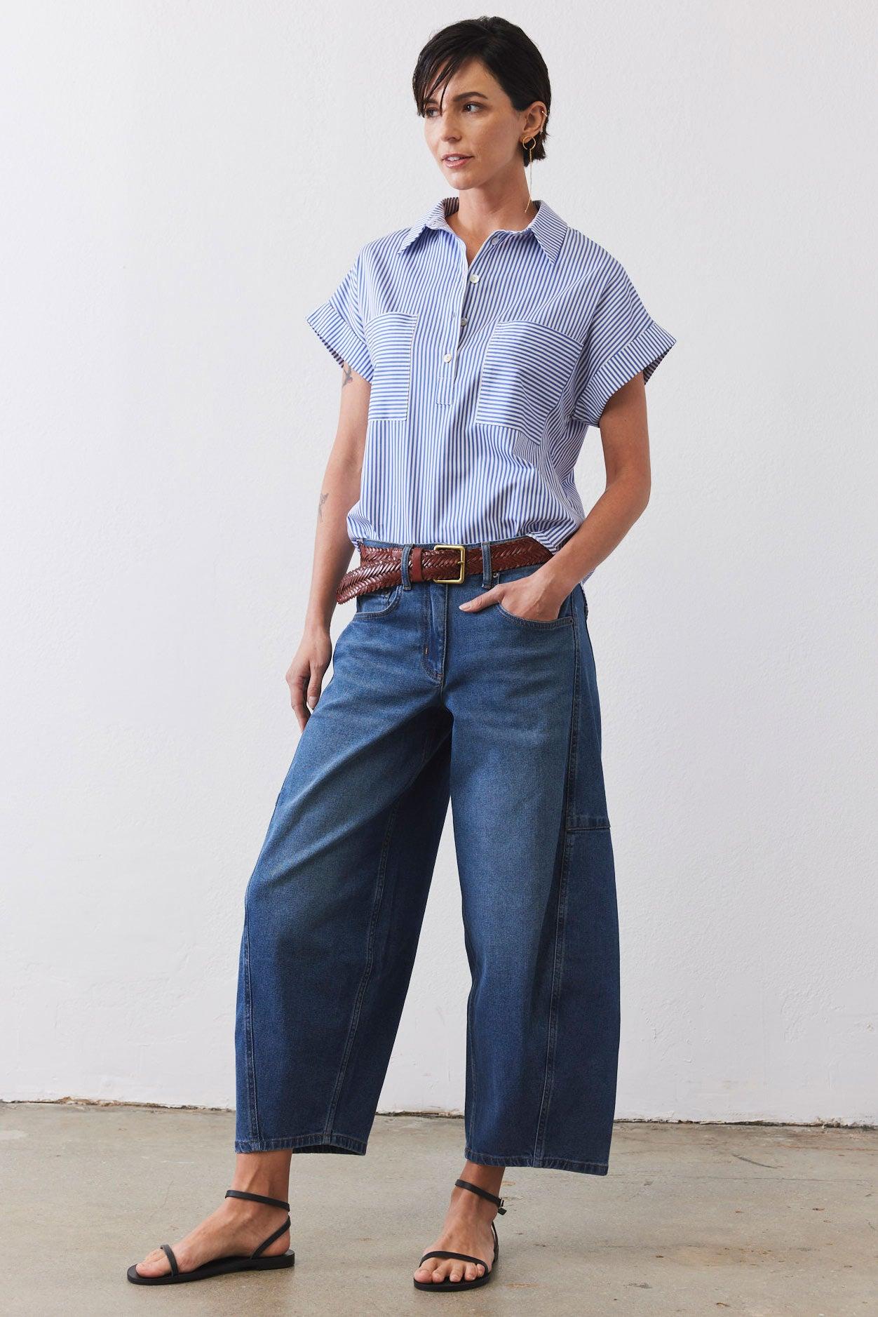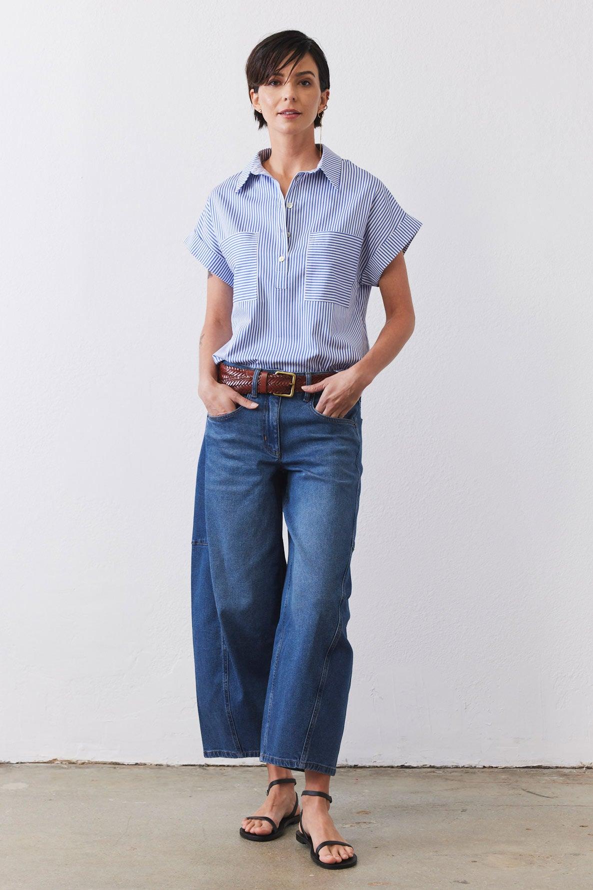 Our Walk the Line Top is crafted from premium poplin fabric, this striped shirt offers a lightweight and breathable feel that keeps you comfortable all day long. The fabric's natural breathability ensures you stay cool even during warmer weather, making it an essential addition to your year-round wardrobe.