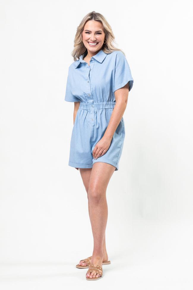 Details Solid Chambray Romper Blue Fabric has some stretch Elastic waistband, cuffed hem, functional button up closure, collared style Unlined Size small inseam: 3" Material and Care 100% cotton Machine wash cold, no drum drying Patterns may vary Materials may have natural variations Colors may vary from different viewing devices.