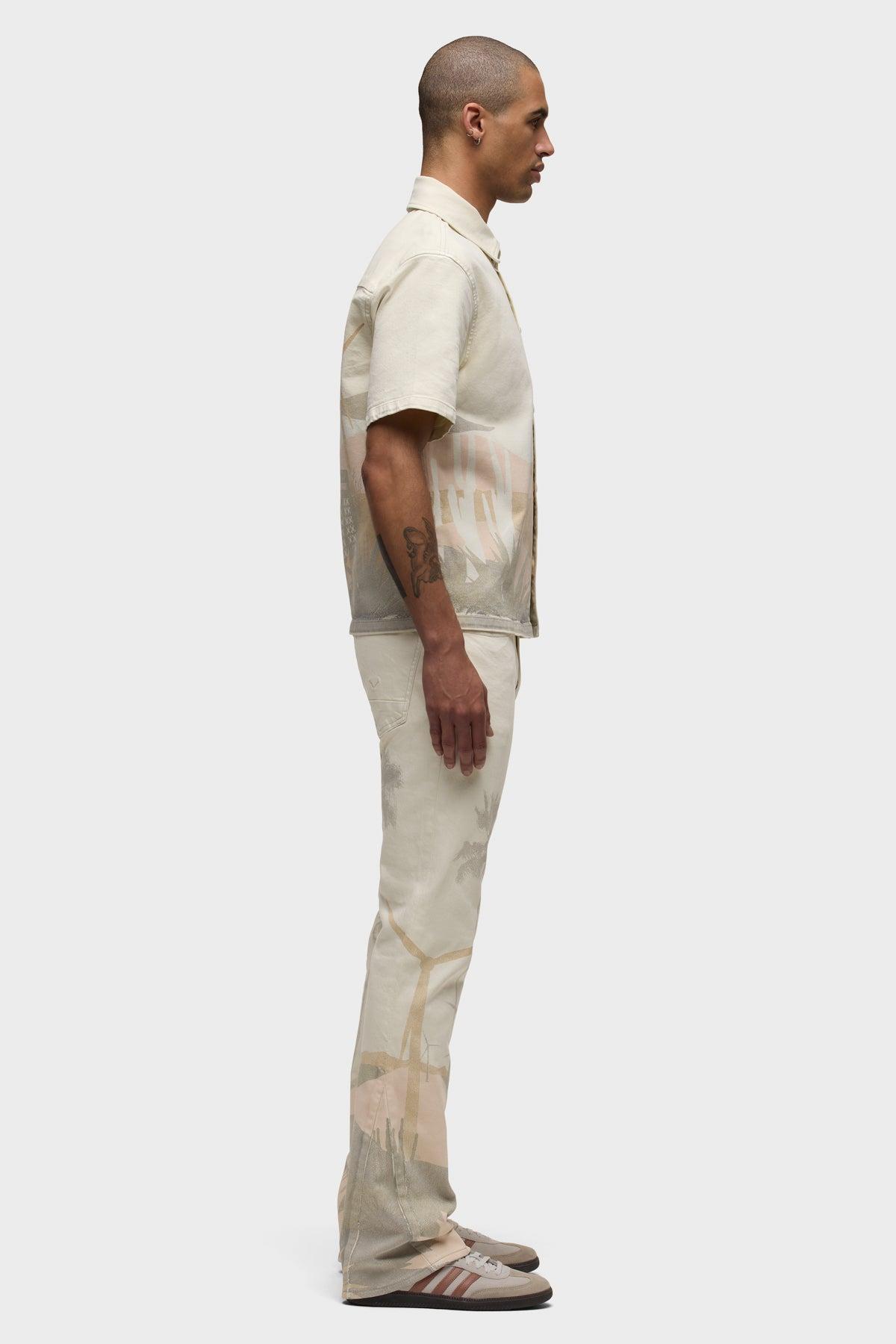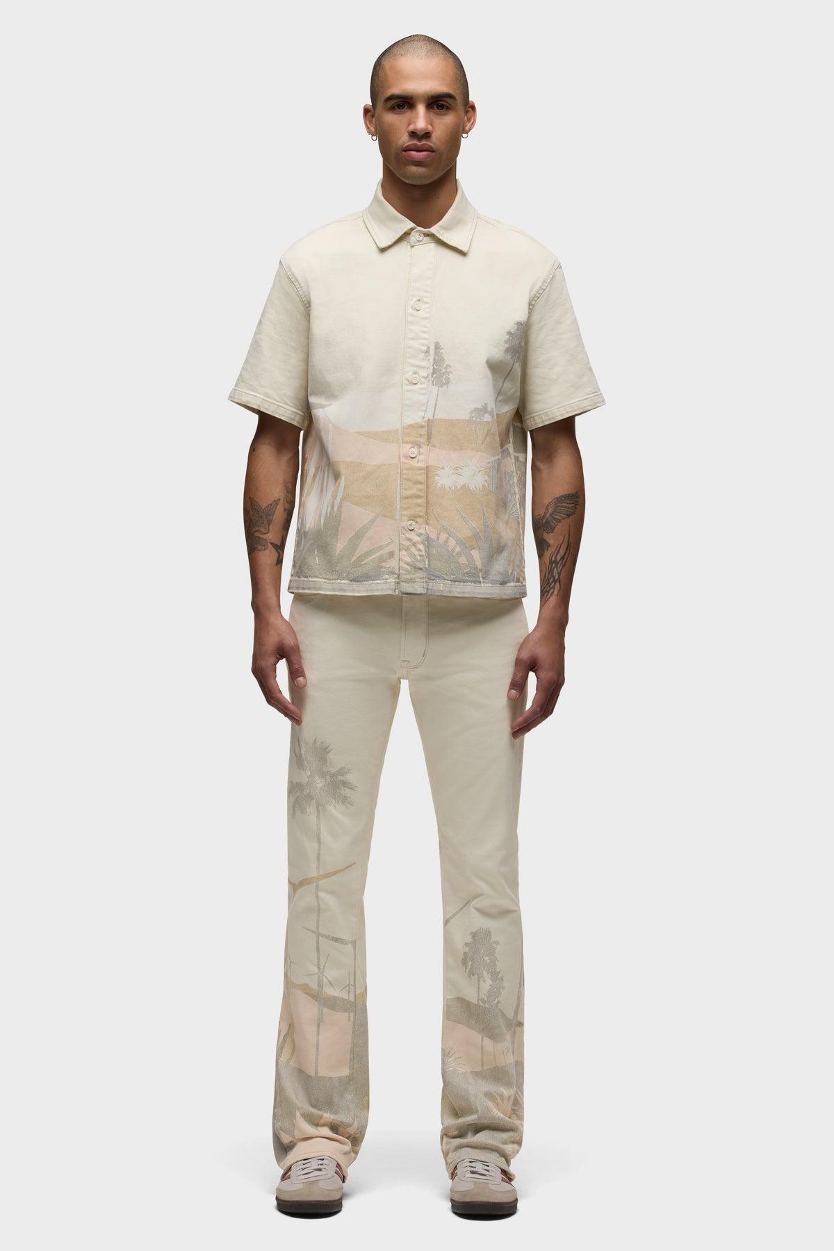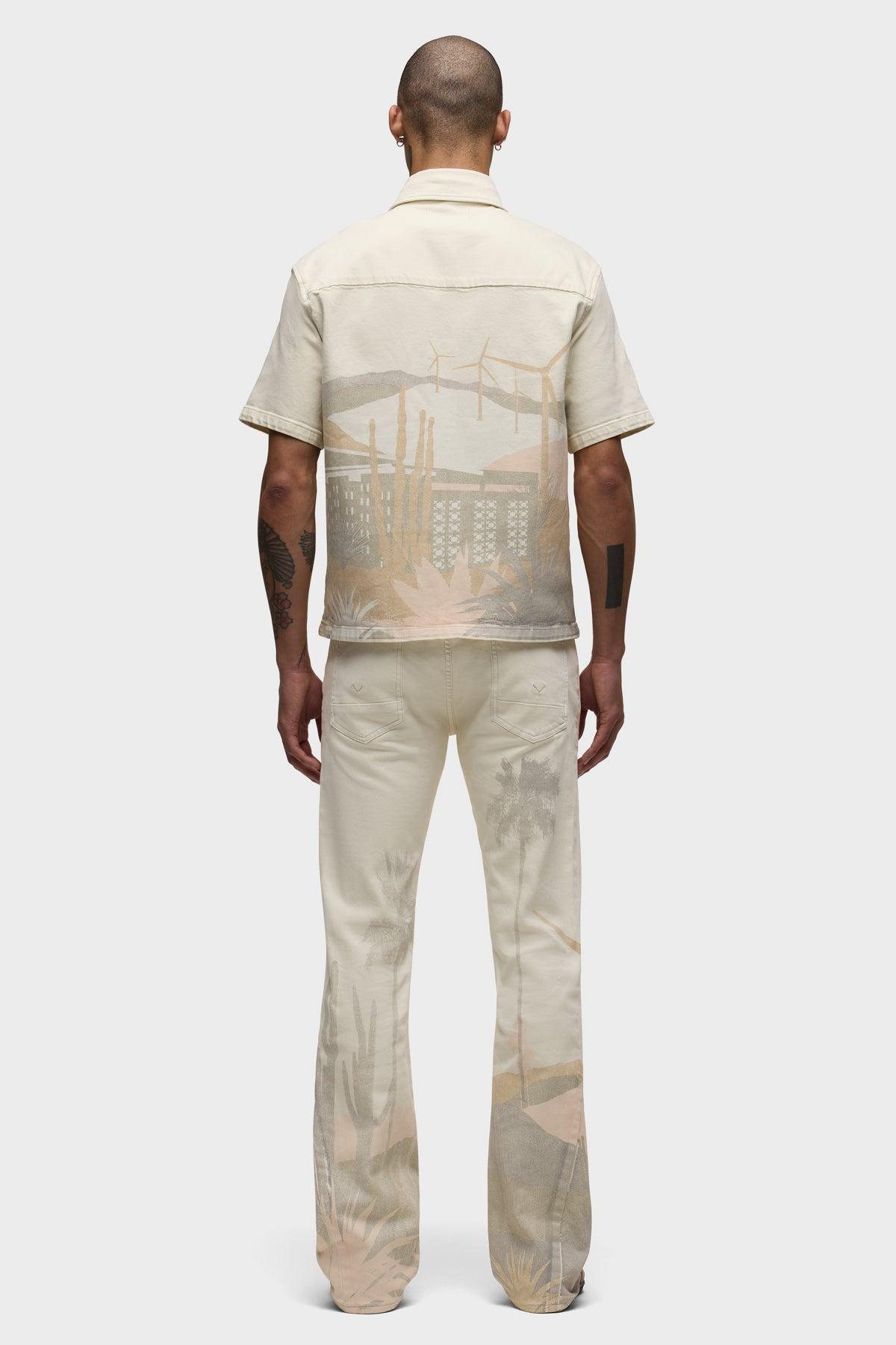 Description Our Walker Kick Flare Pant in Natural Desert is mid-rise and slim through the hip and thigh with a flared bootcut hem. This pair is made of stretch twill fabric in a light ecru wash with an all-over graphic print. Classic five-pocket detailing, contrast topstitching, dull nickel hardware and Hudson embroidery on the back waistband finish the look. Product Details Front Rise: 10.75", Leg Opening: 19", Inseam: 34"Model Height 6’1"Model wearing size 32Measurements based on size 32 Fit & Care Content: 99% Cotton, 1% ElastaneMachine wash cold with like colorsDo not bleachTumble dry low or hang to dry