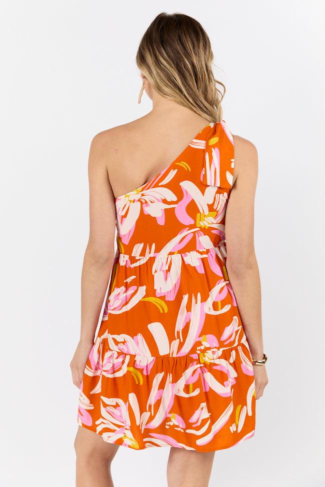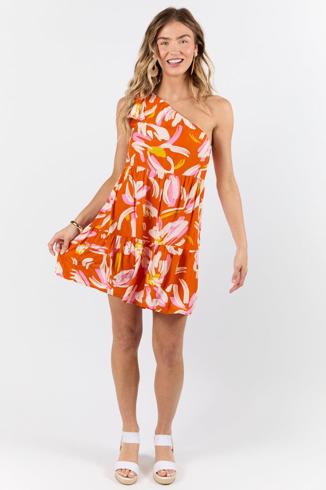 Details Red Floral Printed One Shoulder Dress Fabric has no stretch One shoulder with decorative tie, side zipper closure Lined Size small from shoulder to hem: 23.5" Material and Care 100% viscose Machine wash cold, no drum drying Patterns may vary Materials may have natural variations Colors may vary from different viewing devices.