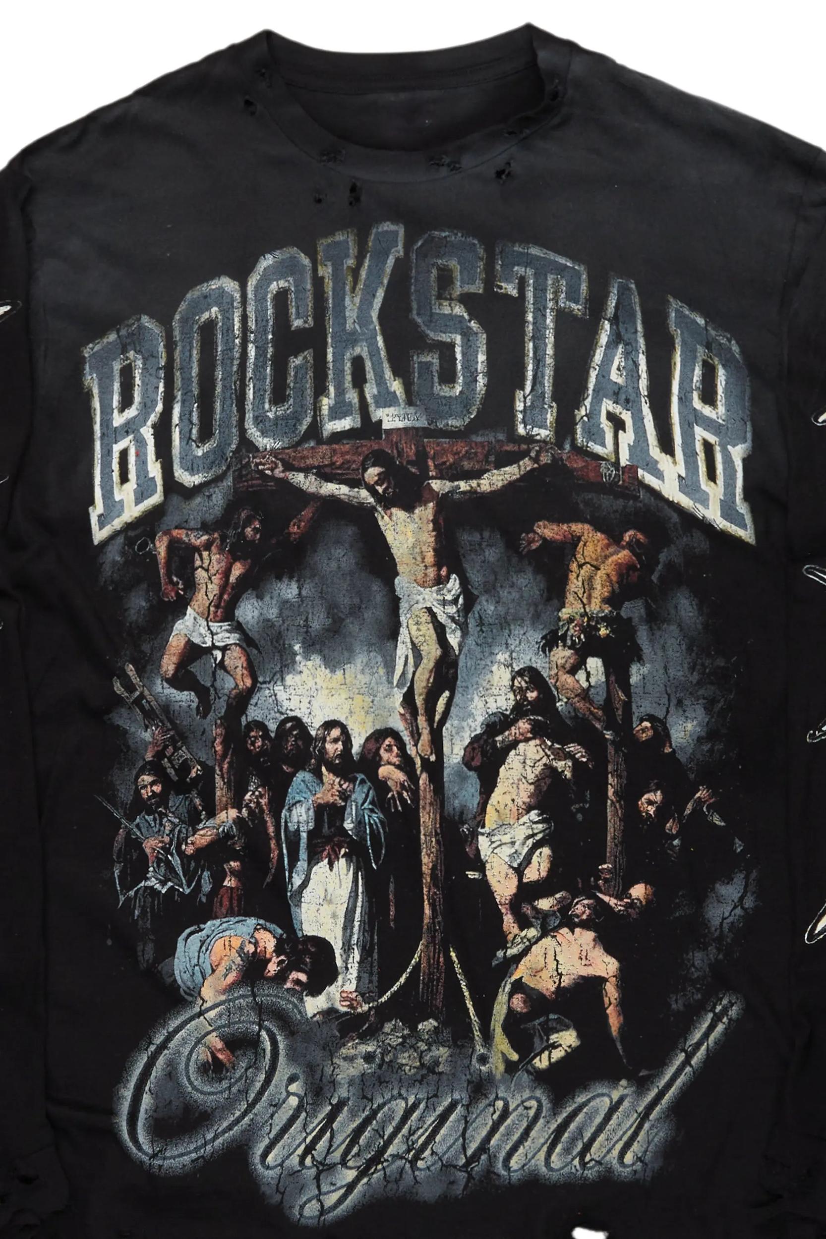 An urban long sleeve tee for men in black. Designed with organic cotton and custom printed detailing for a comfortable streetwear style. Crew neckline Long sleeves Ribbed knit trims Relaxed-fit Pullover style Deconstructed hem#bulletpoints##split##80% Cotton#20% Polyester#Dry Clean Only Custom printed graphics Printed RSO logos