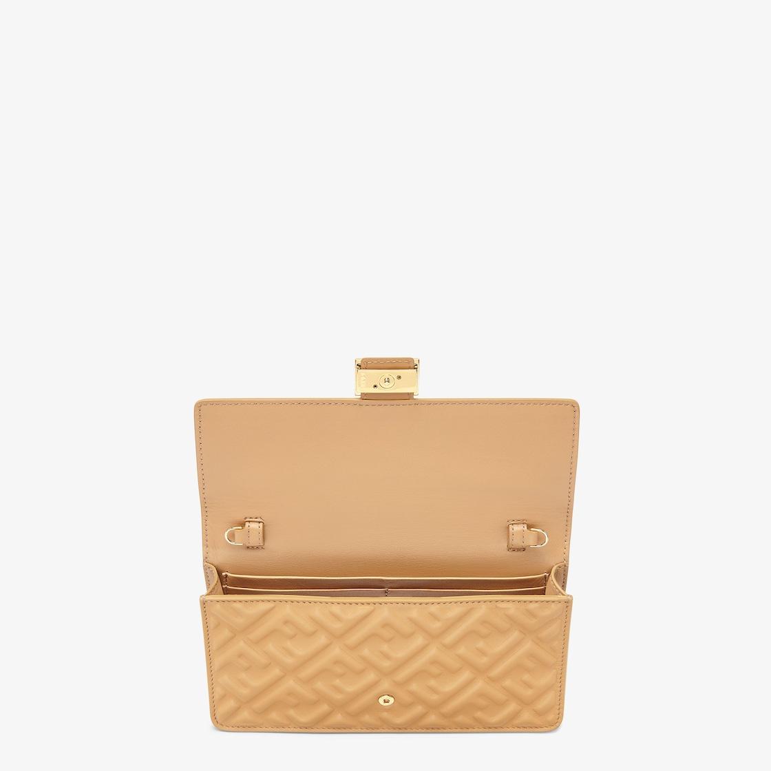 Compact Baguette wallet with flap and FF clasp. Interior compartment with six card slots. Double shoulder strap, an adjustable leather option and a detachable thin chain option: to carry the bag like a clutch, under the arm or wear it cross-body. Made of shiny, light brown nappa leather with a three-dimensional, embossed diagonal FF motif. Gold-finish metalware. Made in Italy