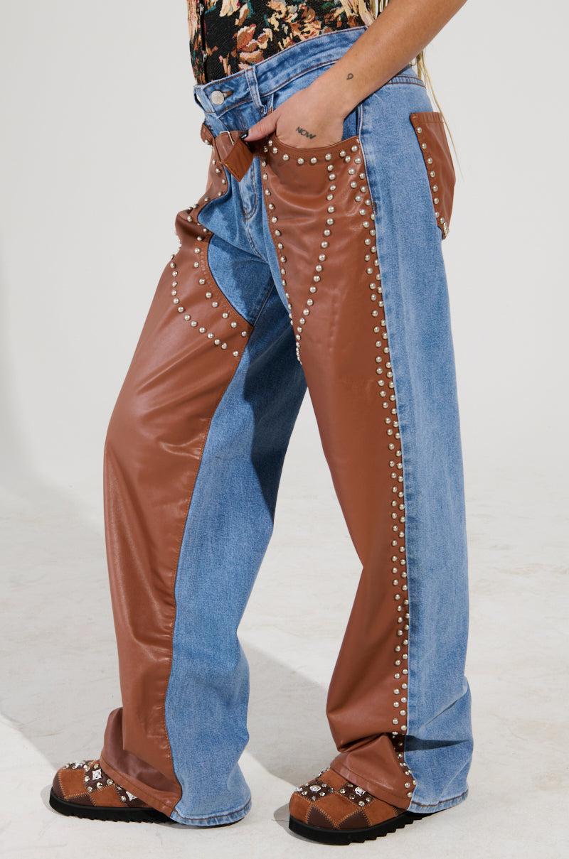This ain’t your first rodeo in The AKIRA Label Wanna Be Denim Pant. These unique bottoms are crafted from a slightly stretchy, cotton light wash denim base and features a high rise design, functional belt loops, side slant front pockets, contrast faux leather bottomless chaps-inspired paneling on the front with a functional buckle accent across the crotch, faux silver metallic stud embellished trim, and coordinating faux leather dual rear pockets with stud detailing trim. Complete with a button zip front closure, and a wide leg silhouette. Pair with a cropped vest and cowboy boots to truly embody the Western look. - Main: 99% Cotton 1% Spandex, Trim: 50% PU 50% Polyester- Spot Clean Only- Slight Stretch- Imported (all measurements taken from size small)- 11” Rise- 32” InseamProduct ID: 441573 (all measurements taken from size 1X)- 12” Rise- 32” InseamProduct ID: 441577