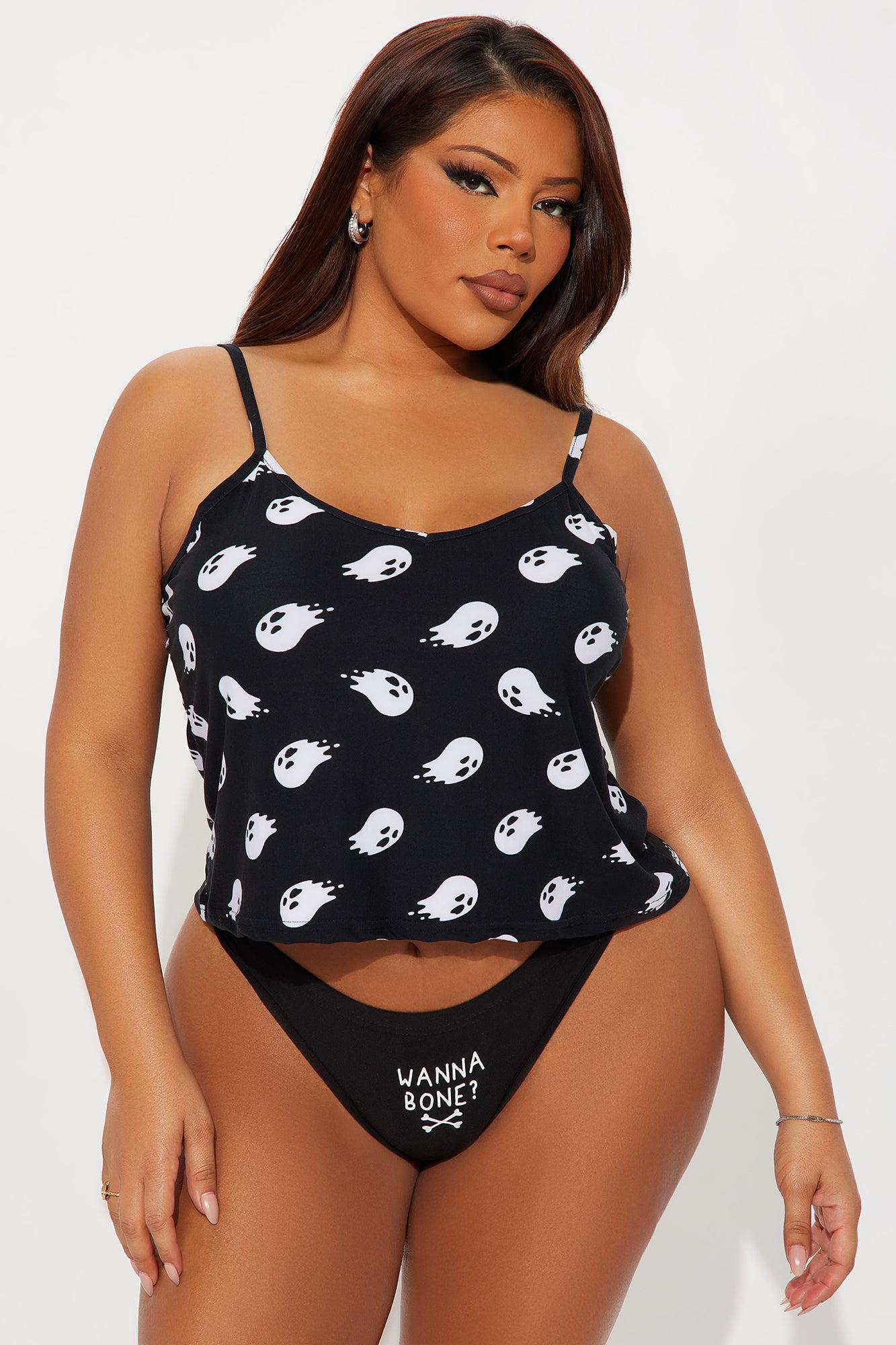 Available In Black/White. 2 Piece Set Cami Top Adjustable Straps Thong Panty Halloween Print Stretch Final Sale Self : 95% Polyester 5% Spandex Imported
