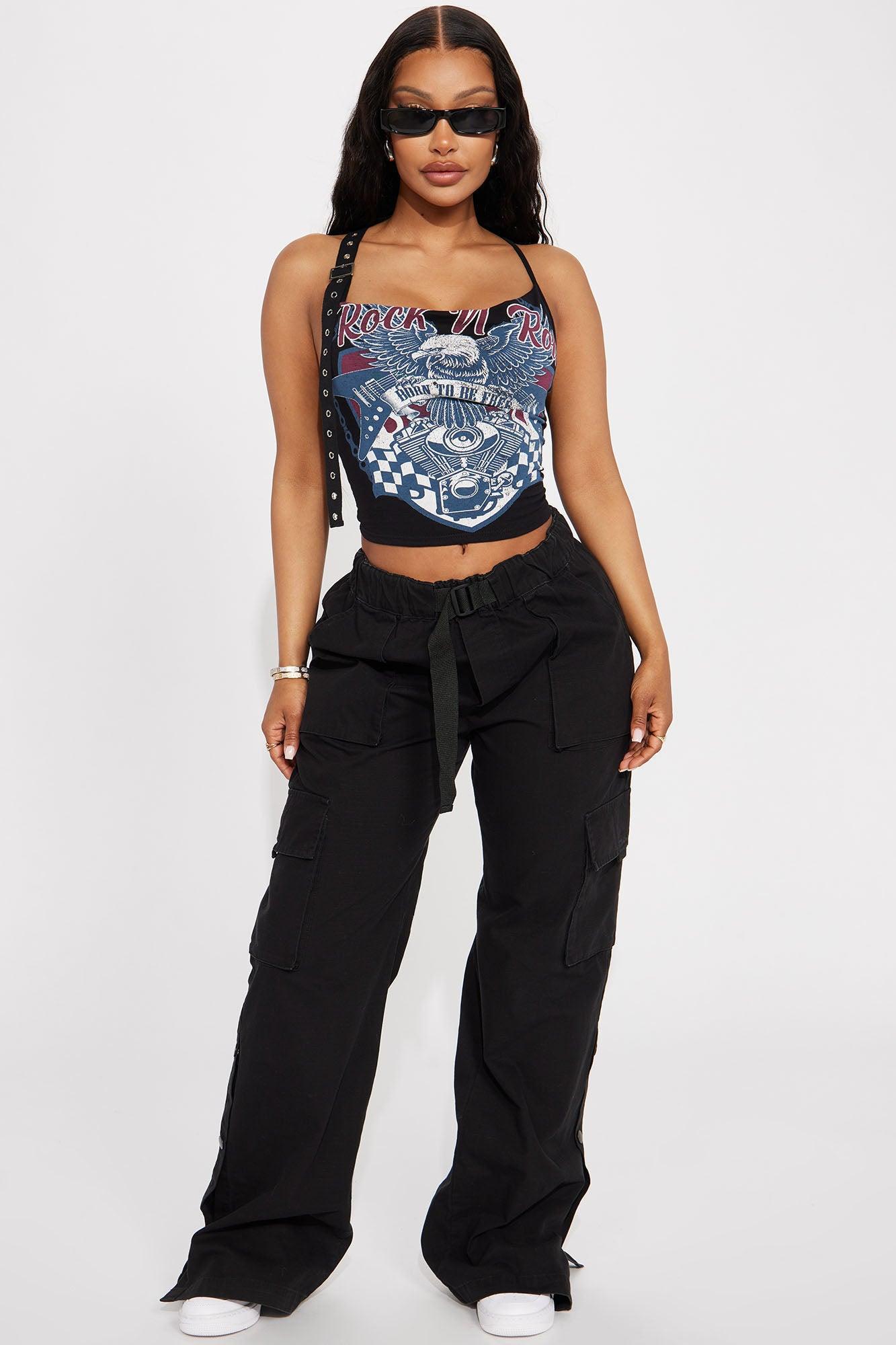 Available In Black. Halter Top Sleeveless hardware Detail Front Screen Cropped Stretch Disclaimer: Due To The Printing Process A Difference In Saturation May Occur. Each Garment Is Unique. 95% Cotton 5% Spandex Imported California Proposition 65WARNING: Cancer and Reproductive Harm - www.P65Warnings.ca.gov.