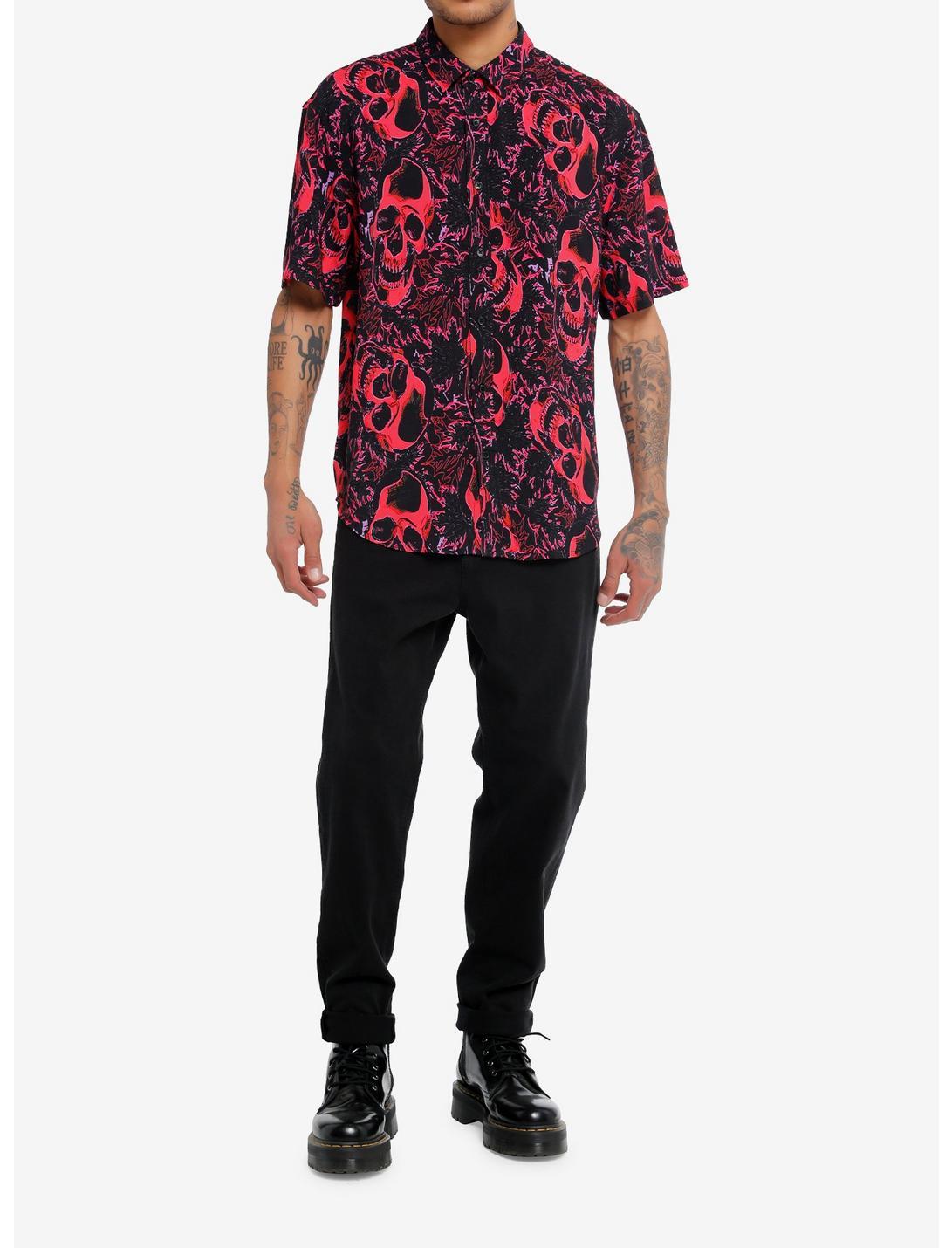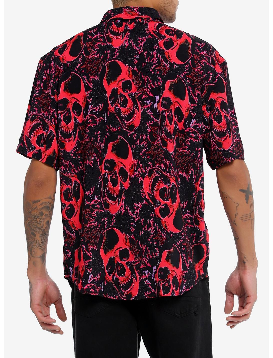 This slightly oversized woven button-up has a trippy, bring pink print of warped skulls and jagged shapes in the background, with tinges of pastel purple.100% rayonWash cold; dry lowImportedListed in men's/unisex sizesModel is 6'1"Model wears size Medium