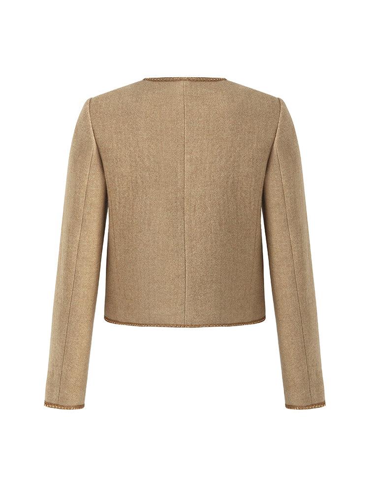 -Wool -Washable -H-line fit The jacket is made of washable wool fabric, easy to care for, and has a luxurious feel. It features a loose H-shaped cut design, providing both comfort and warmth. The golden piping along the edges adds a touch of luxury and refinement. With its square shoulder design, the jacket emphasizes
