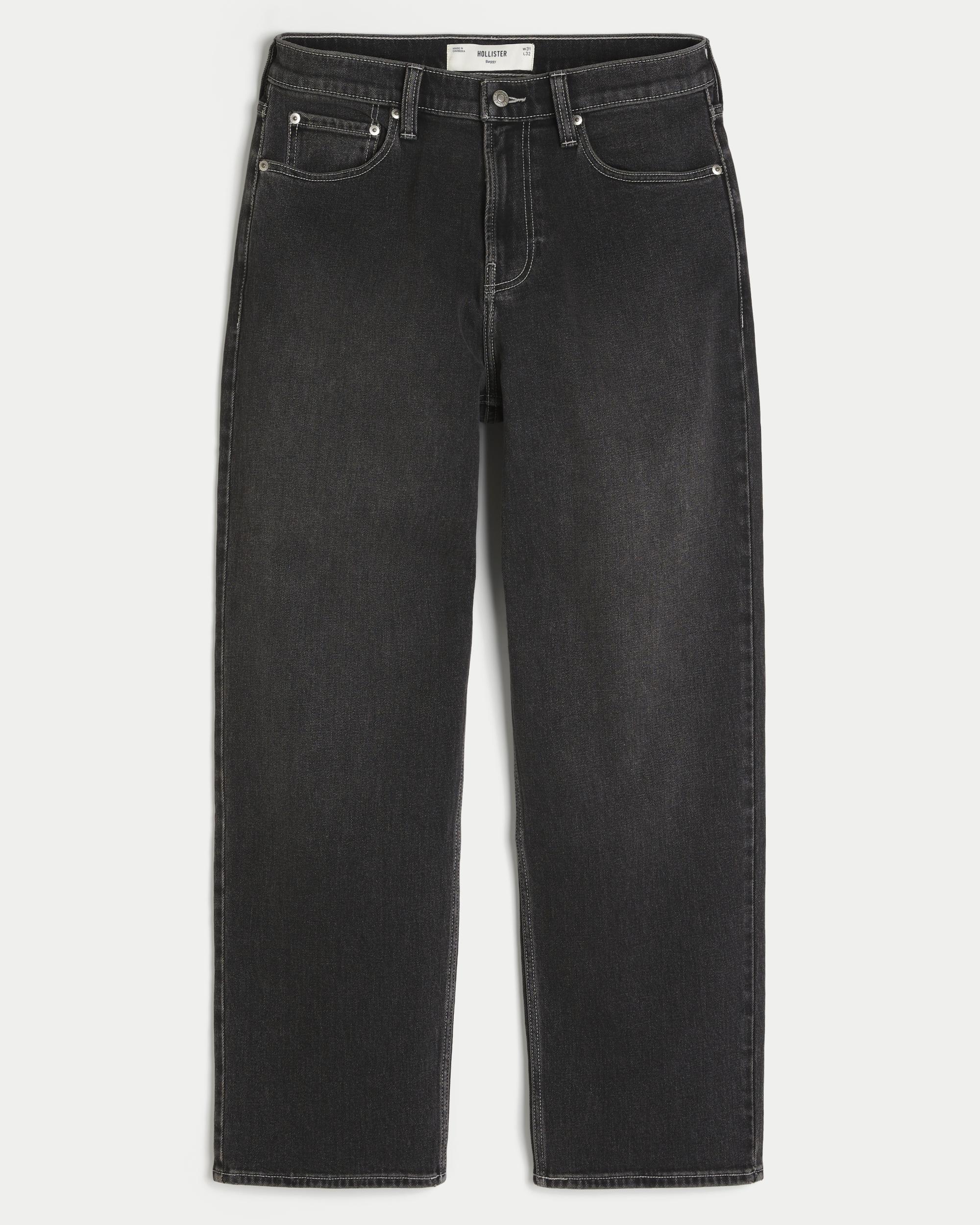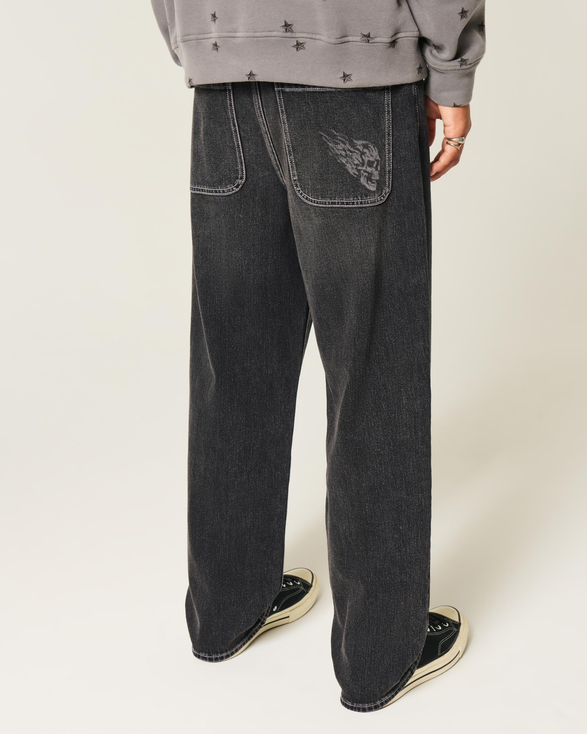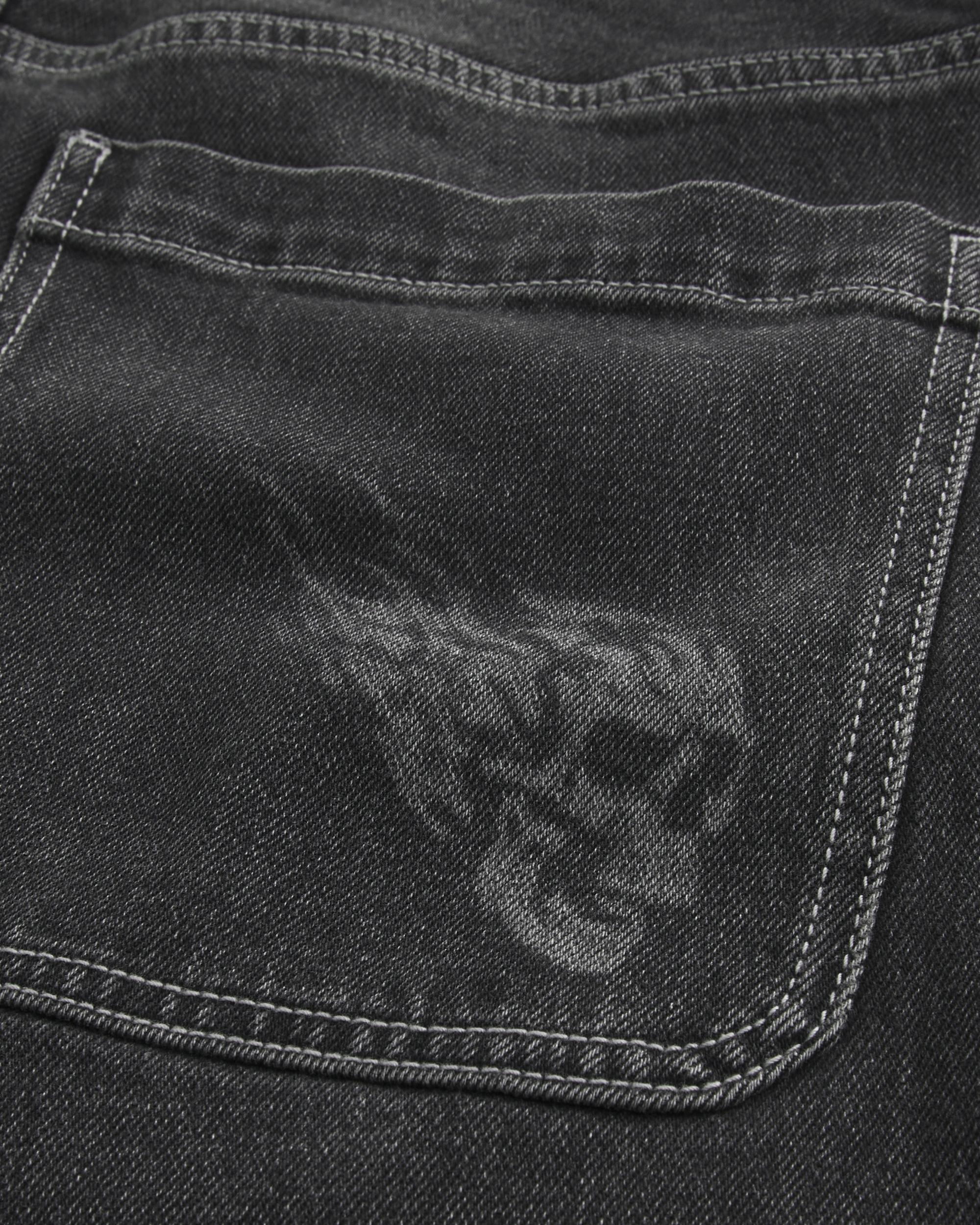 Comfortable denim jeans in washed black, designed with a baggy leg. Fading, skull graphic at back pocket.