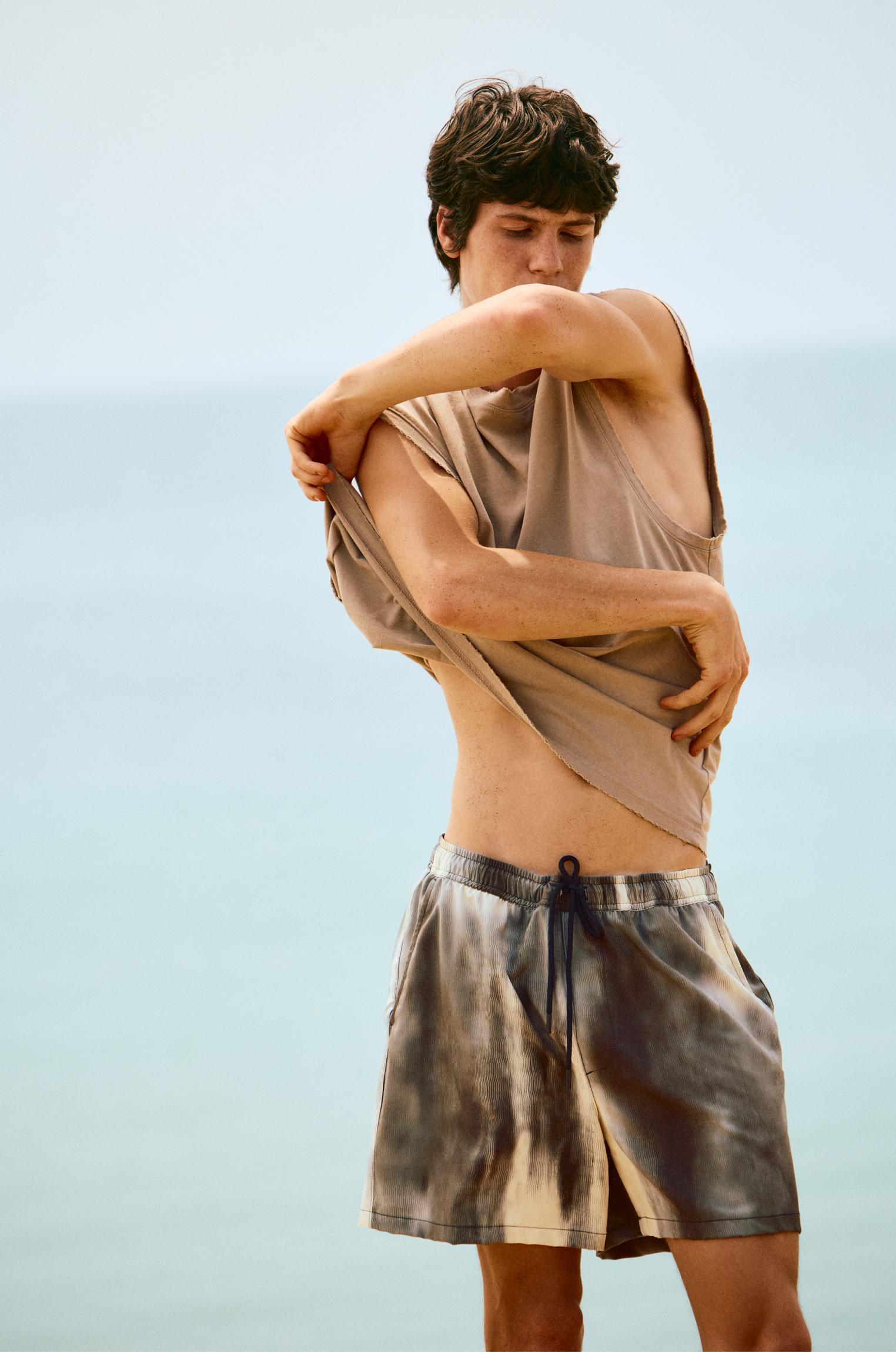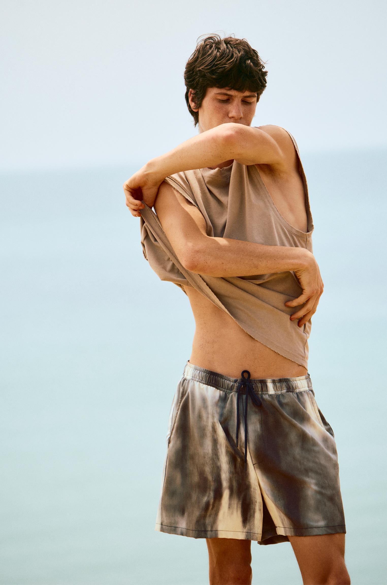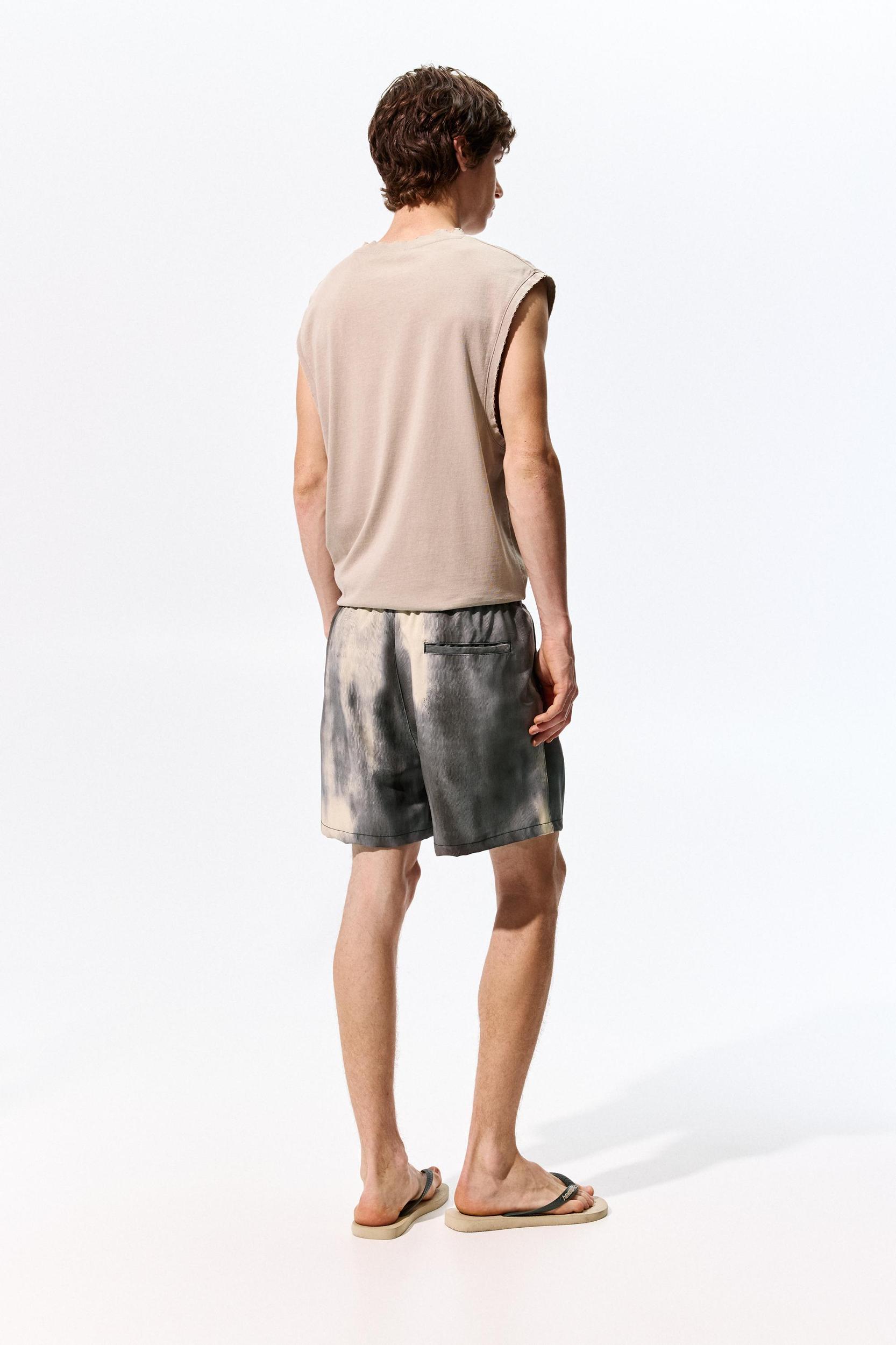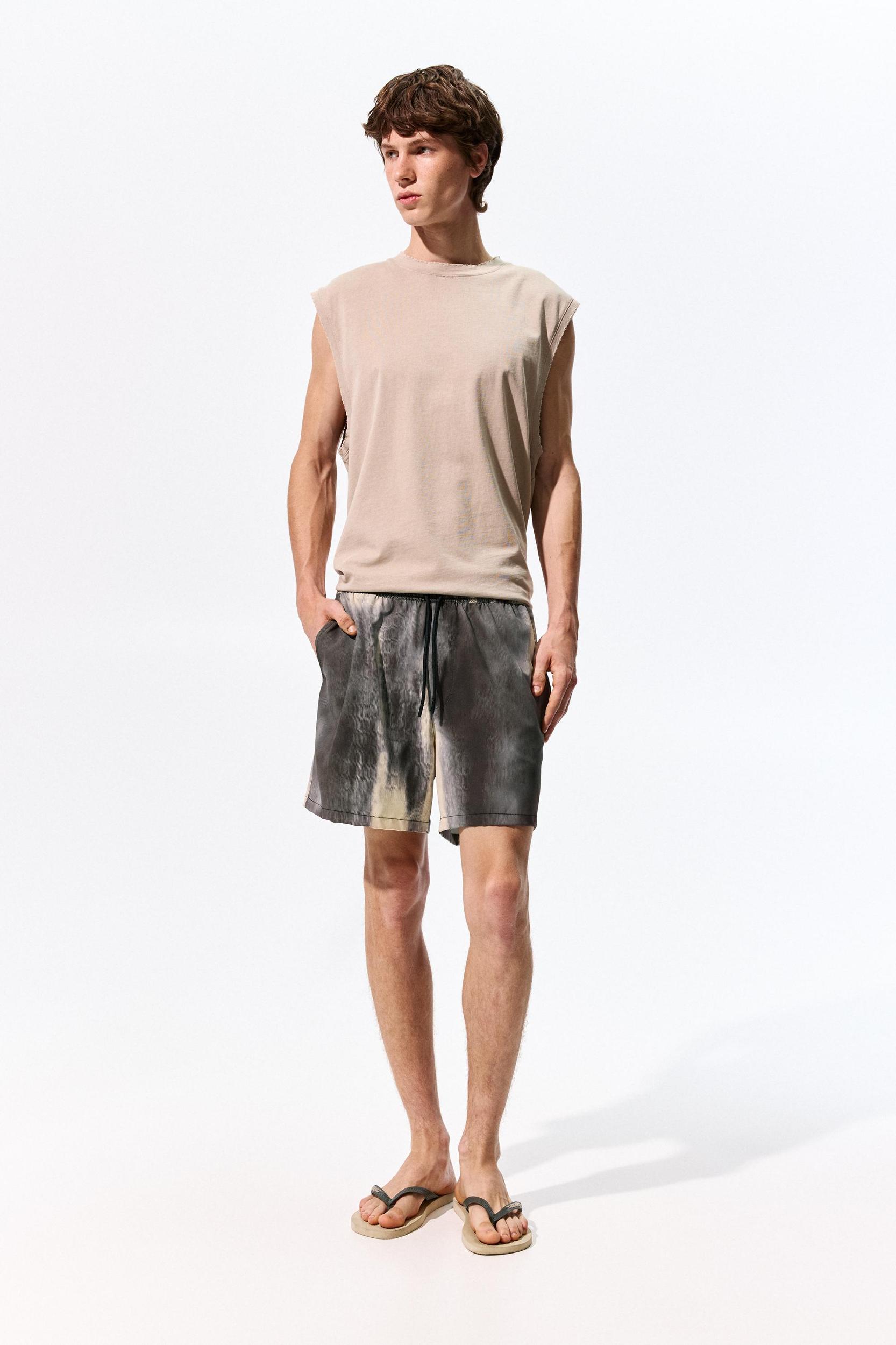 Board shorts with a washed print, pockets and an elastic drawstring waistband.