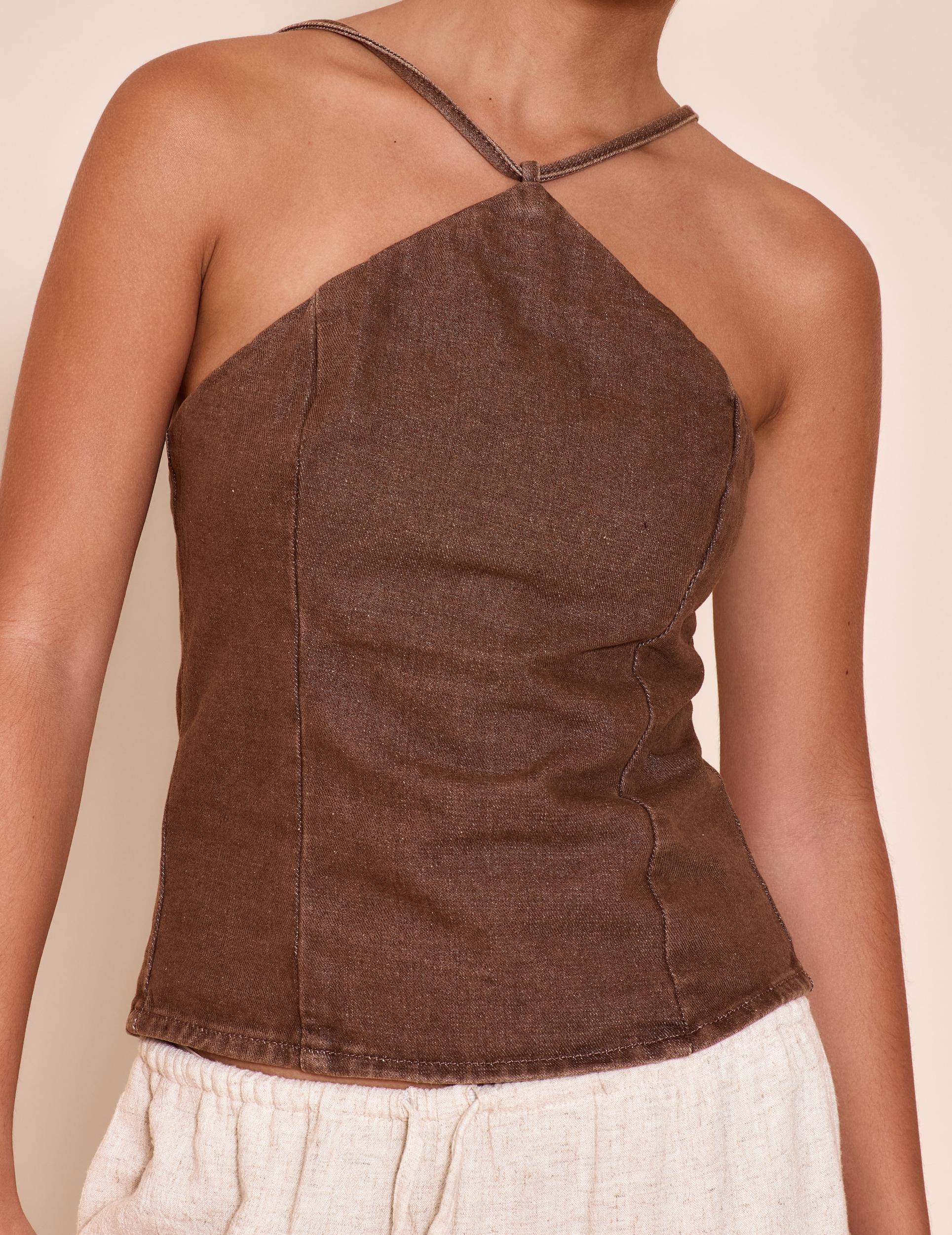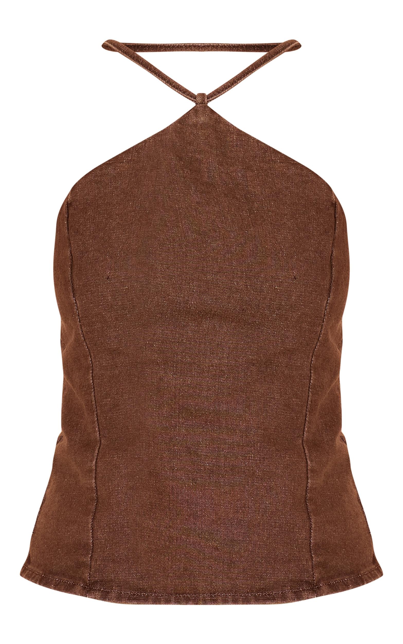 Give denim a twist with the washed brown halterneck knot detail stretch denim top. Made from a washed brown stretch denim material, this halterneck features a fitted silhouette. Pair with a pair of wide-leg pants and sandals a chic finish we are loving right now.Length approx 48.5cm/19inch (Based on sample size US 4)Model wears size UK 8/ EU 36/ AUS 8/ US 4Model Height - 5ft 7inchp]:!mb-4inch>Brand: PrettyLittleThingCategory: DenimProduct type: Denim TopColor: Washed BrownMaterial: Stretch DenimDesign: PlainSleeves: SleevelessOccasion: Day