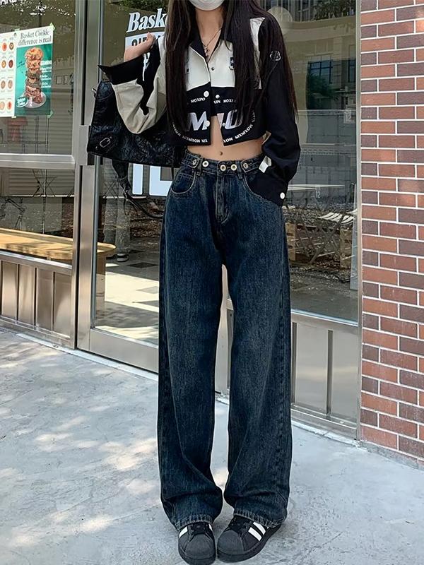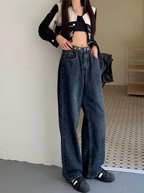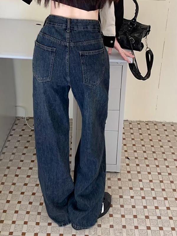 Washed Dark Blue Eyelet Decor High Waist Boyfriend Jeans