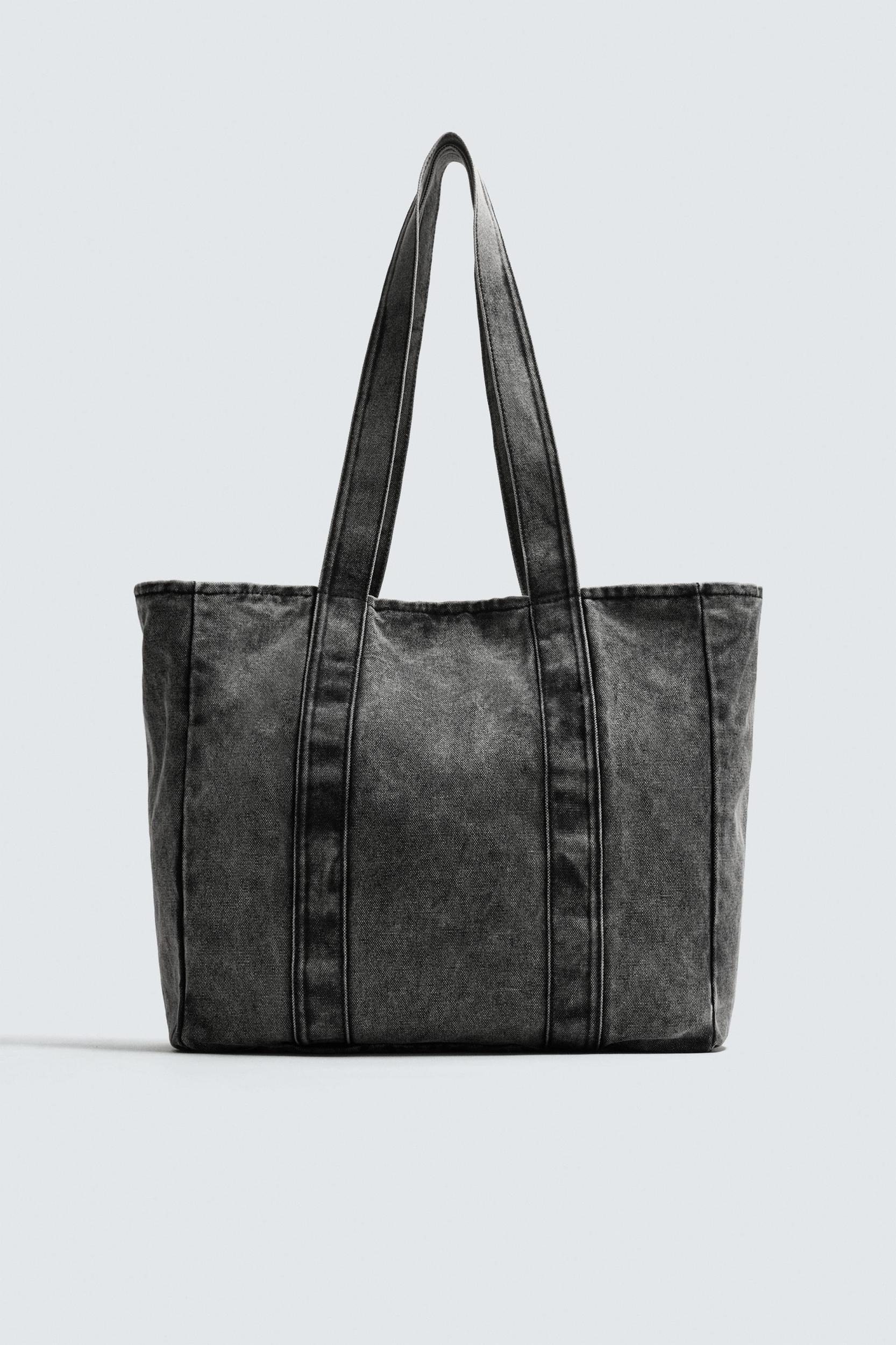 Shopper bag made of washed effect cotton denim. Main compartment with snap button closure. The interior has a zippered pocket. Two handles. Height x Length x Width: 13.8 x 15.4 x 5.9 inches (35 x 39 x 15 cm)