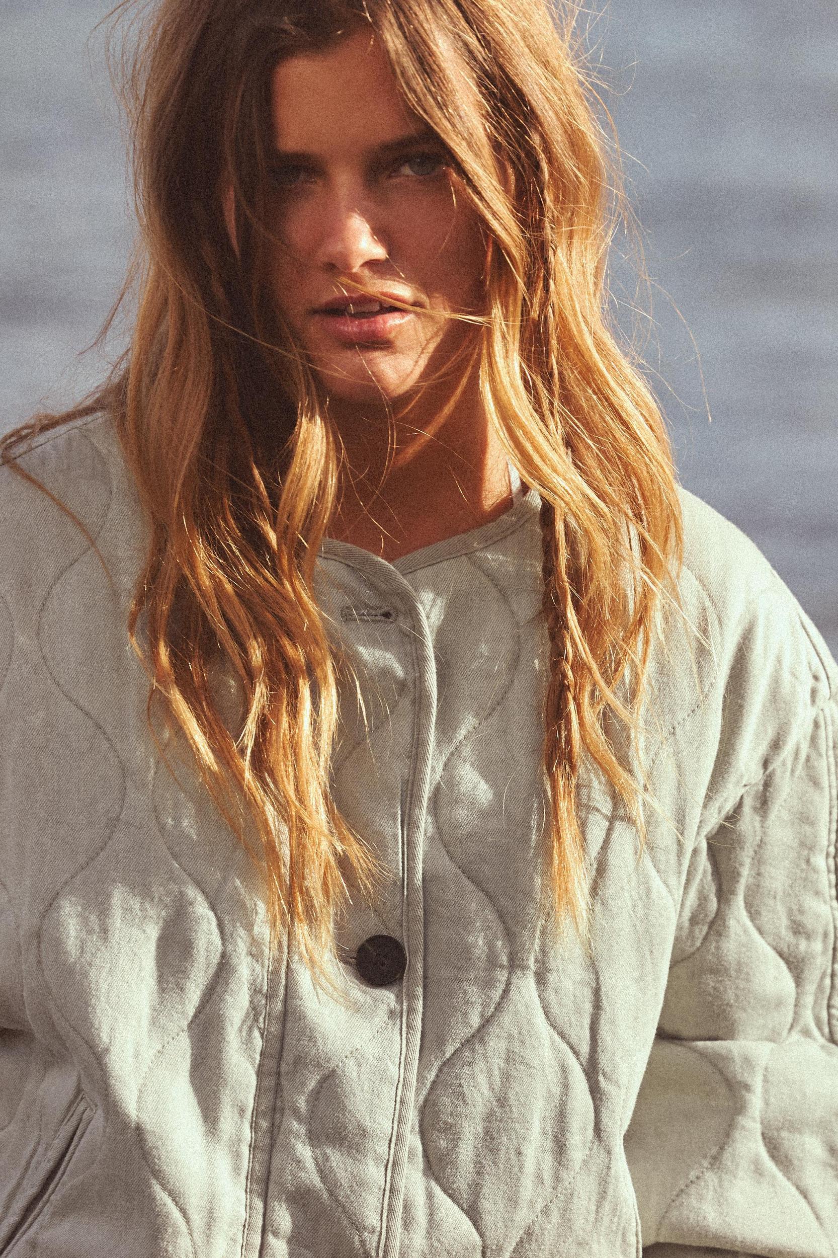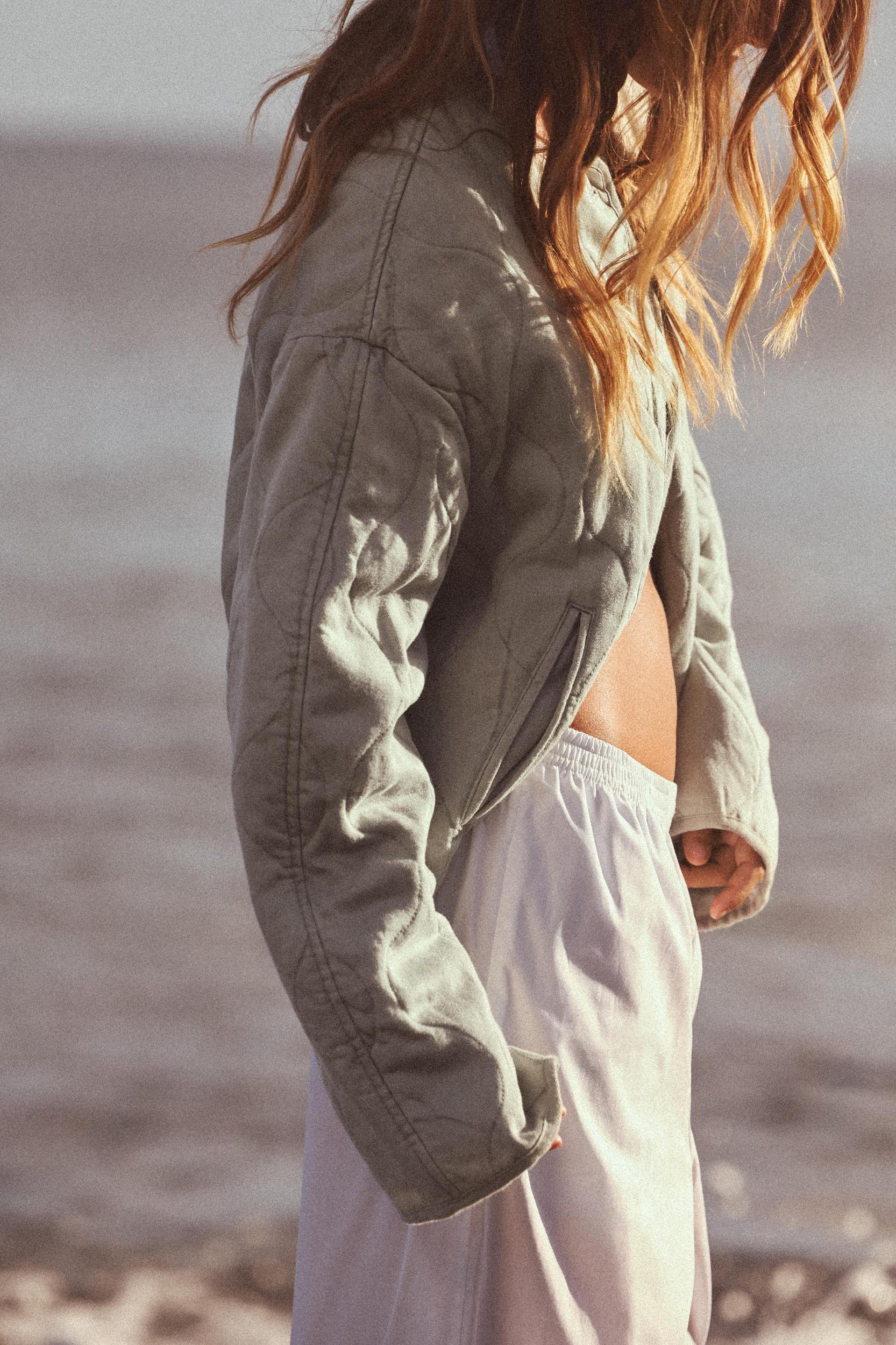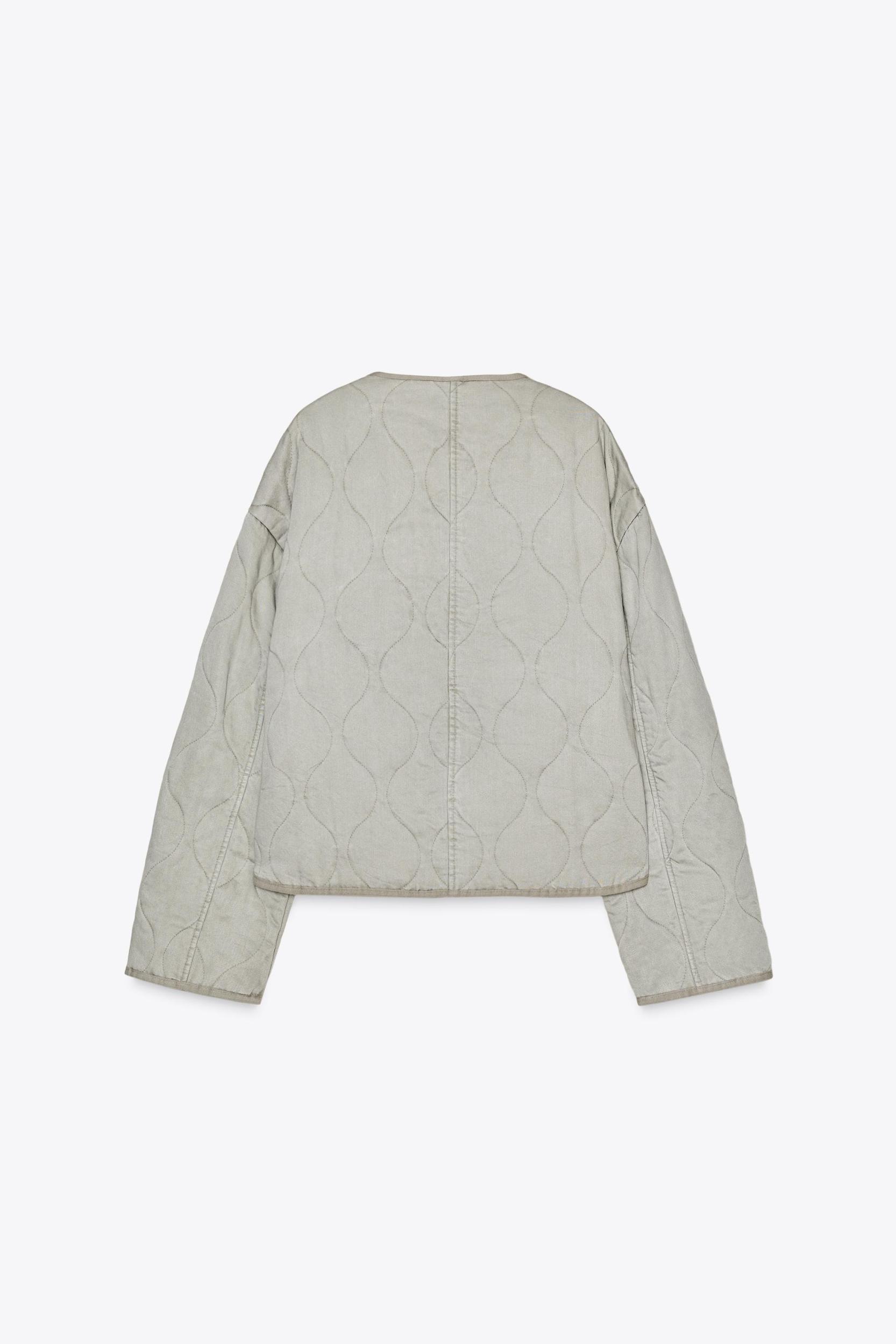 Quilted jacket with round neck and long sleeves. Welt pockets on front. Front button closure.