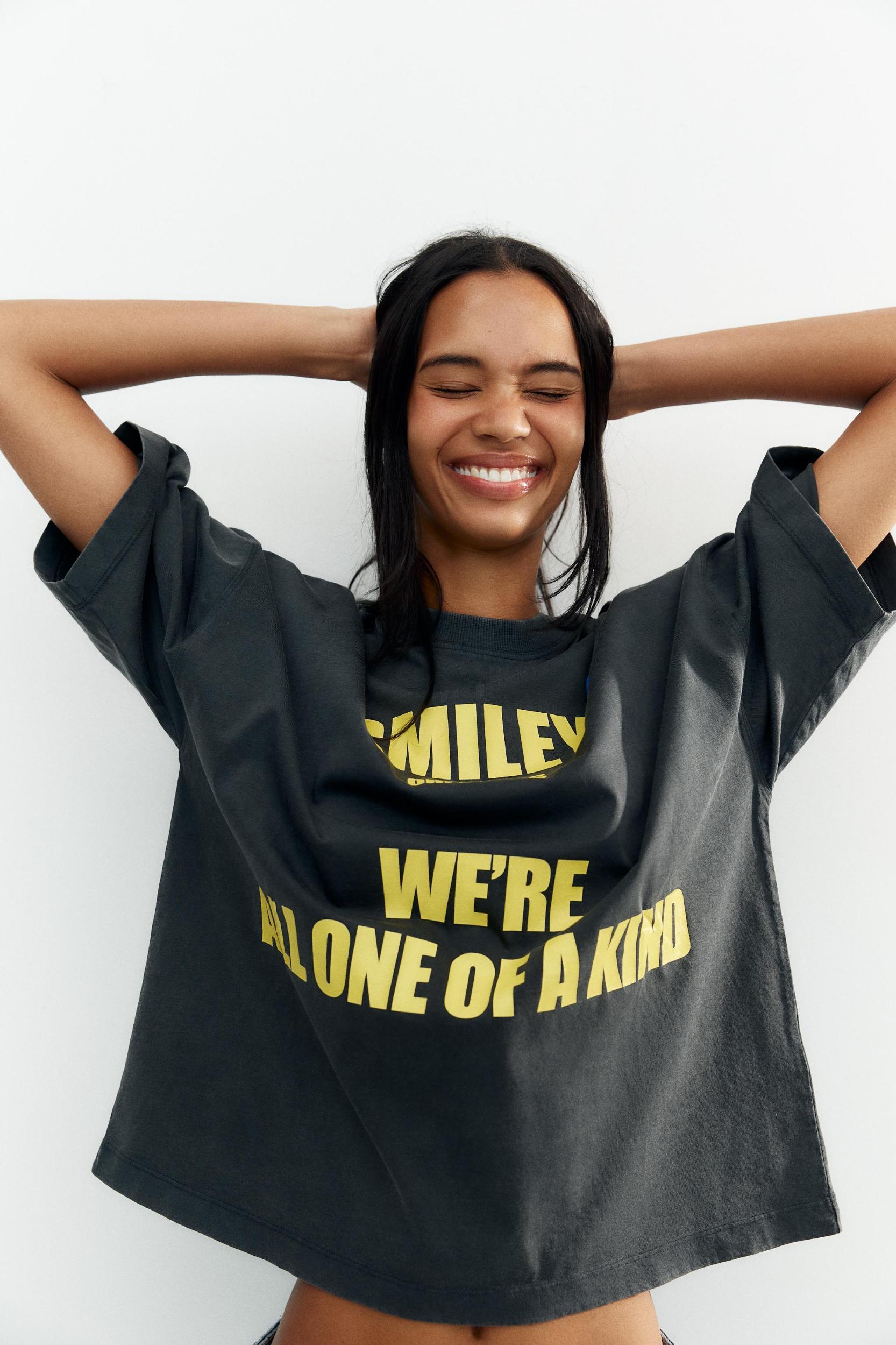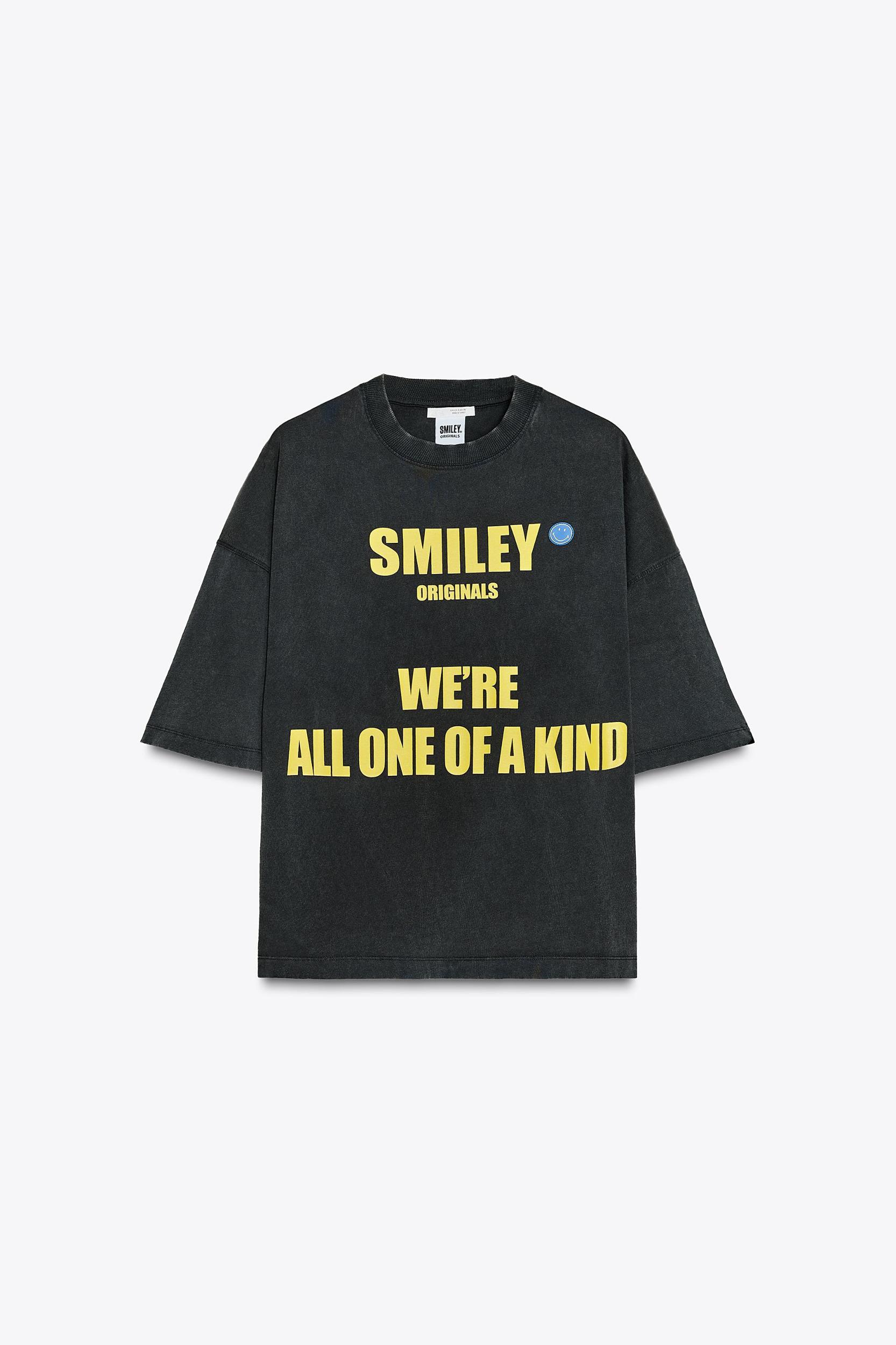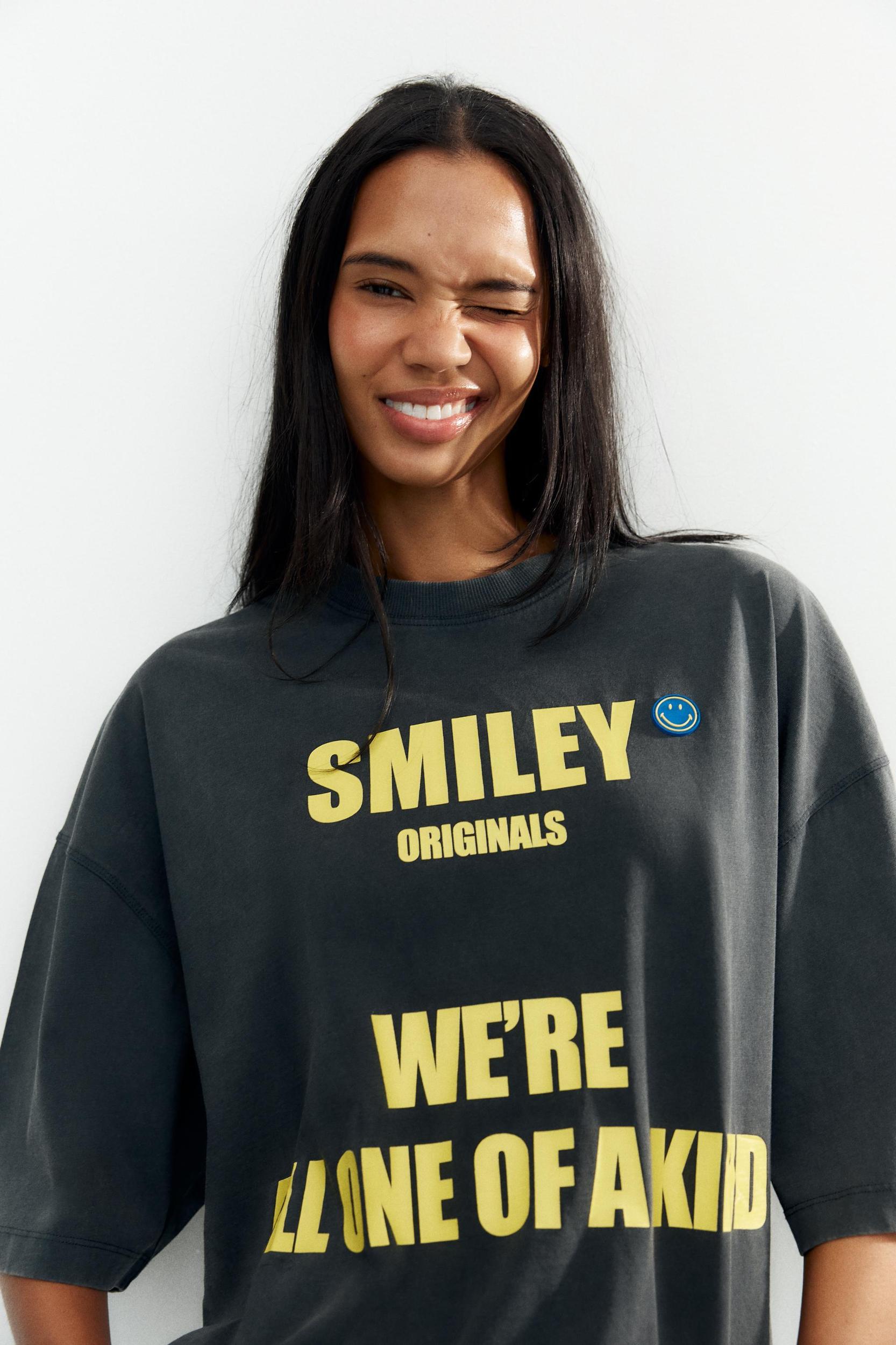 MIDWEIGHT - REGULAR FIT - ROUND NECK - NORMAL LENGTH - SHORT SLEEVE T-shirt made of 100% cotton yarn. Round ribbed neckline and short sleeves. Smiley® TM & © 1971-2025 The Smiley Company print detail.