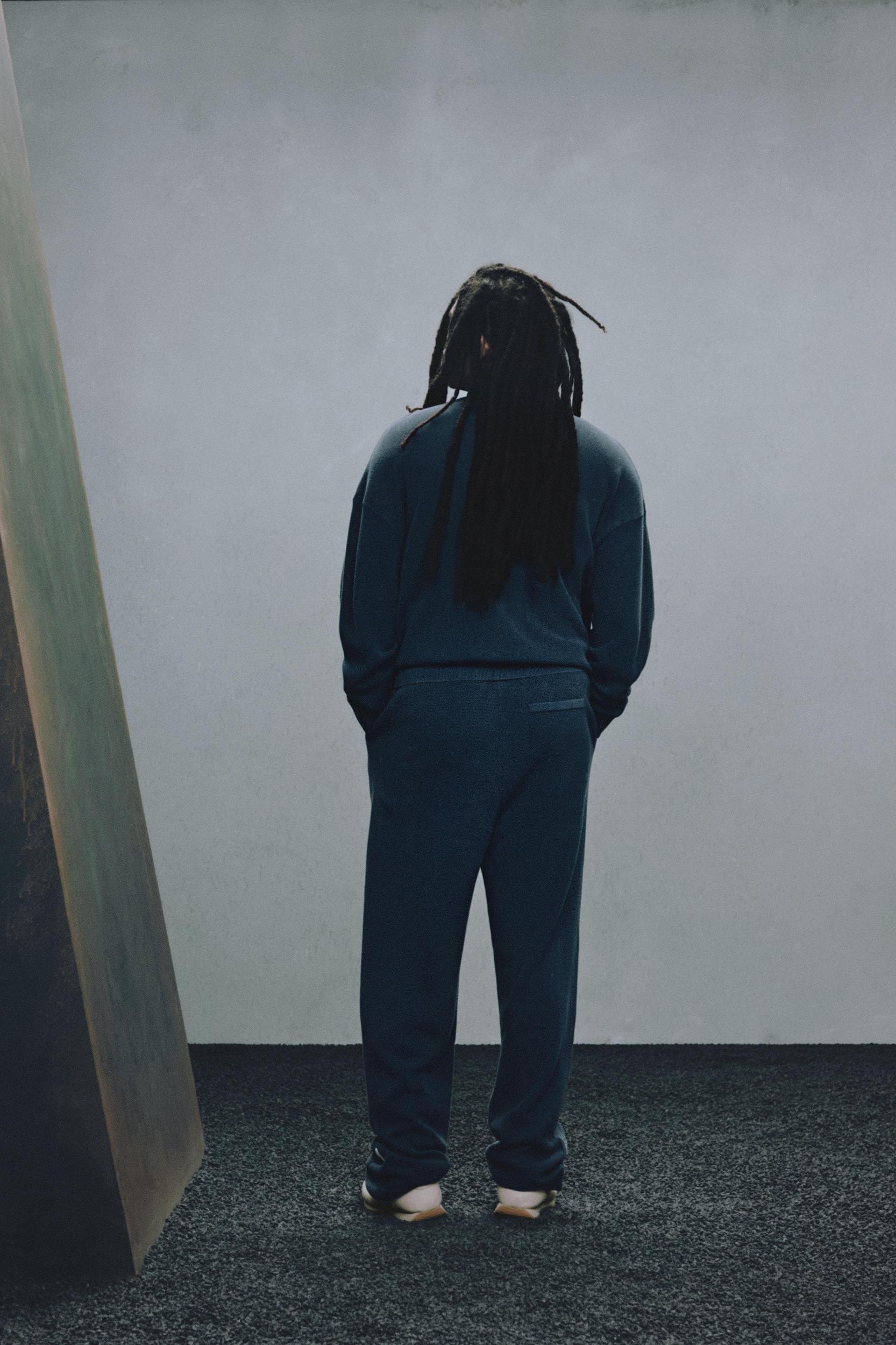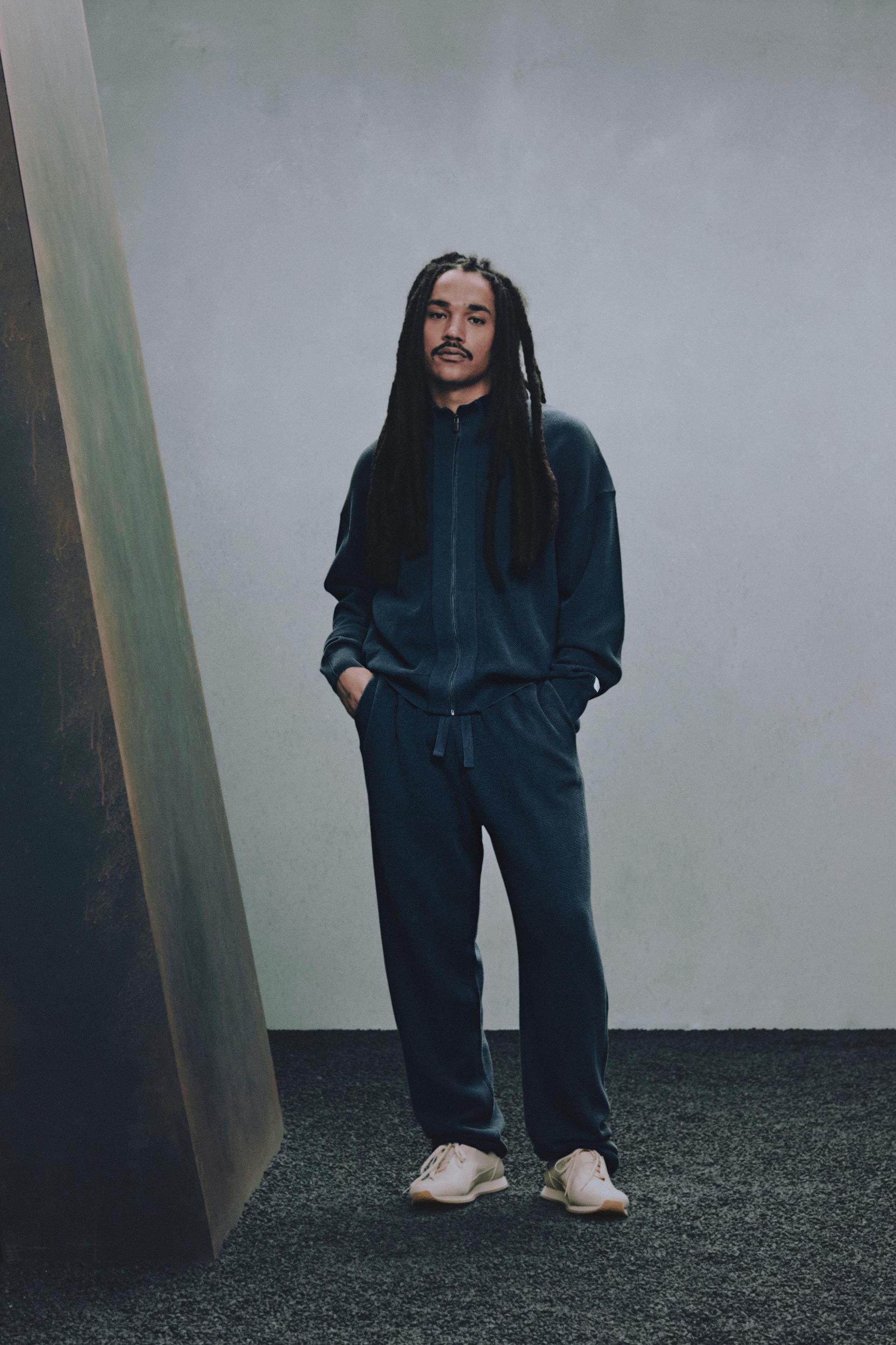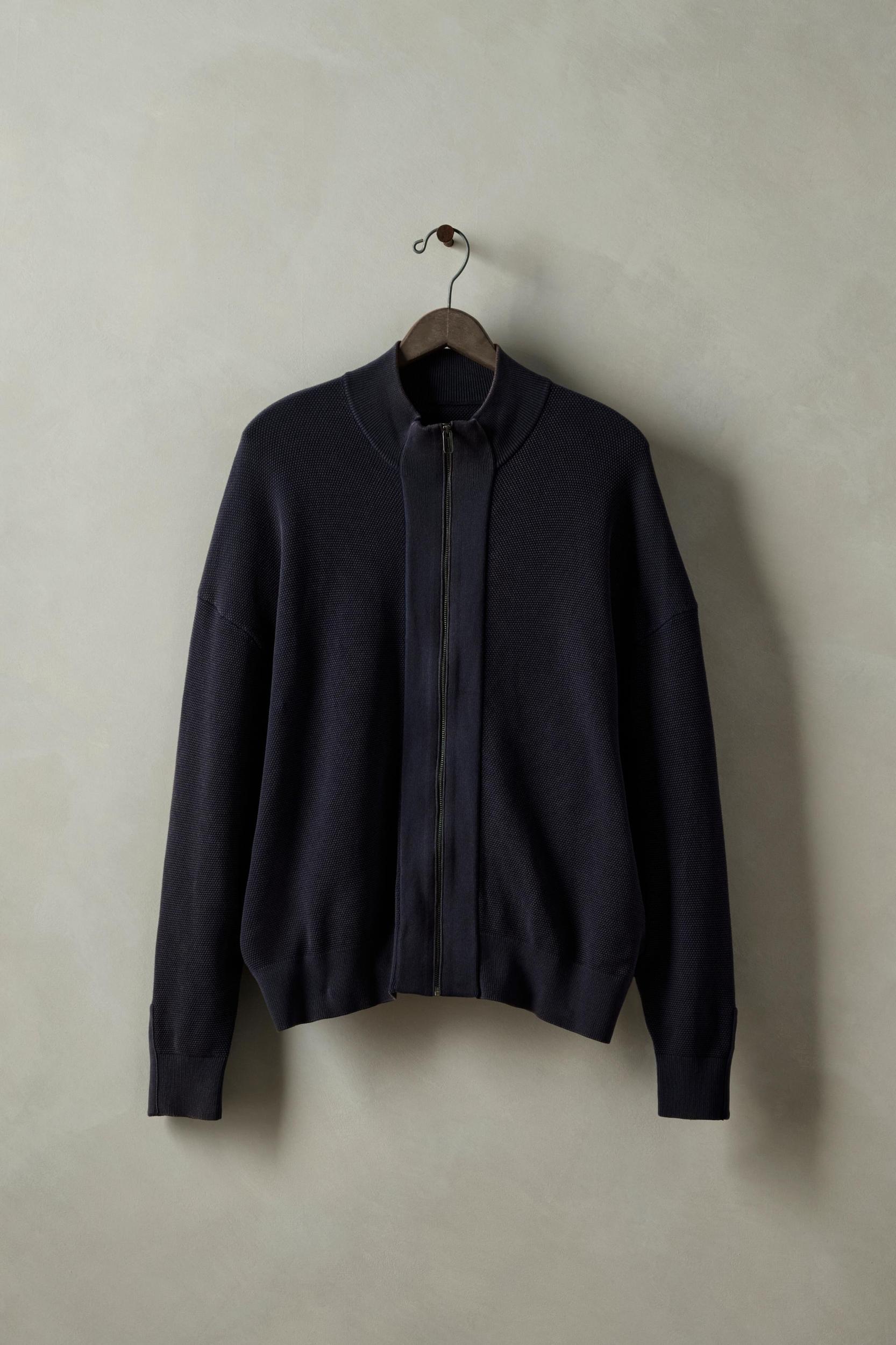 Relaxed fit knit jacket in a cotton yarn. Featuring a Perkins collar, long sleeves, side pockets with snap button fastening, a washed effect, logo appliqué on the cuff, ribbed trims and a front zip fastening.