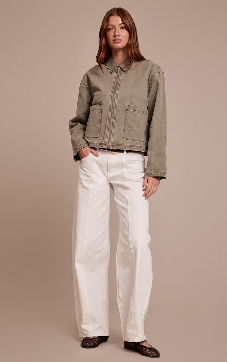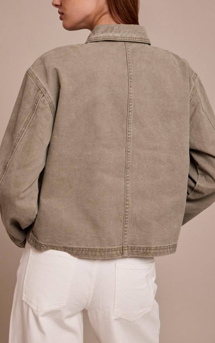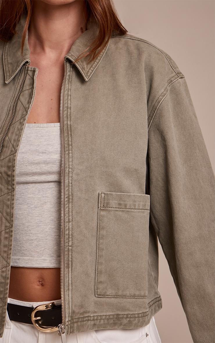 A confident take on utility outerwear defines your day with the washed olive carpenter denim jacket. This essential piece boasts a relaxed, subtly oversized silhouette, framed by a sharp collar and dropped shoulders, all secured with a sleek full-length zip fastening. Distinctive carpenter-style patch pockets and visible stitch detailing lend an artful, purposeful edge to its cropped cut. For an effortlessly composed look, layer this over a simple ribbed Vest and tailored wide-leg pants, then elevate your aesthetic with sleek brown heels and a structured black bag to affirm a knowing command of contemporary style.Length approx 48.5cm/19inch (Based on sample size US 4)Model wears size UK 8/ EU 36/ AUS 8/ US 4Model Height - 5ft 9inchp]:!mb-4inch>Brand: PrettyLittleThingCategory: DenimProduct type: Cropped Denim JacketColor: Washed OliveMaterial: Rigid DenimOccasion: Day