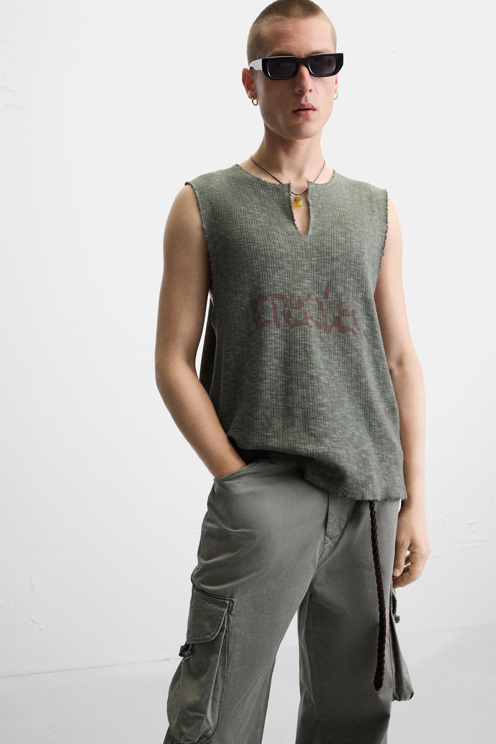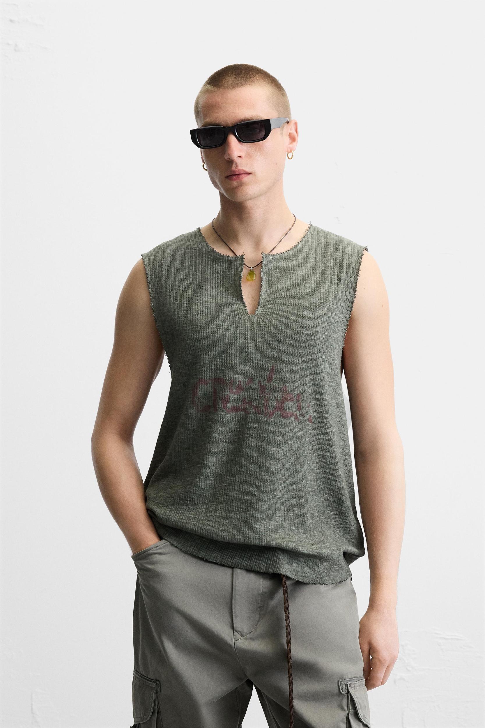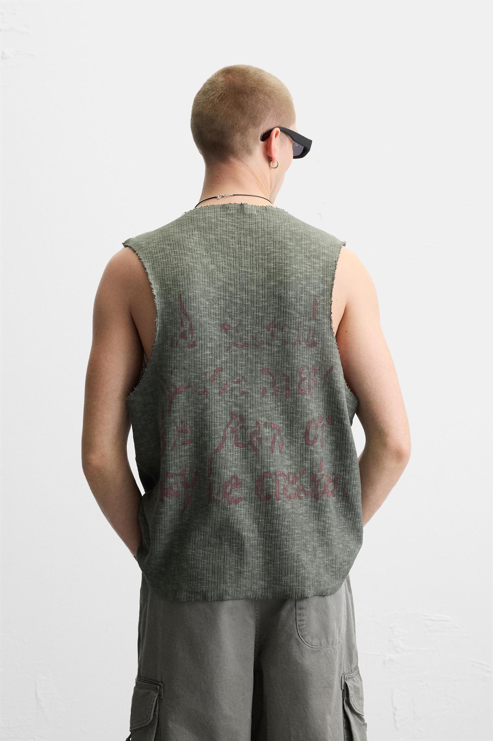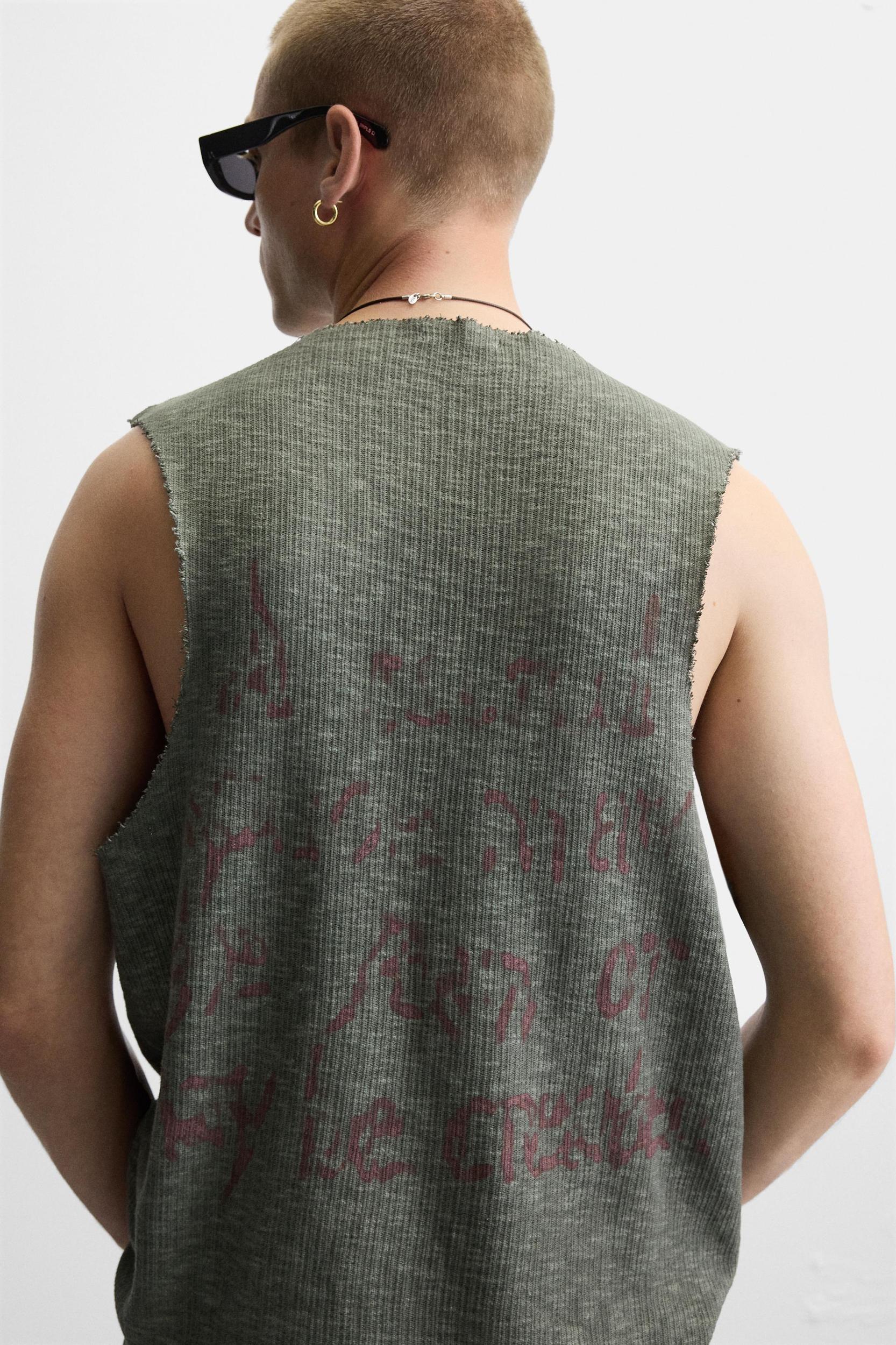 Relaxed fit knit tank top in cotton yarn. Round neck with front opening and sleeveless. Contrasting print combination on front and back. Washed effect. Irregular finishes.