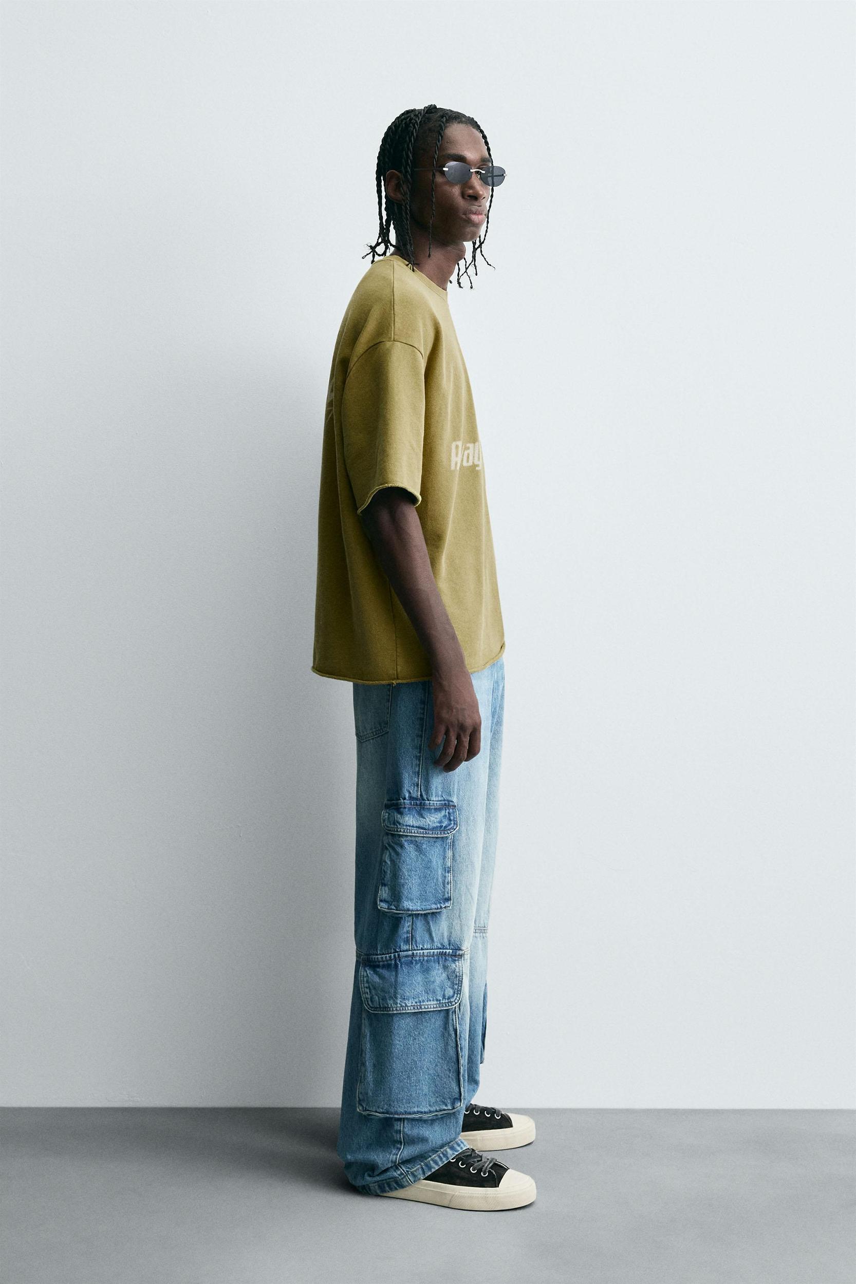 Relaxed fit sweatshirt made of cotton fabric with a looped lining. Round neck and short sleeves. Contrasting printed text on the front. Washed effect. Irregular hem.