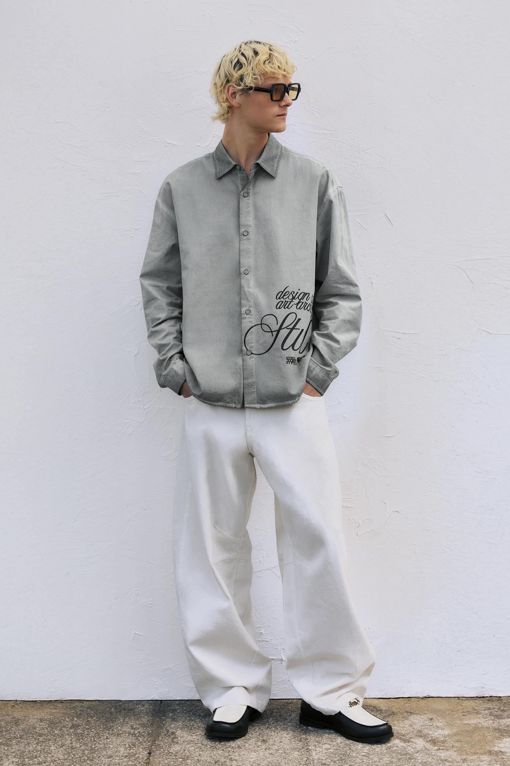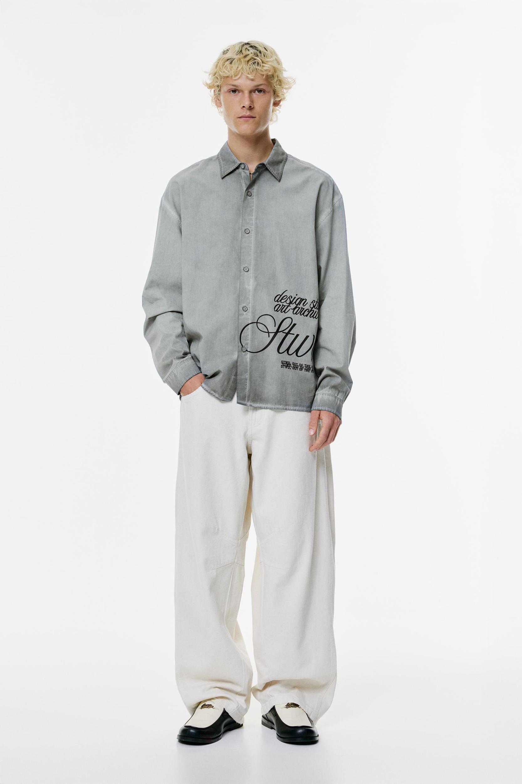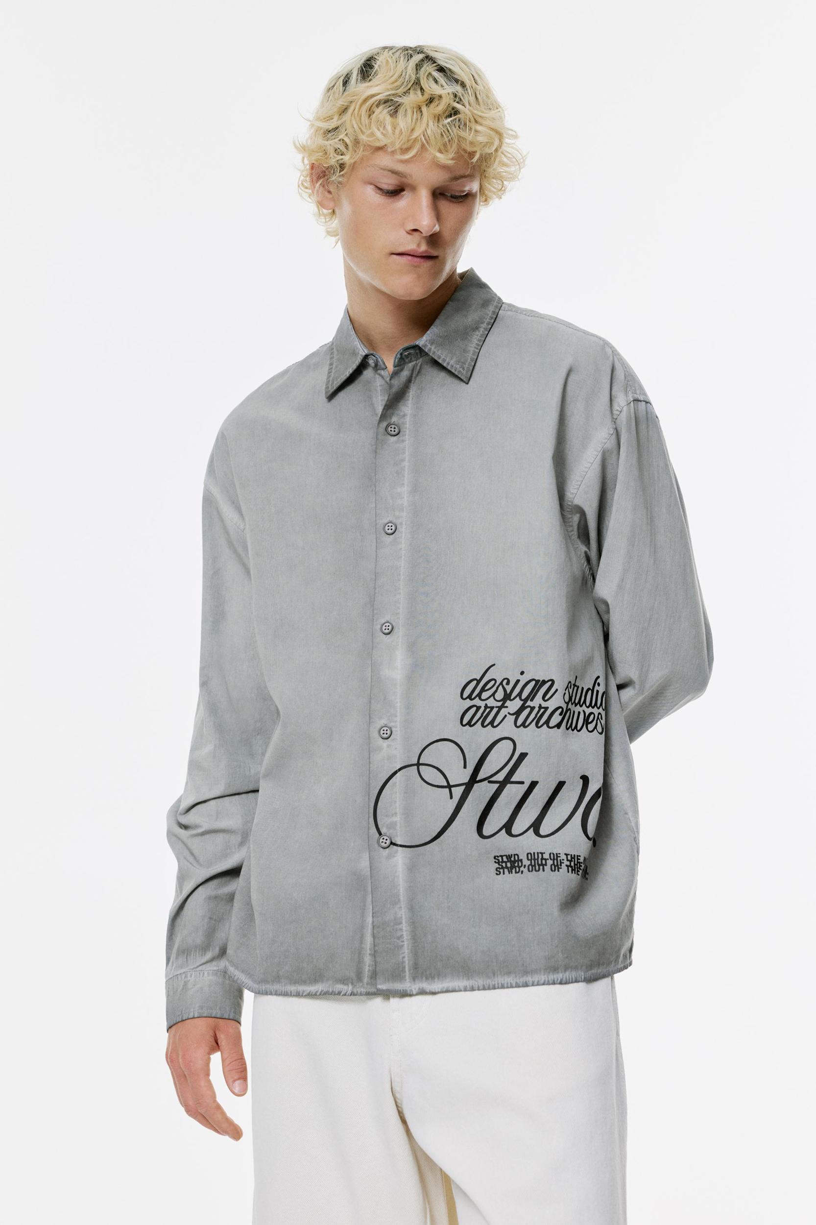 Gray shirt with a washed finish, a contrast STWD graphic, button closure, and made of 100% cotton.