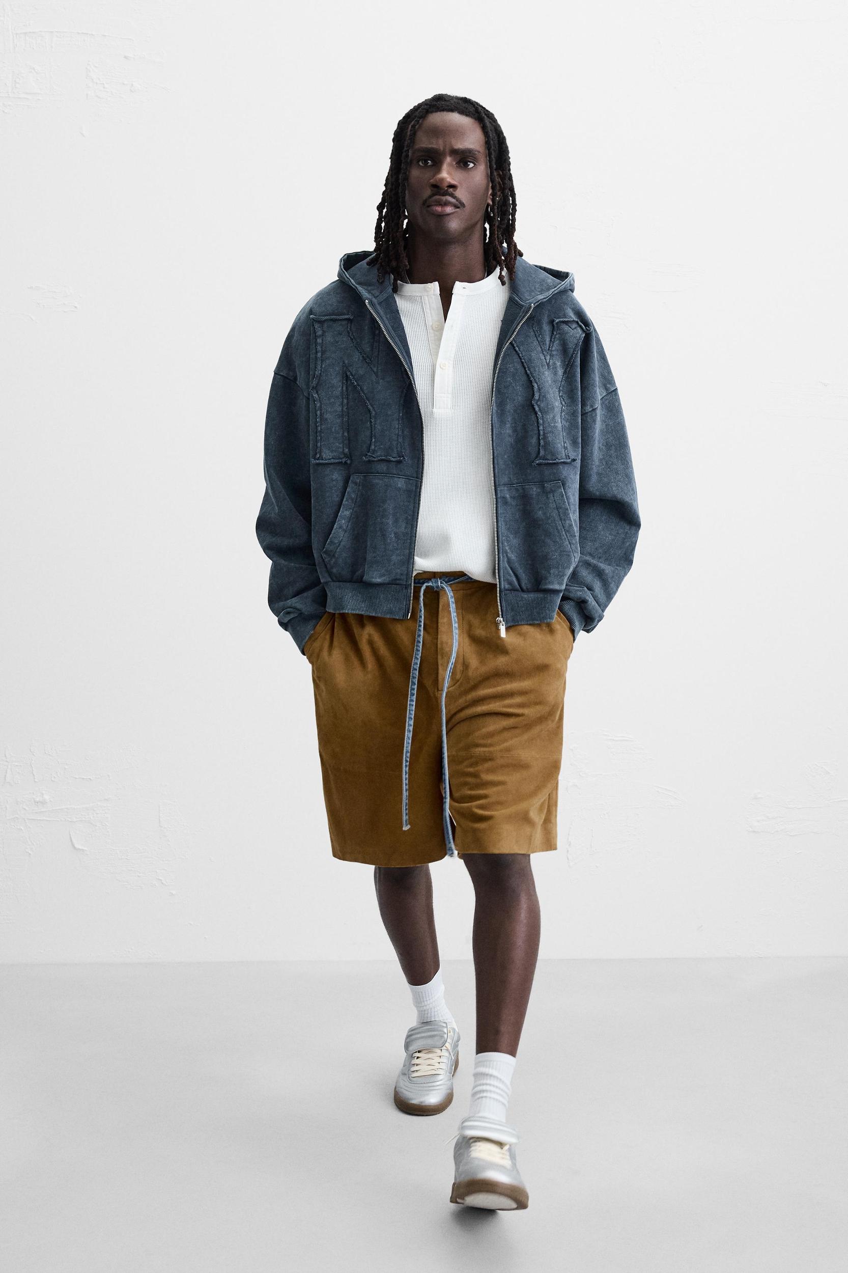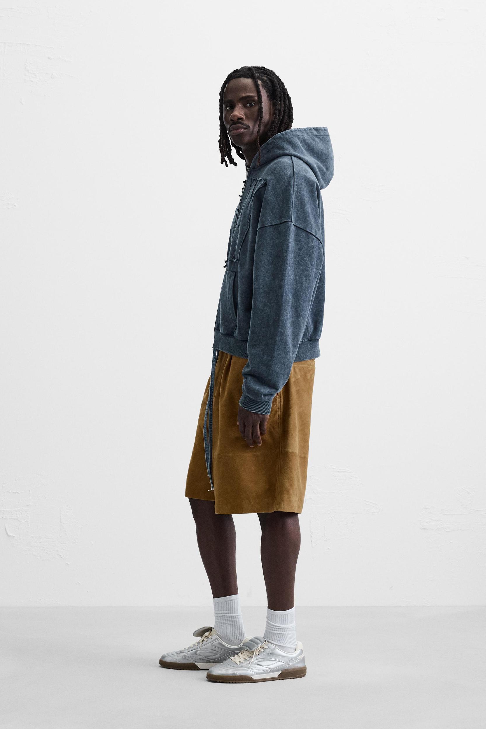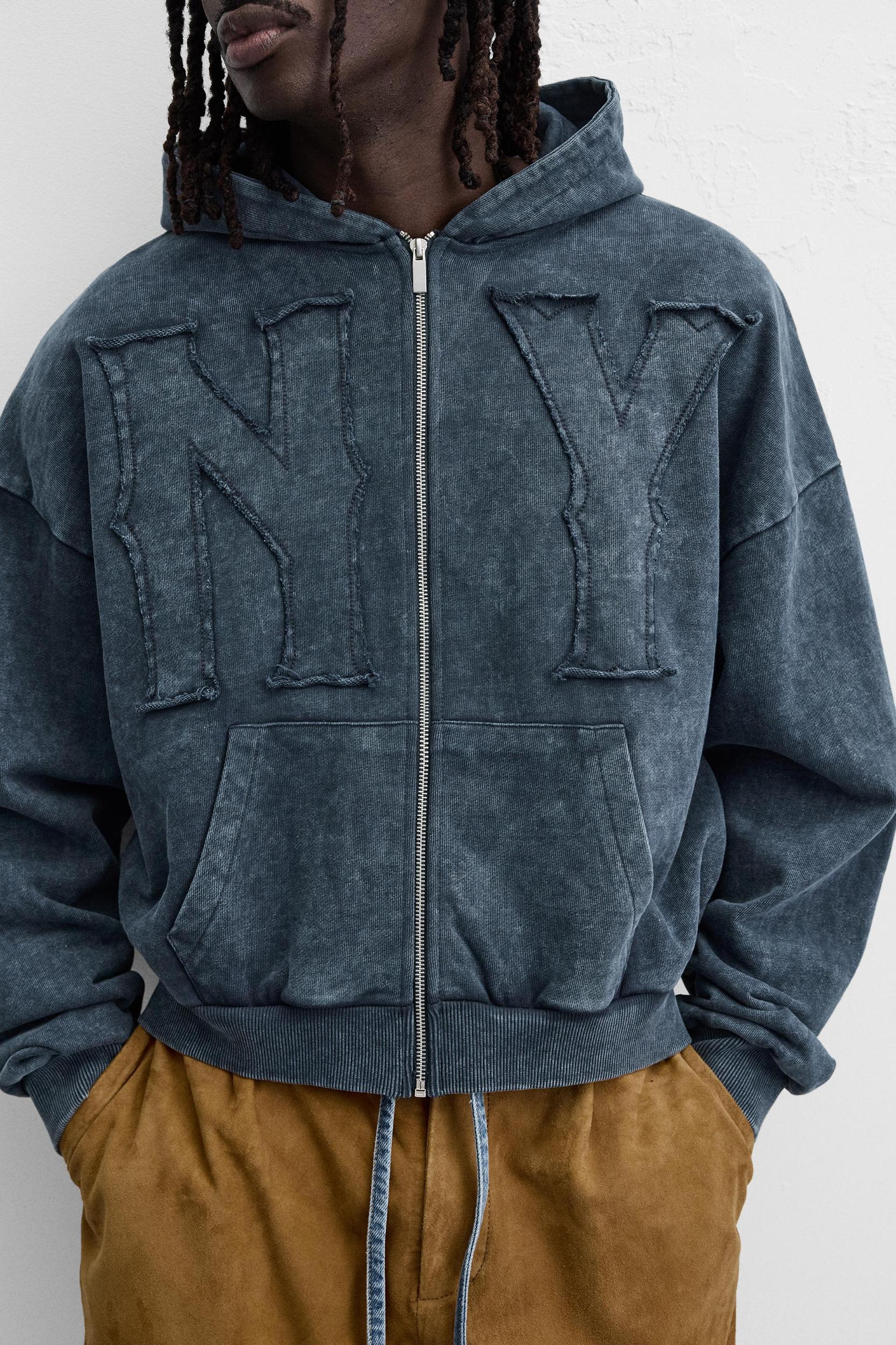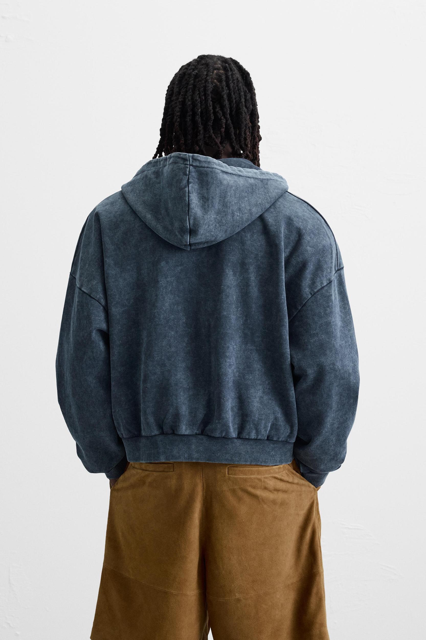 Boxy fit hoodie. Hooded collar and long sleeves. Front kangaroo pocket. Matching patch appliqué at front. Washed effect. Ribbed trim. Front zip closure.