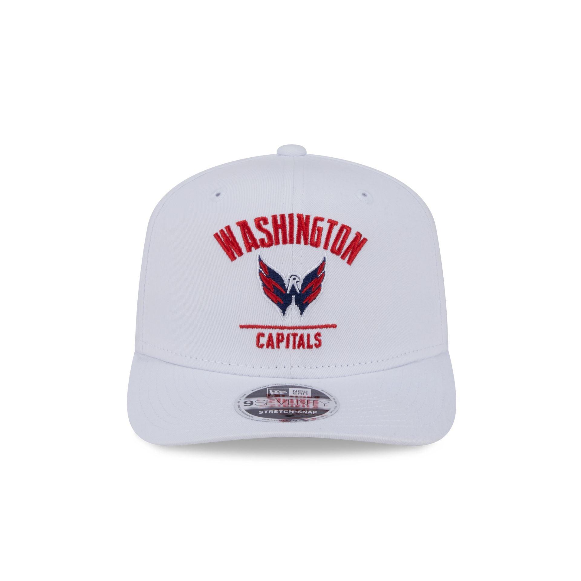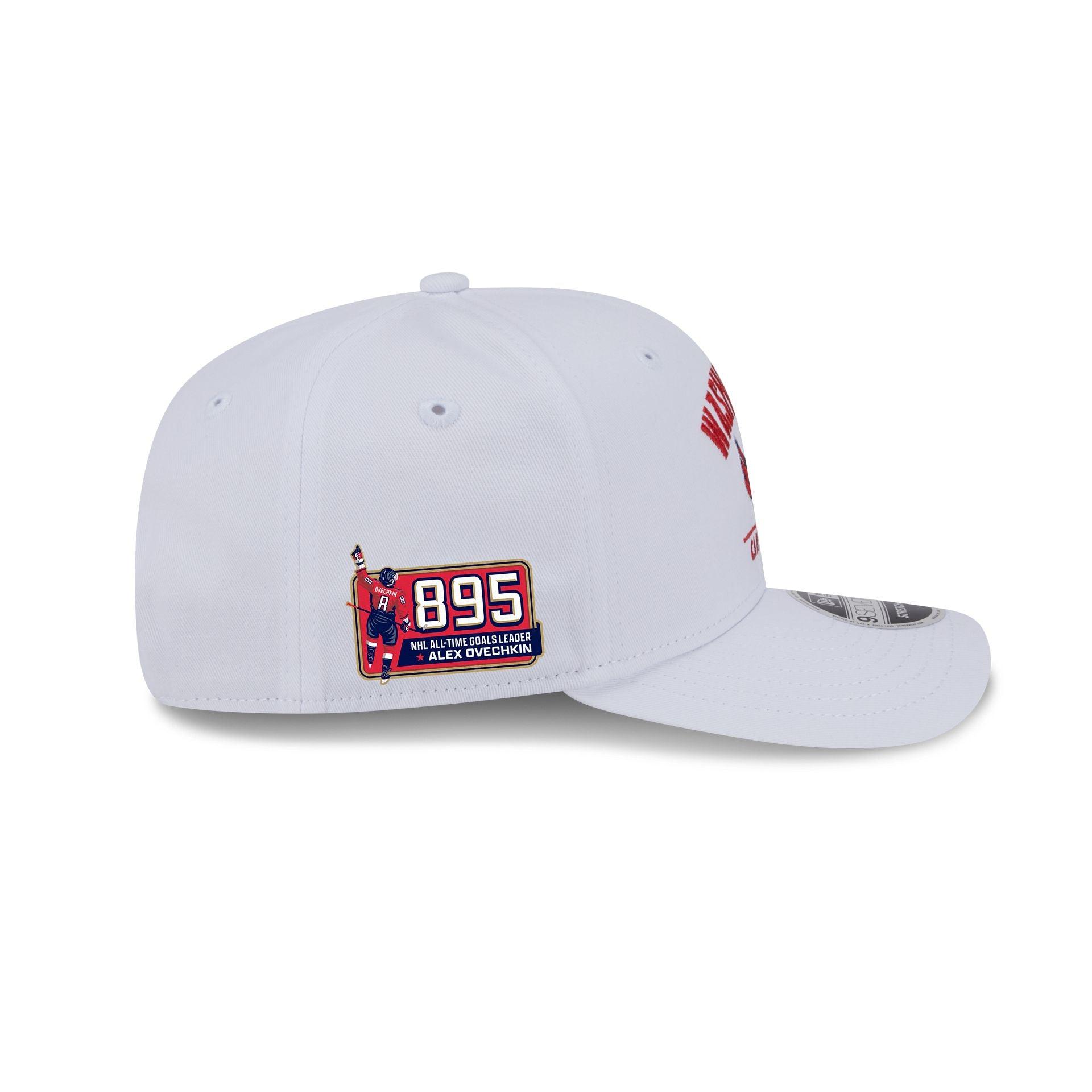 The Washington Capitals Alex Ovechkin Goals Leader White 9SEVENTY Stretch-Snap Cap features an embroidered Capitals logo at the front panels with 895 NHL All-Time Goals Leader Alex Ovechkin patch at the right-wear side and a snapback closure at the rear.
