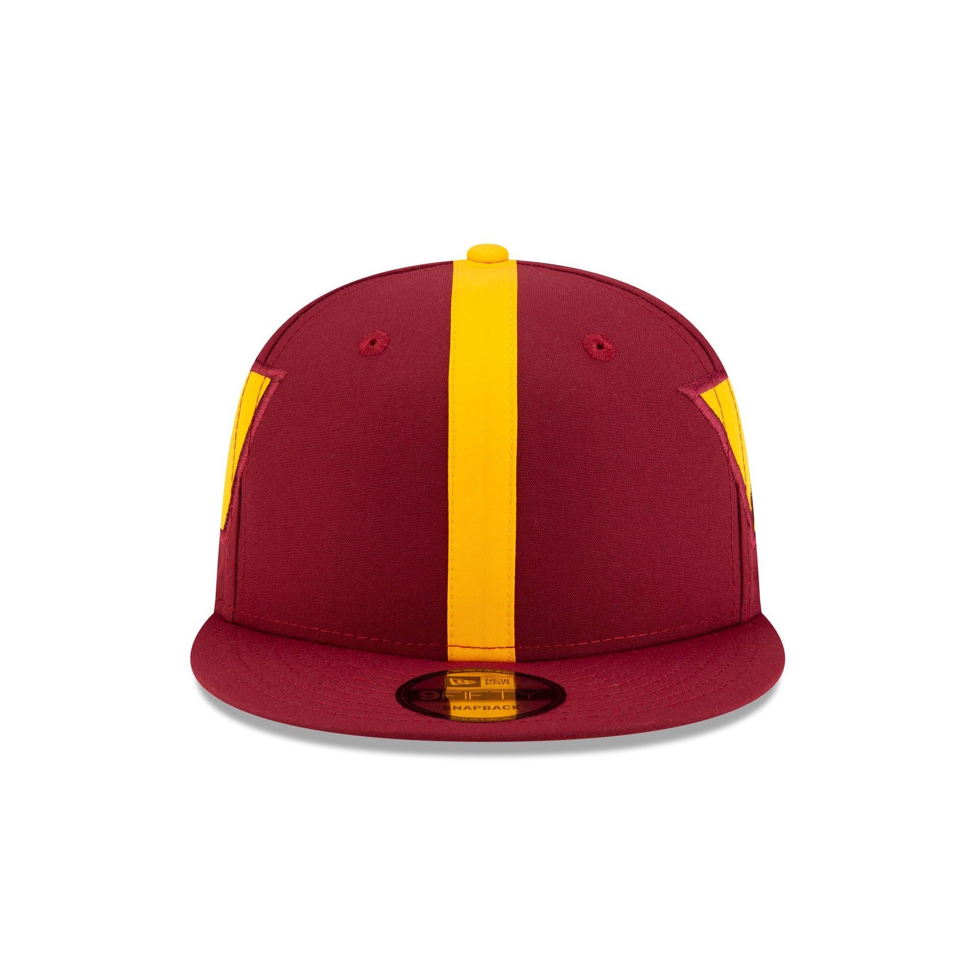 The Washington Commanders Helmet Pack 9FIFTY Snapback features an embroidered fabric applique Commanders replica helmet design at the crown with a matching woven team logo tag at an adjustable snapback closure at the rear and a yellow undervisor.